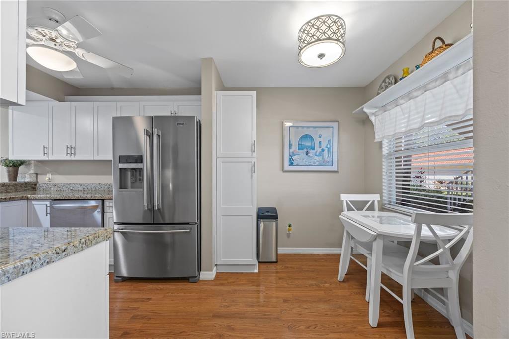 Enjoy a beautiful LAKE VIEW from this TRUE 3 BEDROOM 1ST FLOOR coach home with ATTACHED GARAGE under $340K. This END UNIT allows for abundant natural light and features light bright kitchen cabinets, new stainless steel appliances, laundry tub inside, and upgraded luxury vinyl plank flooring. Sherwood community features REASONABLE HOA FEES which includes cable, WIFI, water, pest control, etc. The amenities include 4 PICKLEBALL COURTS, tennis, community pools, exercise room and more. Perfect for seasonal or year-round living. Location, Location: 5 minutes to shopping , restaurants and all of your conveniences. Just a short drive to Naples’ sandy beaches, and the 5th Avenue/3rd Street dining and shopping districts.