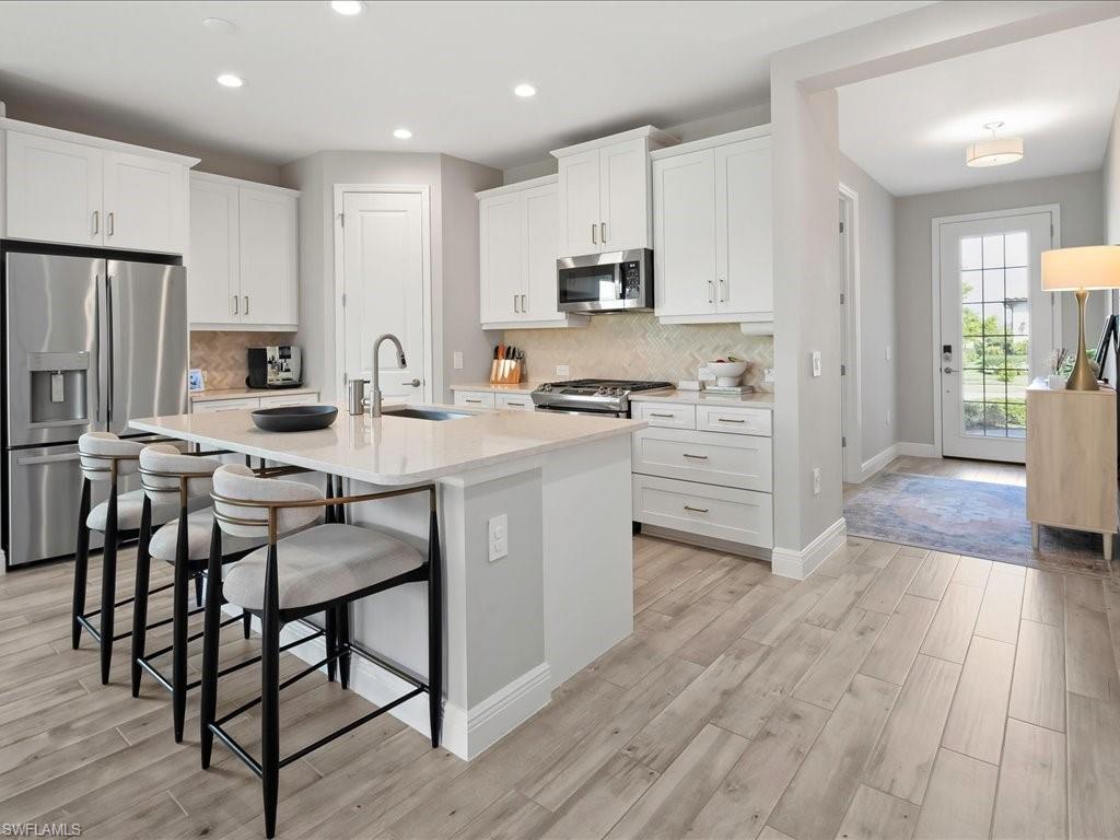Welcome to a beautifully upgraded home in the scenic SkySail community, where lakeside living blends seamlessly with refined design. Nestled among 246 acres of sparkling lakes and lush landscaping, this home combines comfort, style, and functionality, complemented by amenities that encourage relaxation, wellness, and an active lifestyle. From the moment you arrive, the home’s thoughtful details are evident. A multi-lite impact glass entry door opens to an inviting, light-filled layout. The great room and primary suite feature elegant single-step coffered ceilings that add architectural character, while a pocket sliding glass door connects the indoors to a spacious covered lanai—ideal for both quiet mornings and evening gatherings. Just beyond, a large, spacious backyard offers ample space for outdoor entertaining and is perfectly suited for adding a pool. The kitchen is designed for both beauty and performance. Upgraded cabinetry with crown molding, pot-and-pan drawers, and a matching island provide style and function. Quartz countertops are paired with a herringbone-pattern backsplash, stainless steel appliances including a gas range, and a Moen Genta faucet with stainless undermount sink. Nearby, the utility room offers extra convenience with a cabinet, Corian countertop, and a deep laundry sink. Both the primary and guest baths reflect a spa-like elegance with upgraded cabinetry, quartz countertops, brushed nickel fixtures, oversized wall tiles, decorative accents, and custom shower niches. The primary bath features a walk-in shower with accent tile and upgraded lighting, while the guest bath offers equally refined finishes. Throughout the main living areas, wood-look tile provides warmth and durability, while bedrooms feature plush patterned carpet with upgraded padding. Impact-resistant windows ensure peace of mind, and the home includes upgraded lighting, ceiling fan prewires, and a versatile den with double doors. The garage is extended by two feet and includes a Liftmaster opener, keyless entry, and a speckled floor finish. Life in SkySail offers far more than just a beautiful home. Residents enjoy two resort-style pools, a lap pool, and a relaxing spa. The lakehouse and wellness center provide gathering and fitness spaces, while eight pickleball courts, two tennis courts, and outdoor gaming areas offer plenty of recreation. A three-mile perimeter trail winds through the neighborhood, perfect for walking or biking, and the fishing pier and kayak launch make it easy to enjoy the water. The community also features dog parks, playgrounds, and expansive event lawns, ensuring there’s always something to do close to home.