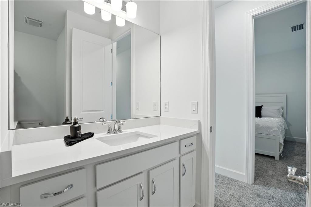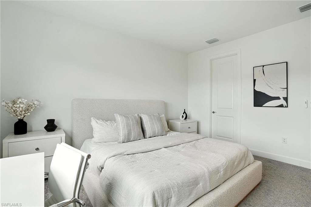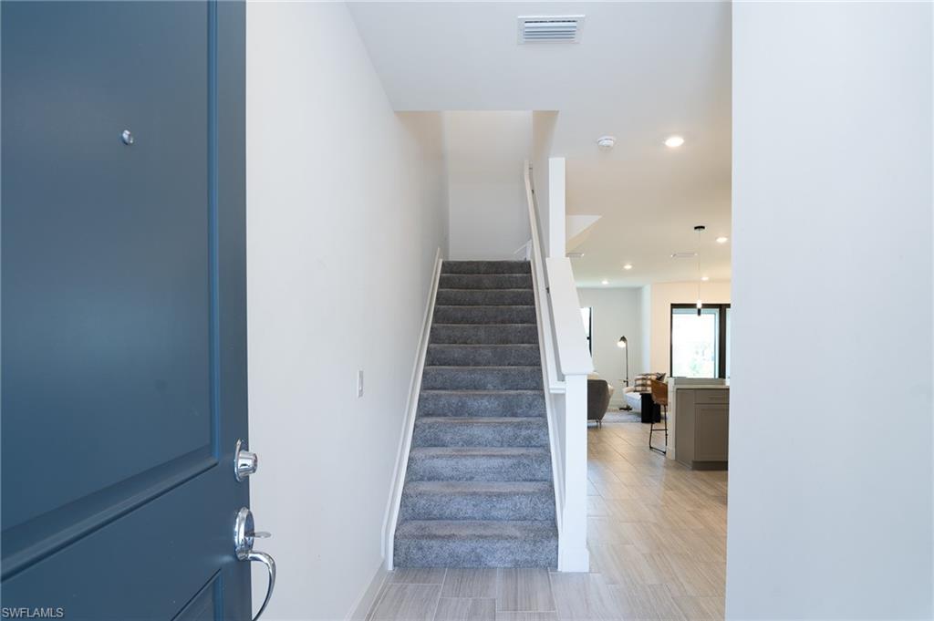 Located directly within the gates to this North Naples community, this corner-end unit home is located perfectly. It's only a short walk to the community pool, cabanas, and mail boxes. This home offers a spacious open floor plan, with a large eat-in kitchen. The kitchen is equipped with stainless steel Whirlpool appliances, white cabinetry, and a stunning quartz countertop. The cabinetry provides a ton of storage, along with a full pantry closet. Upstairs, the master bedroom provides two large walk in closets, an on-suite, double vanity, walk in shower, and a private toilet. Two additional bedrooms allow for more even more space, and an additional walk in closet. There is also a laundry space, equipped with a countertop and sink. This community is located close to many great restaurants and beaches!