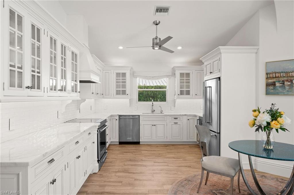 Centrally located in the City of Naples and minutes to historic 5th Avenue !This fully fenced spacious 3 bed and 3 bath residence was completely rebuilt and remastered in 2005. The open great room plan with soaring ceilings and custom kitchen cabinetry is every entertainer's delight. Kitchen equipped with high-end appliances, wine cooler, wine rack, and built-in reverse osmosis. Water softening system throughout the house .Elegant touches in every part of the entire home: Legrand system, custom window coverings, Robb & Stucky custom furniture, ample storage w/custom closets in all bedrooms: built-ins and epoxy floor in the air-conditioned garage. A retractable insect screen installed over the garage door keeps the space impenetrable to the critters. Property is located in the X -flood zone