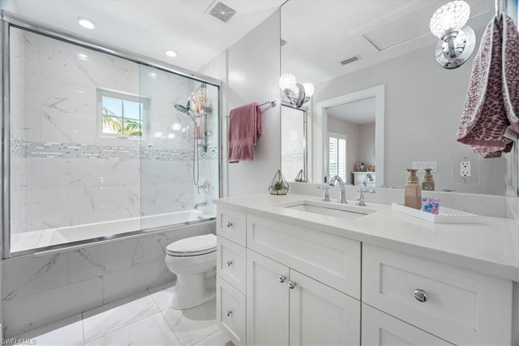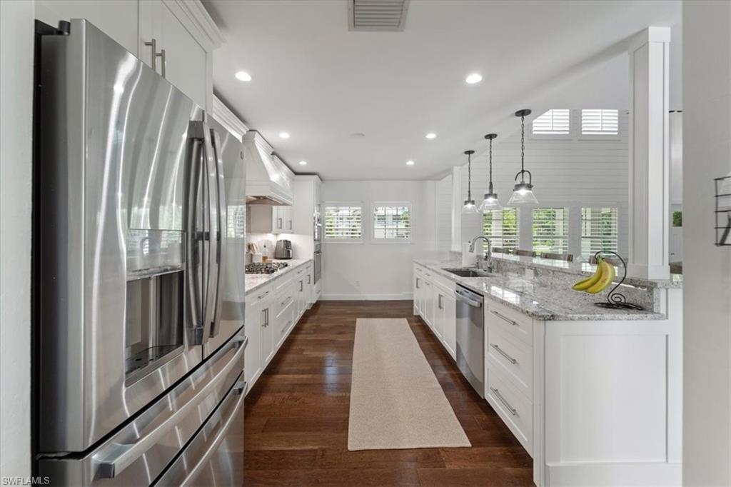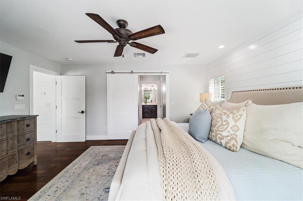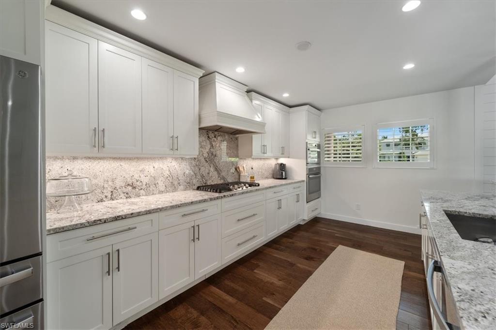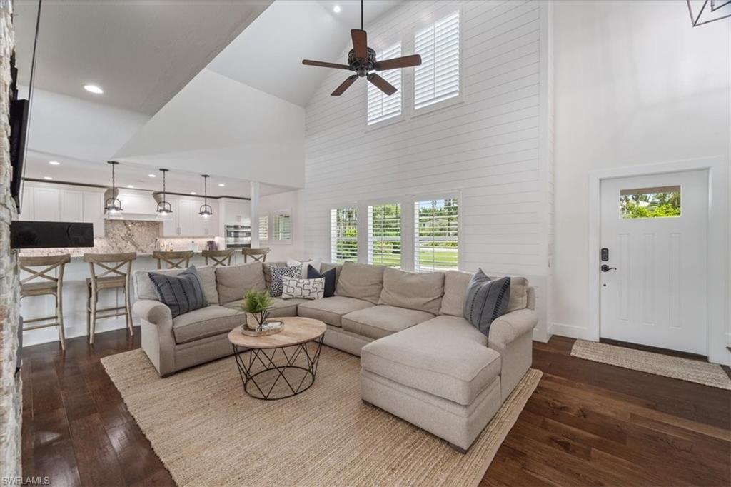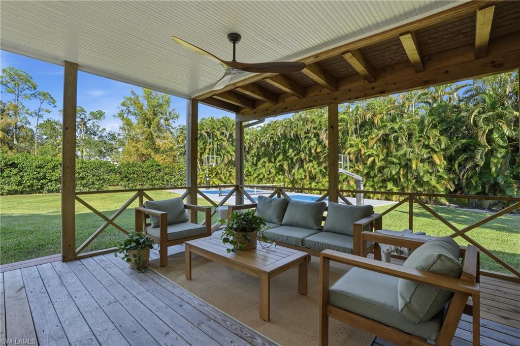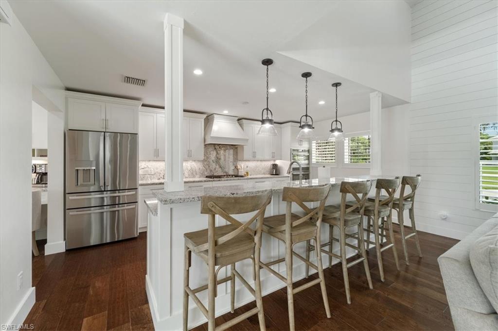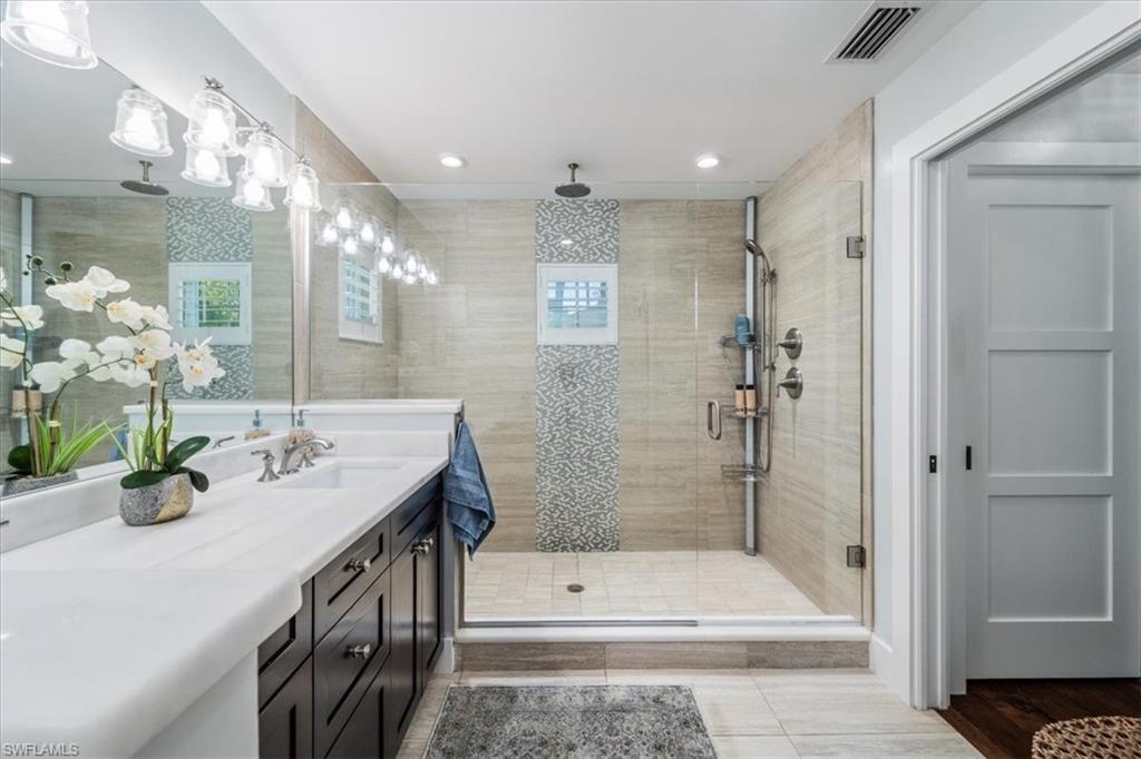 Beautifully renovated and set on an oversized 0.52-acre cul-de-sac lot with your very own private pickleball/basketball court, this fully furnished two-story estate blends high-end finishes, generous indoor-outdoor living, and an unbeatable central location. Inside, the open layout is filled with natural light and anchored by a coastal-inspired kitchen with teal shaker cabinetry, brass hardware, white quartz countertops, a farmhouse sink, and a rustic center island. Wide-plank, white oak floors flow throughout the living and dining areas, creating a warm, cohesive feel. The flexible floor plan includes two primary suites—one on each level. The first-floor suite offers a private exterior entrance ideal for guests or multigenerational living, while the upstairs suite enjoys a seating area and a balcony overlooking the peaceful, tropical yard. Outdoor living is a major highlight, with a full-length covered back porch, multiple seating and dining zones, and a hot tub overlooking the expansive backyard retreat. With its rare combination of privacy, location, and turnkey readiness, this home offers an exceptional lifestyle in one of Naples’ most coveted neighborhoods.