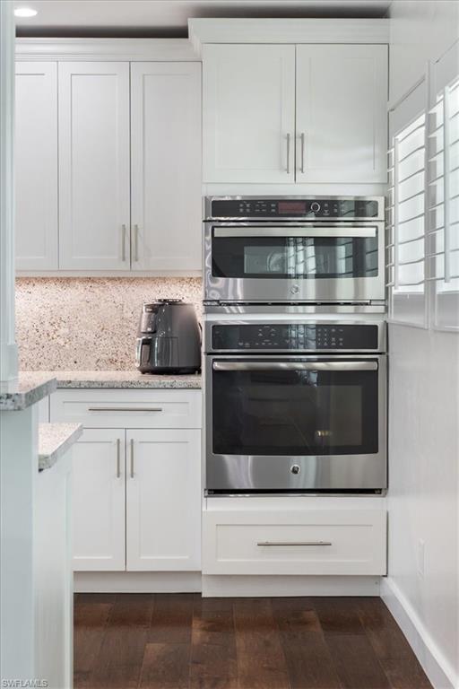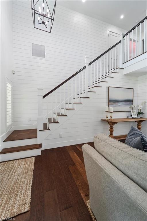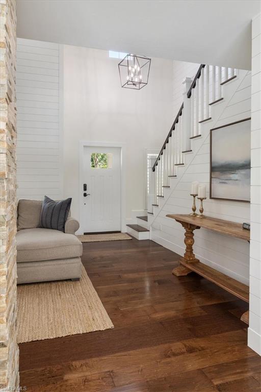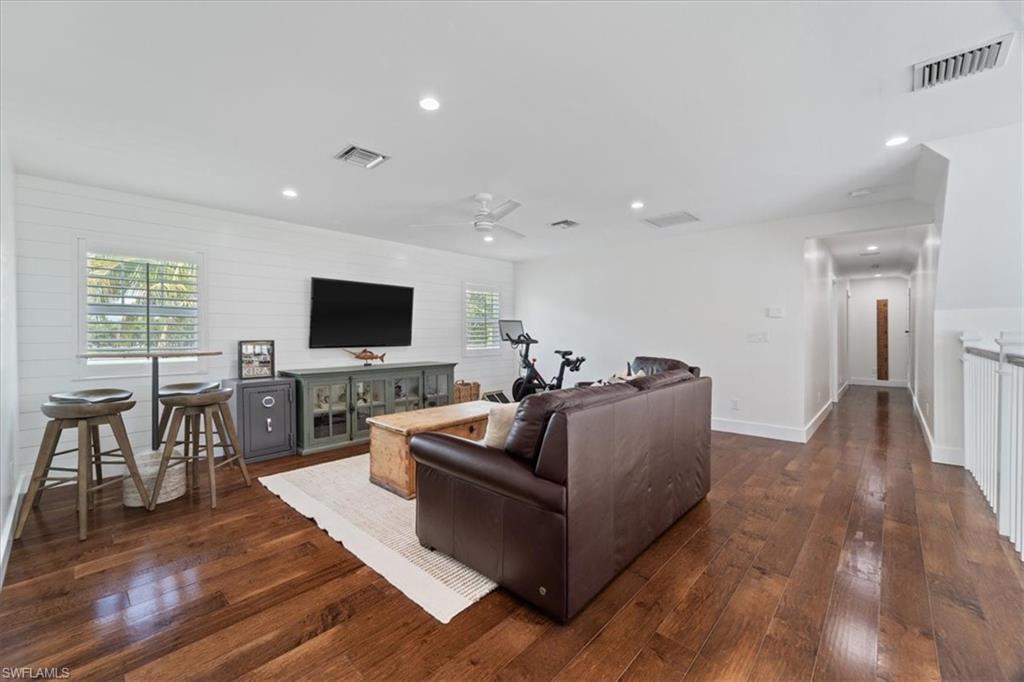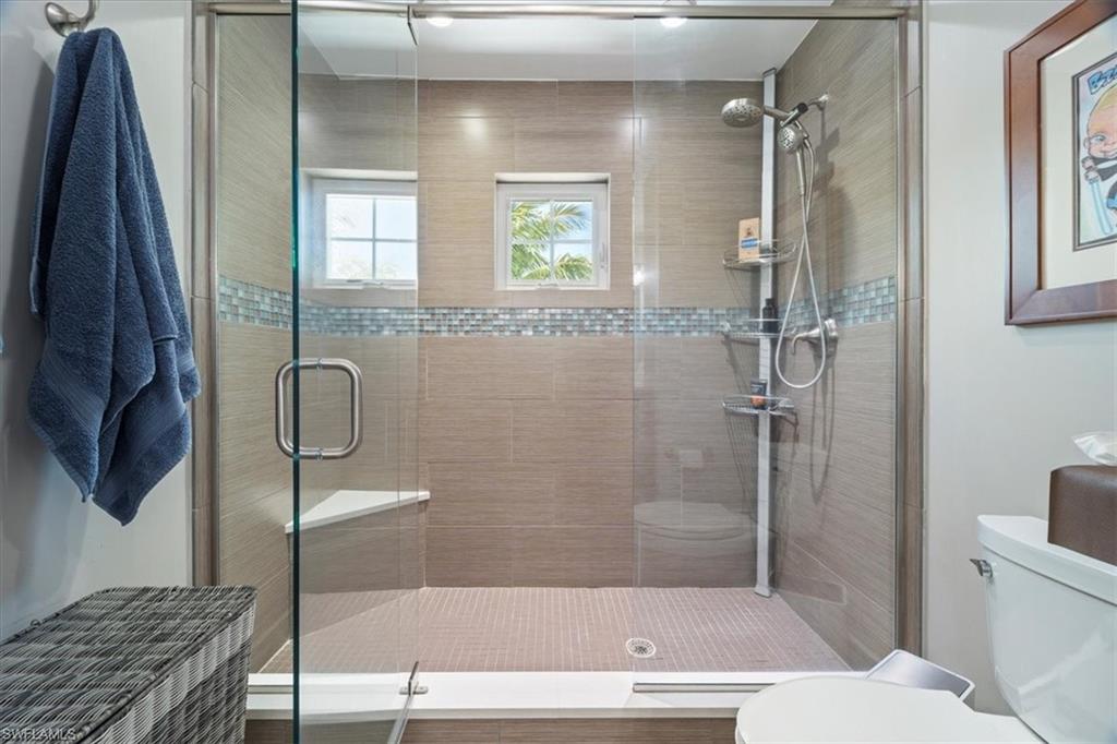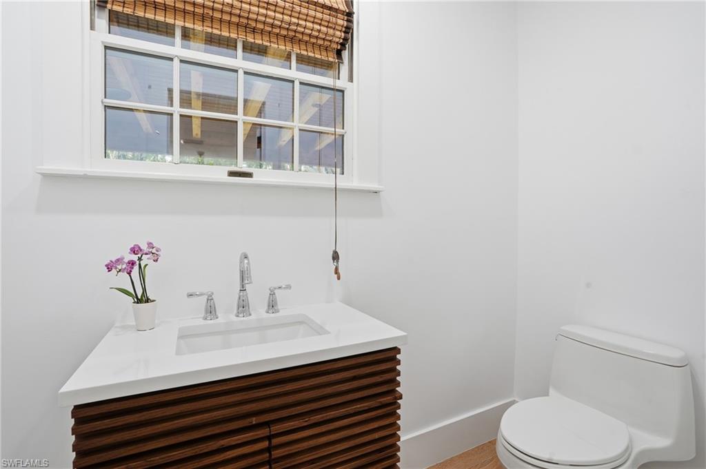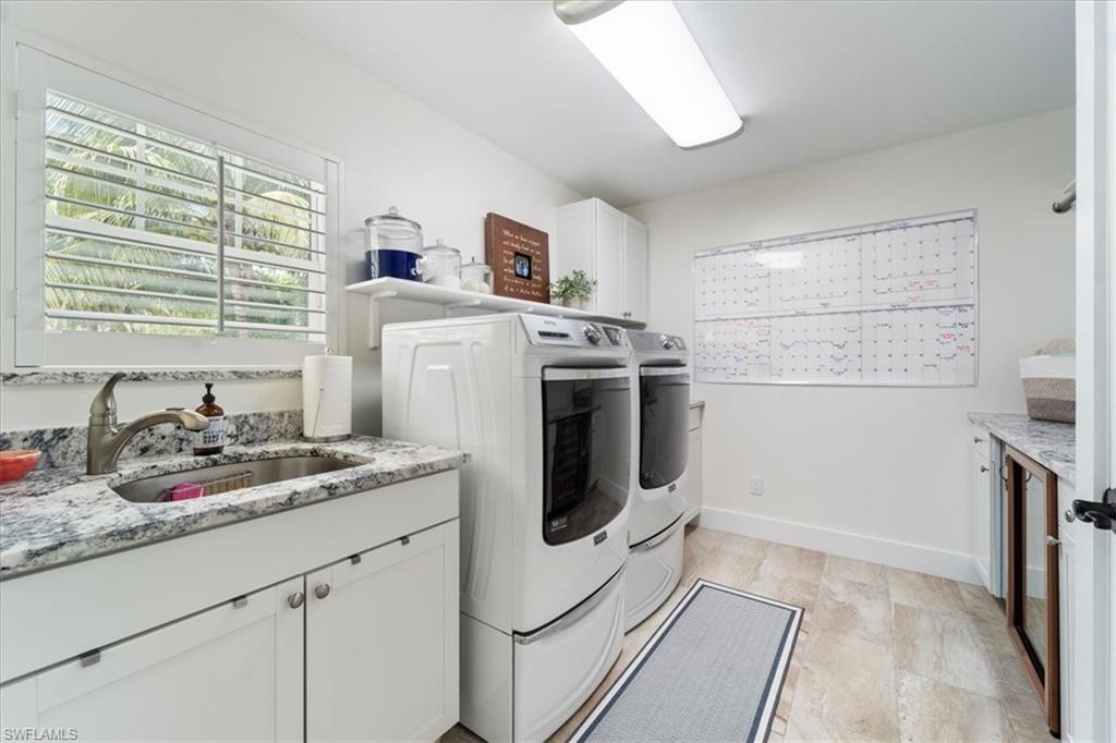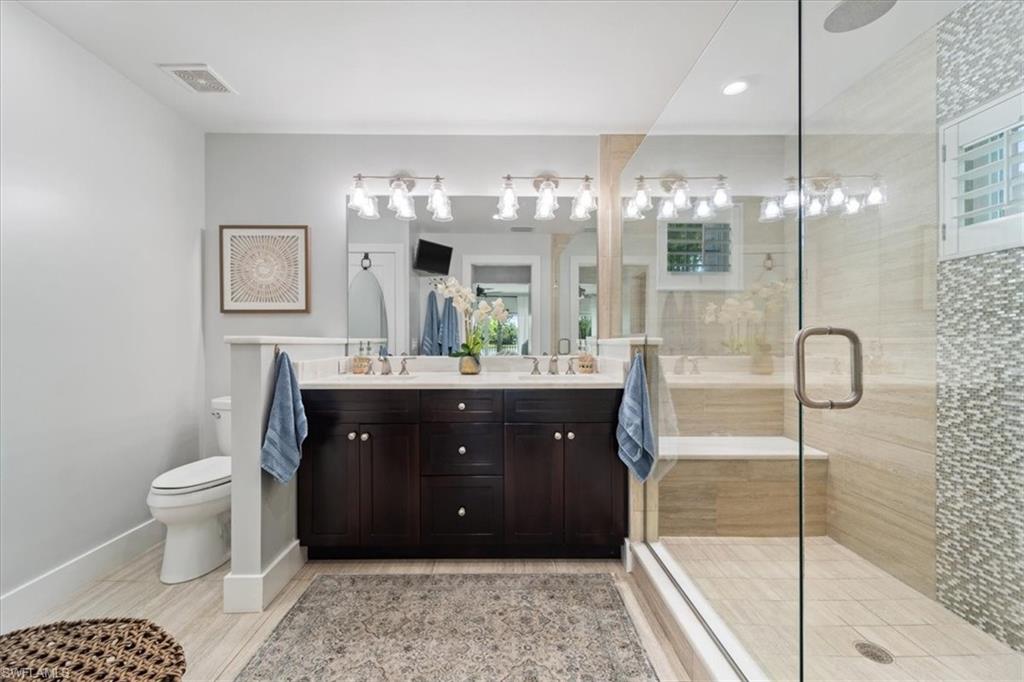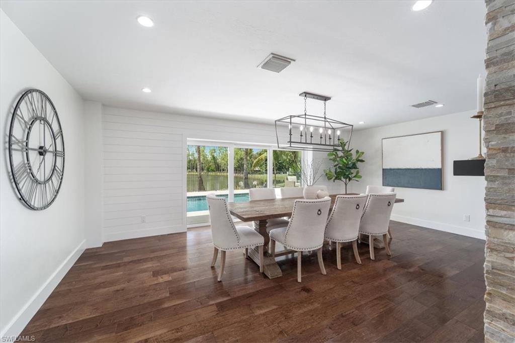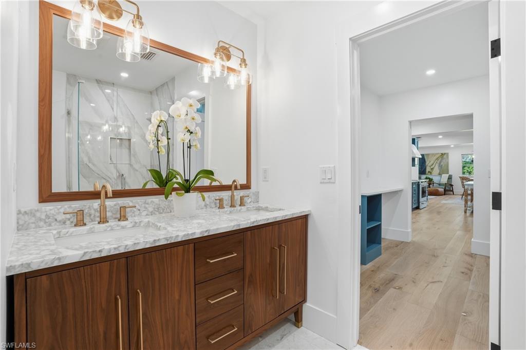 Beautifully renovated and set on an oversized 0.52-acre cul-de-sac lot with your very own private pickleball/basketball court, this fully furnished two-story estate blends high-end finishes, generous indoor-outdoor living, and an unbeatable central location. Inside, the open layout is filled with natural light and anchored by a coastal-inspired kitchen with teal shaker cabinetry, brass hardware, white quartz countertops, a farmhouse sink, and a rustic center island. Wide-plank, white oak floors flow throughout the living and dining areas, creating a warm, cohesive feel. The flexible floor plan includes two primary suites—one on each level. The first-floor suite offers a private exterior entrance ideal for guests or multigenerational living, while the upstairs suite enjoys a seating area and a balcony overlooking the peaceful, tropical yard. Outdoor living is a major highlight, with a full-length covered back porch, multiple seating and dining zones, and a hot tub overlooking the expansive backyard retreat. With its rare combination of privacy, location, and turnkey readiness, this home offers an exceptional lifestyle in one of Naples’ most coveted neighborhoods.