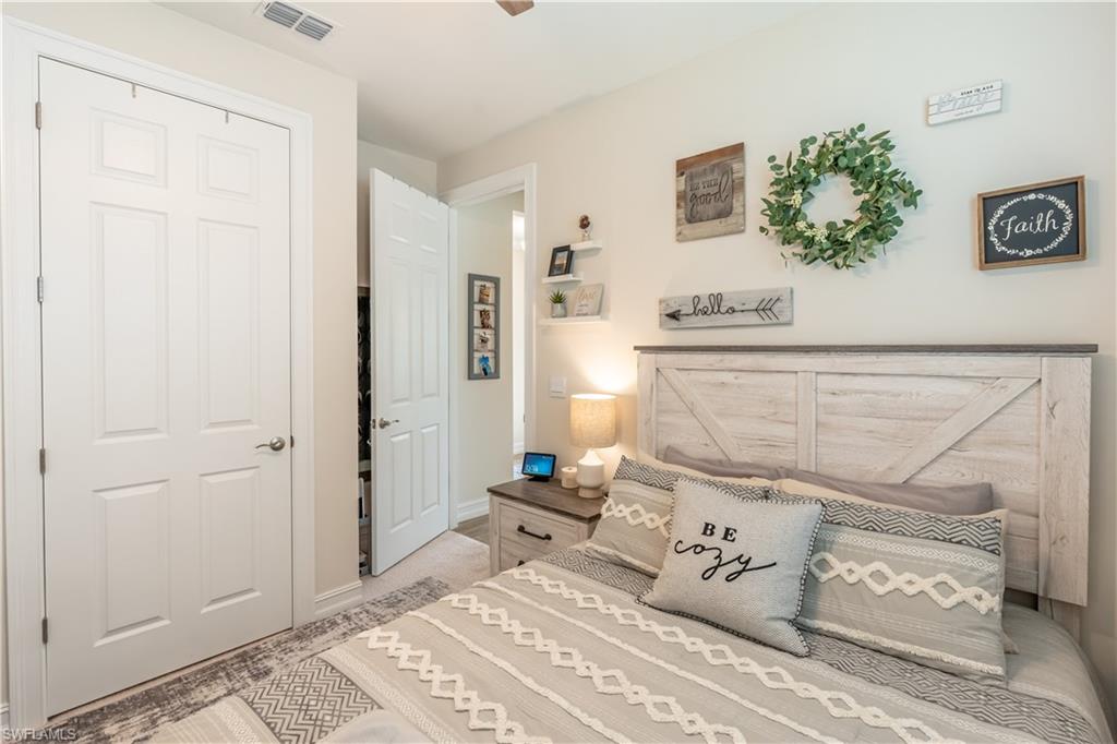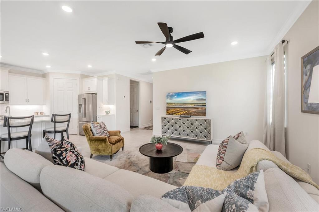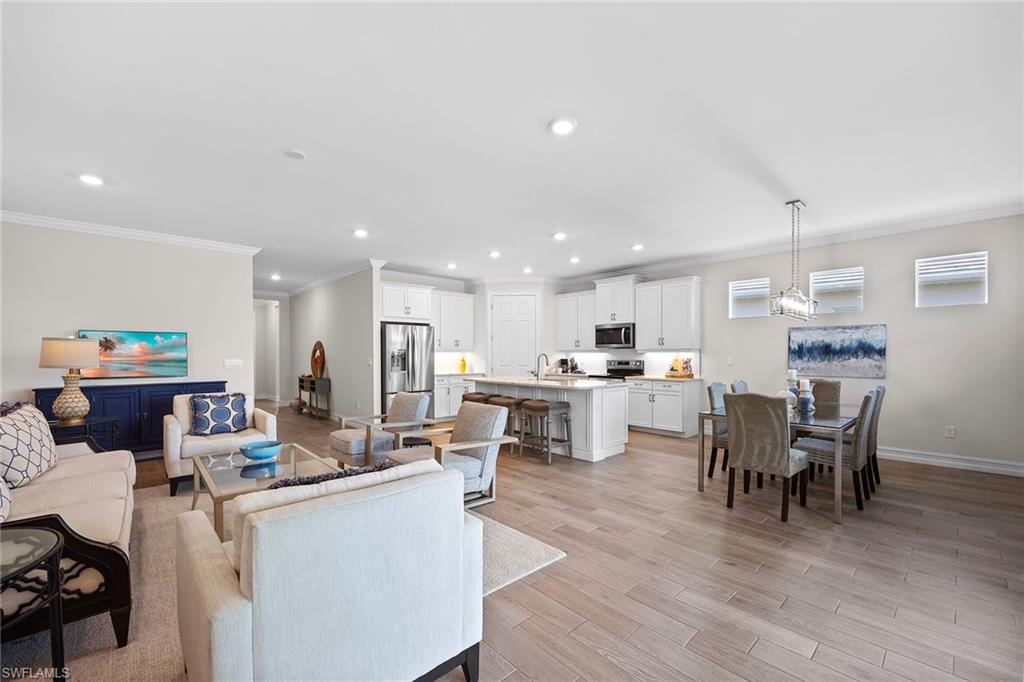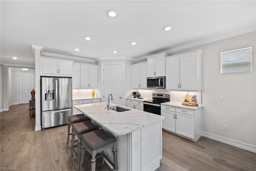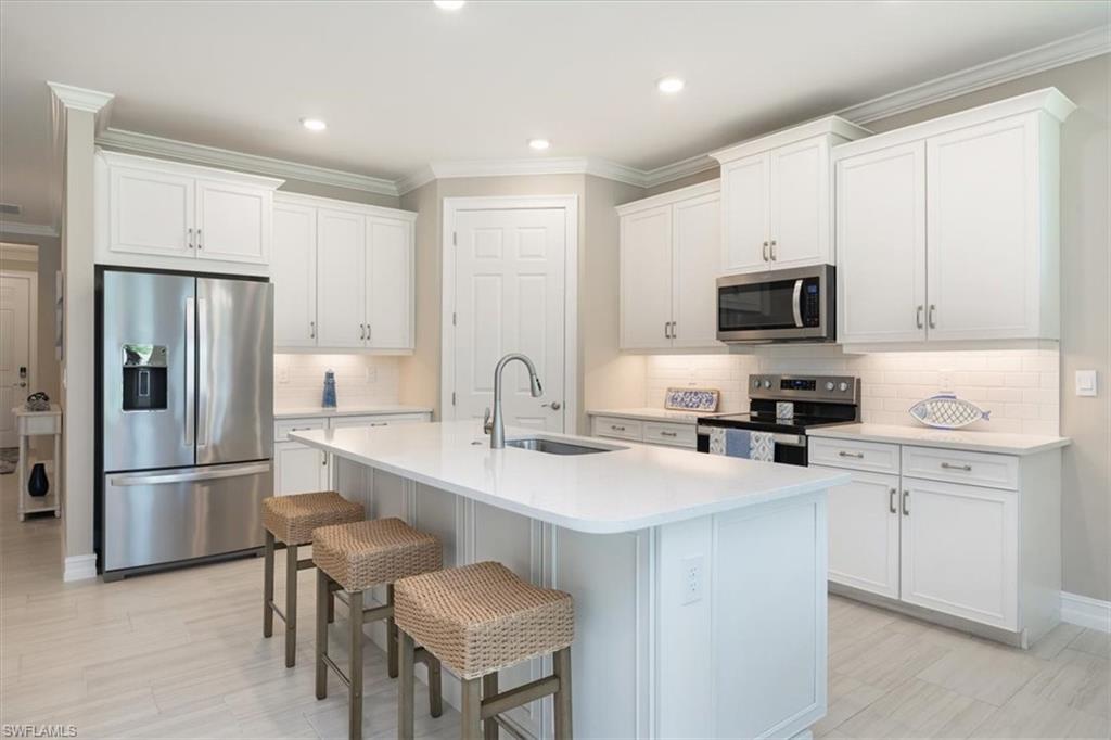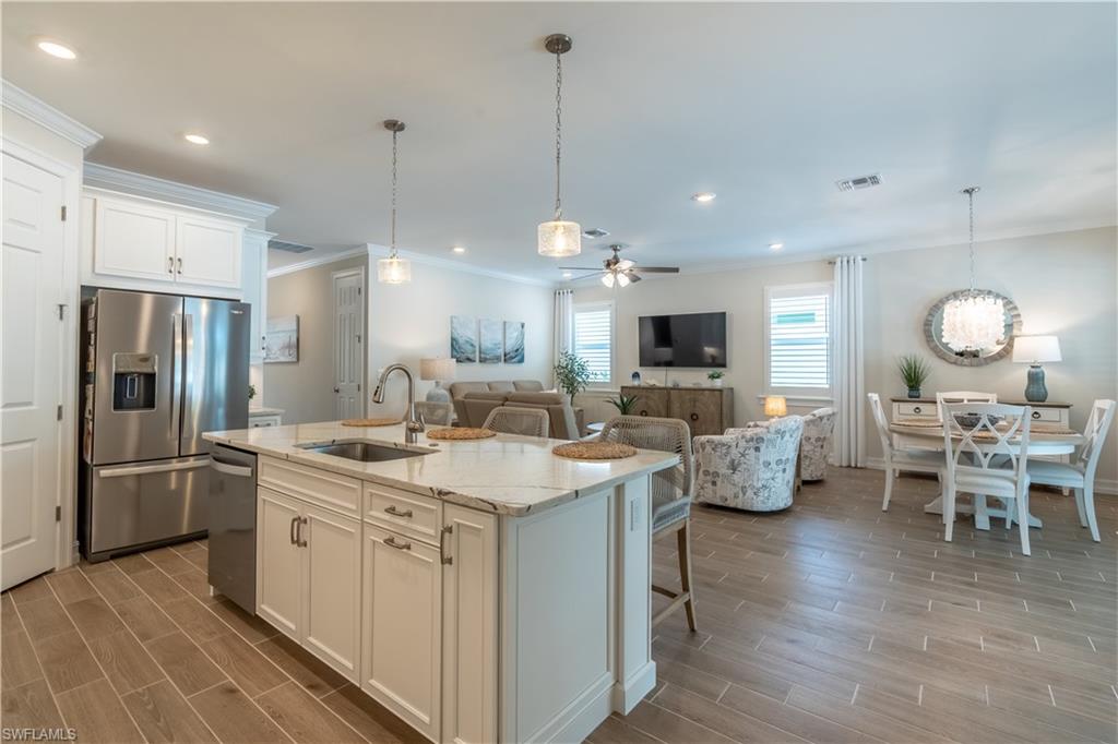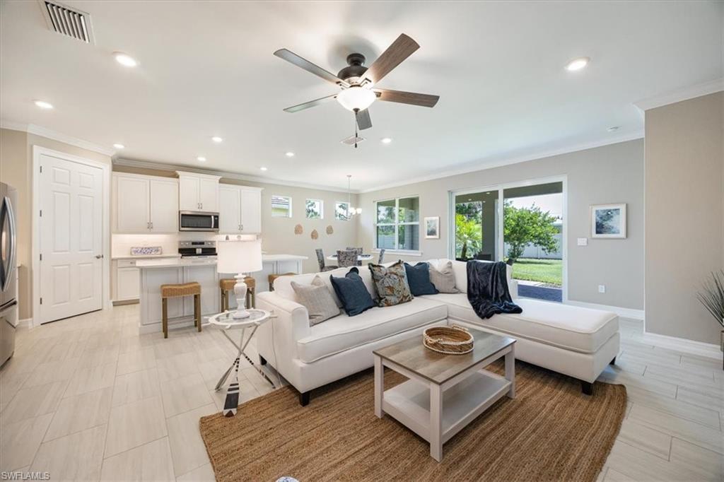 Oversized lot and fenced in backyard! This brand-new, move in ready 2024 designer home boasts 4 bedrooms, 2 baths offering a sophisticated blend of high-end finishes and modern elegance throughout. Below market financing available, see remarks. The light and bright open floor plan is adorned with chic designer furnishings, board and batten carpentry accents, and exquisite lighting fixtures throughout. The spacious kitchen is a showstopper, featuring an expansive quartz island, Whirlpool appliance suite, a walk-in pantry, and upgraded faucets and hardware. For optimal privacy, the primary suite is tucked away in its own serene retreat, complete with a spa-like ensuite bath featuring dual vanities, a walk-in shower, and refined finishes. Meanwhile, the guest bedrooms are thoughtfully positioned in their own wing, offering a private sanctuary for family and visitors. The fourth bedroom serves as a versatile space, perfect for a home office, media room, or additional guest accommodations. Beyond your stunning interior, this home is part of a vibrant community where you can indulge in resort-style amenities, including a clubhouse with a Social & Game Room, a state-of-the-art fitness center, a sparkling pool with lap lanes, and pickleball & bocce courts. Perfectly situated just minutes from shopping, dining, and the sun-drenched Gulf beaches of downtown Olde Naples and Marco Island, this is truly Naples living at its finest.