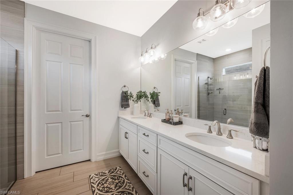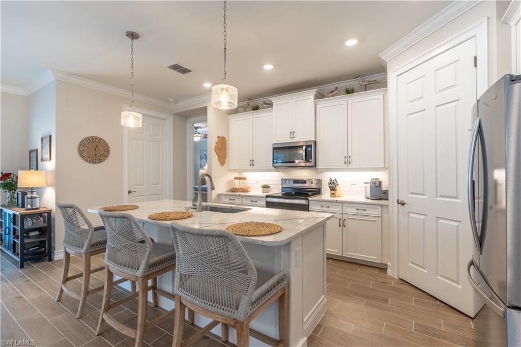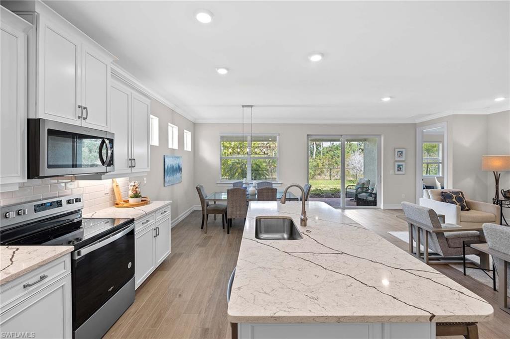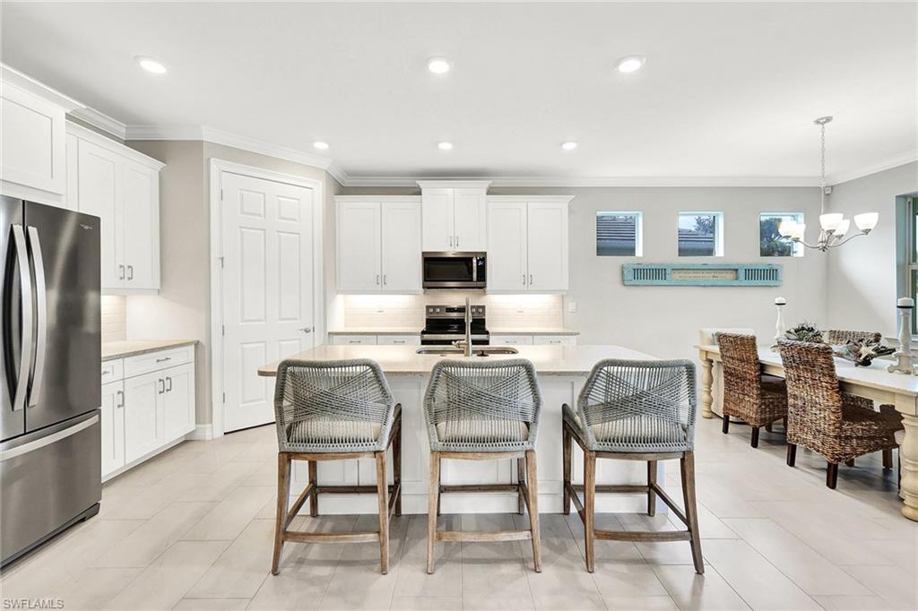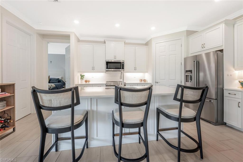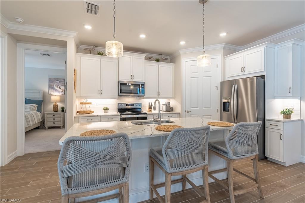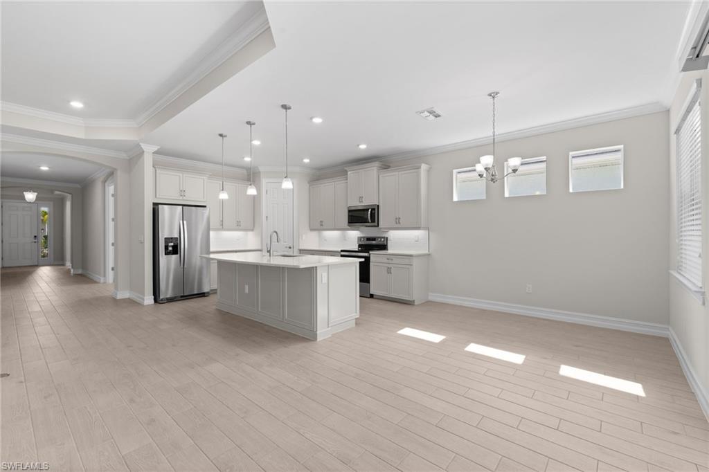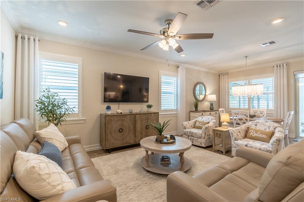 Oversized lot and fenced in backyard! This brand-new, move in ready 2024 designer home boasts 4 bedrooms, 2 baths offering a sophisticated blend of high-end finishes and modern elegance throughout. Below market financing available, see remarks. The light and bright open floor plan is adorned with chic designer furnishings, board and batten carpentry accents, and exquisite lighting fixtures throughout. The spacious kitchen is a showstopper, featuring an expansive quartz island, Whirlpool appliance suite, a walk-in pantry, and upgraded faucets and hardware. For optimal privacy, the primary suite is tucked away in its own serene retreat, complete with a spa-like ensuite bath featuring dual vanities, a walk-in shower, and refined finishes. Meanwhile, the guest bedrooms are thoughtfully positioned in their own wing, offering a private sanctuary for family and visitors. The fourth bedroom serves as a versatile space, perfect for a home office, media room, or additional guest accommodations. Beyond your stunning interior, this home is part of a vibrant community where you can indulge in resort-style amenities, including a clubhouse with a Social & Game Room, a state-of-the-art fitness center, a sparkling pool with lap lanes, and pickleball & bocce courts. Perfectly situated just minutes from shopping, dining, and the sun-drenched Gulf beaches of downtown Olde Naples and Marco Island, this is truly Naples living at its finest.