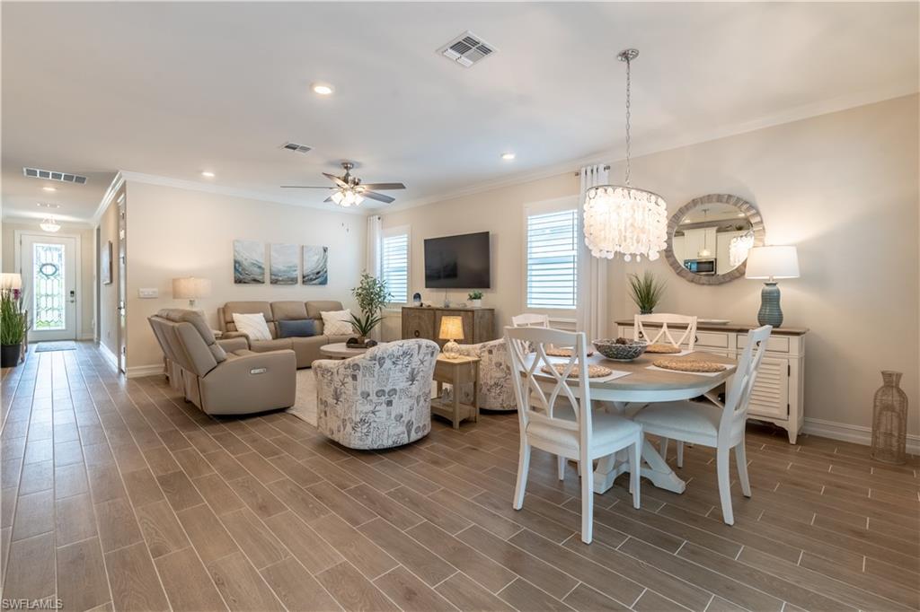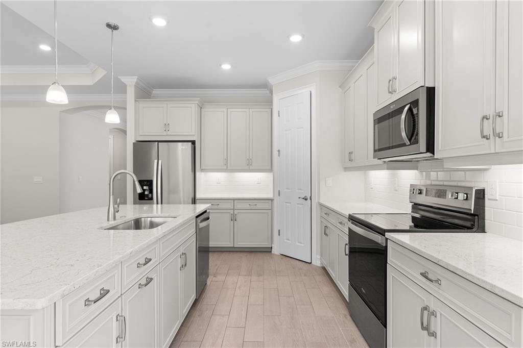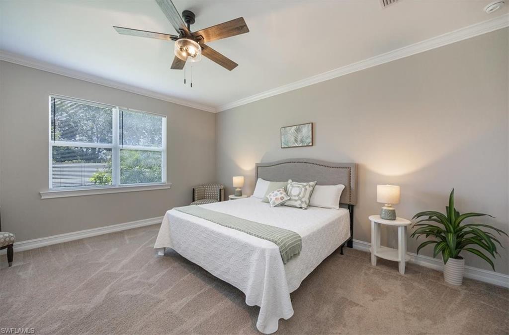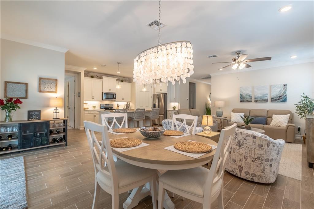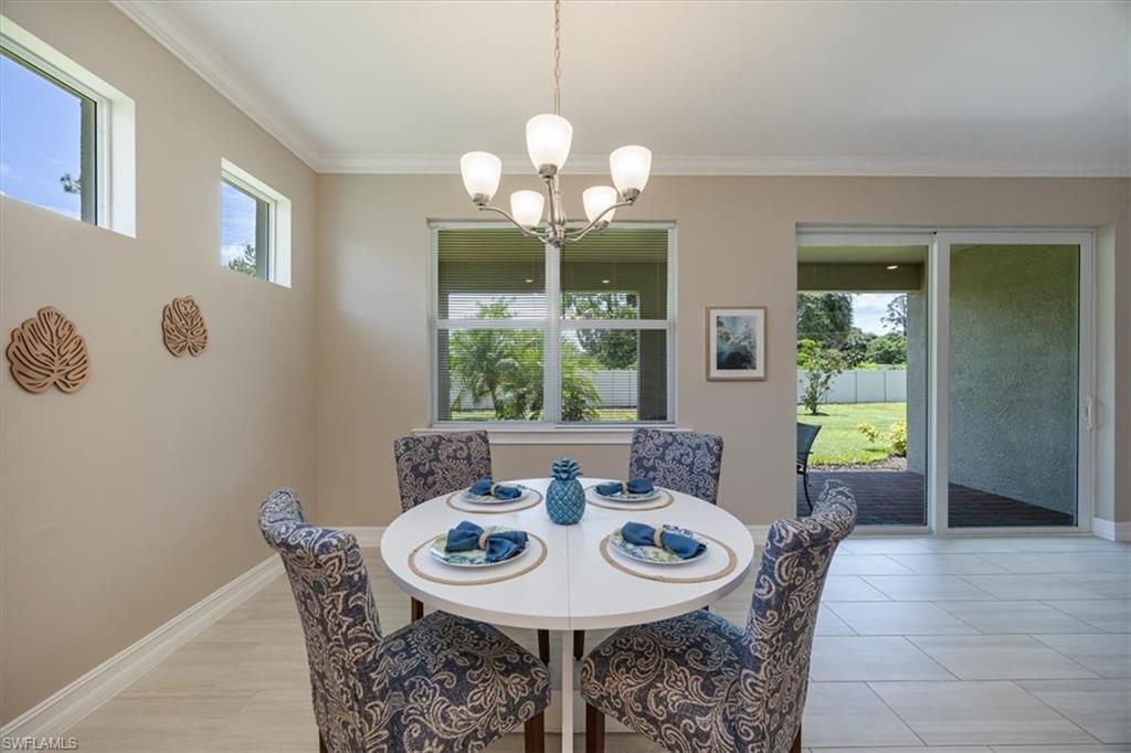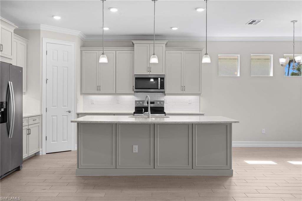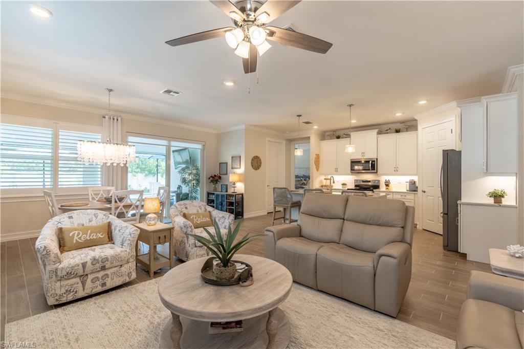 Oversized lot and fenced in backyard! This brand-new, move in ready 2024 designer home boasts 4 bedrooms, 2 baths offering a sophisticated blend of high-end finishes and modern elegance throughout. Below market financing available, see remarks. The light and bright open floor plan is adorned with chic designer furnishings, board and batten carpentry accents, and exquisite lighting fixtures throughout. The spacious kitchen is a showstopper, featuring an expansive quartz island, Whirlpool appliance suite, a walk-in pantry, and upgraded faucets and hardware. For optimal privacy, the primary suite is tucked away in its own serene retreat, complete with a spa-like ensuite bath featuring dual vanities, a walk-in shower, and refined finishes. Meanwhile, the guest bedrooms are thoughtfully positioned in their own wing, offering a private sanctuary for family and visitors. The fourth bedroom serves as a versatile space, perfect for a home office, media room, or additional guest accommodations. Beyond your stunning interior, this home is part of a vibrant community where you can indulge in resort-style amenities, including a clubhouse with a Social & Game Room, a state-of-the-art fitness center, a sparkling pool with lap lanes, and pickleball & bocce courts. Perfectly situated just minutes from shopping, dining, and the sun-drenched Gulf beaches of downtown Olde Naples and Marco Island, this is truly Naples living at its finest.