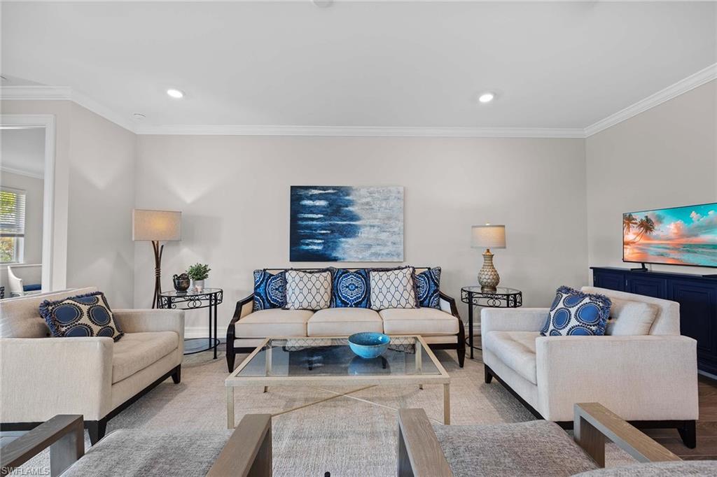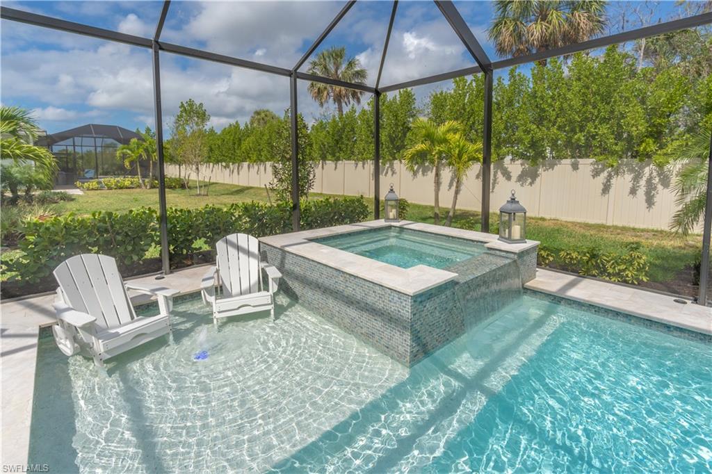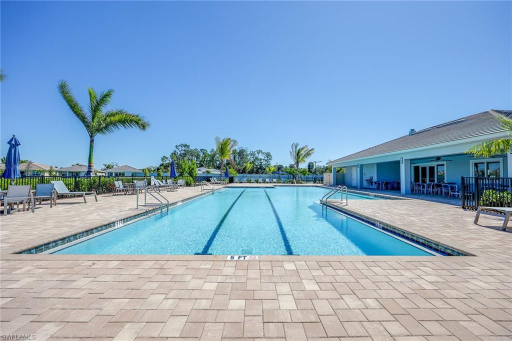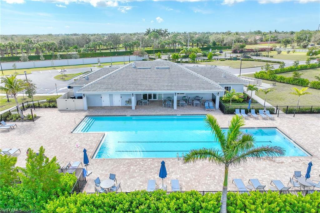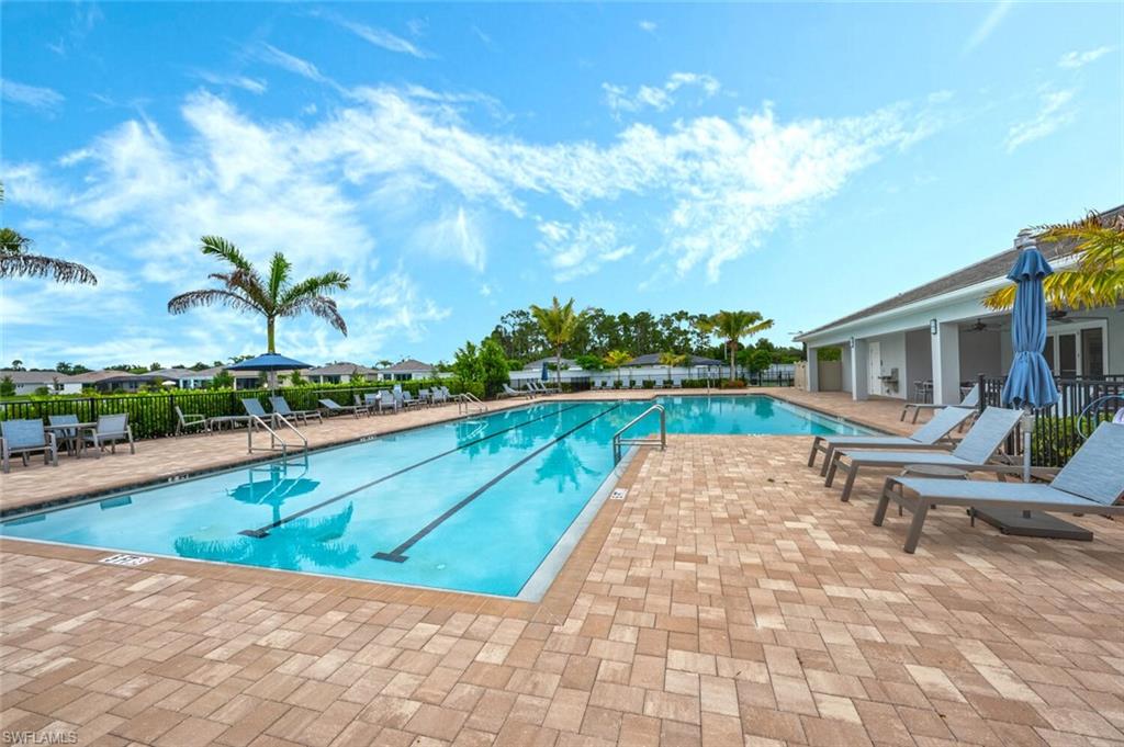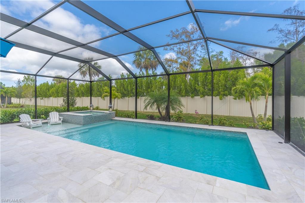 Newer construction 2023! This beautifully designed Shelby model features 3 bedrooms, a private den, and 2.2 baths(Outdoor Pool Bath), plus a spacious foyer and wide hallway for a bright, open feel. The well-planned layout offers the primary suite split from the secondary bedrooms, ideal for privacy. Set on a south-facing private lot in a premier South Naples location and Flood Zone X, this home is a standout choice for those who love the peace of mind, efficiency, and fresh finishes that new construction delivers. The open-concept design highlights high ceilings, crown molding, tray ceilings in both the living area and primary bedroom, and durable gray wood-look tile flooring throughout. The chef’s kitchen features a large quartz island with seating, Whirlpool stainless steel appliances, soft-close cabinetry with crown molding, a walk-in pantry, and designer pendant lighting—creating the perfect space for entertaining or relaxing at home. The expansive primary suite offers dual vanities with quartz countertops, a soaking tub, large walk-in shower with a bench, and a private water closet. The laundry room includes front-loading washer and dryer, upper cabinetry, and a utility sink. Additional highlights include impact windows, recessed lighting, a smart home system with Qolsys IQ panel, and an oversized 32.6’ deep garage—perfect for a golf cart, toys, or extra storage. Located in a smaller, well-maintained community of just 251 homes, this neighborhood offers a rare combination: resort-style amenities with low quarterly HOA fees. Enjoy a clubhouse, resort pool, pickleball, bocce, and game room—all included in a fee of just \$903/quarter, which also covers irrigation and lawn care. Additionally, flexible leasing allows for up to three rentals per year, each with a 30-day minimum. This home is conveniently located approximately 9 miles from 5th Avenue, 13 miles from Marco Island, and 5 miles from I-75, providing fast access to Naples' best beaches, dining, shopping, and medical services. Move-in ready, thoughtfully designed, and located in one of South Naples’ most accessible communities—don’t miss this exceptional opportunity.
