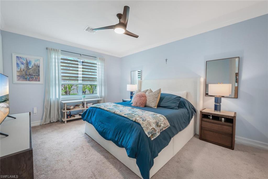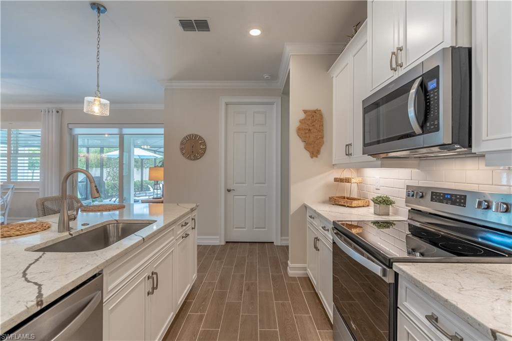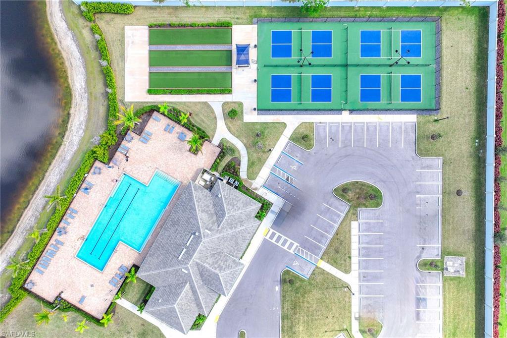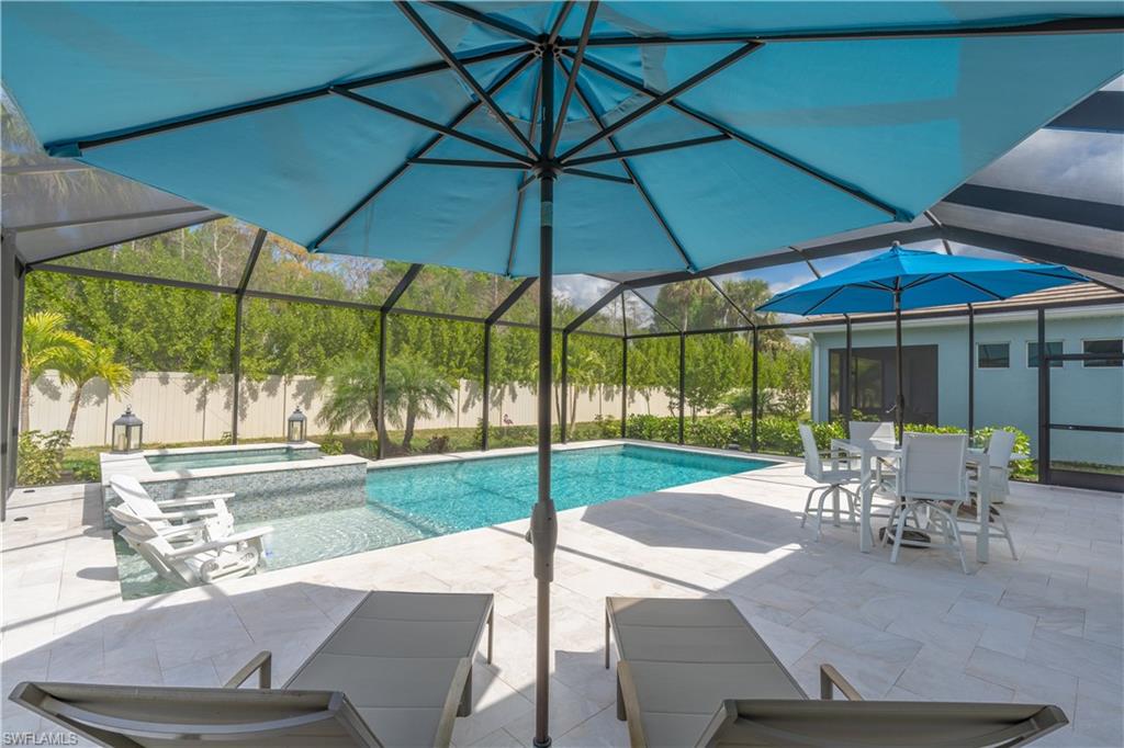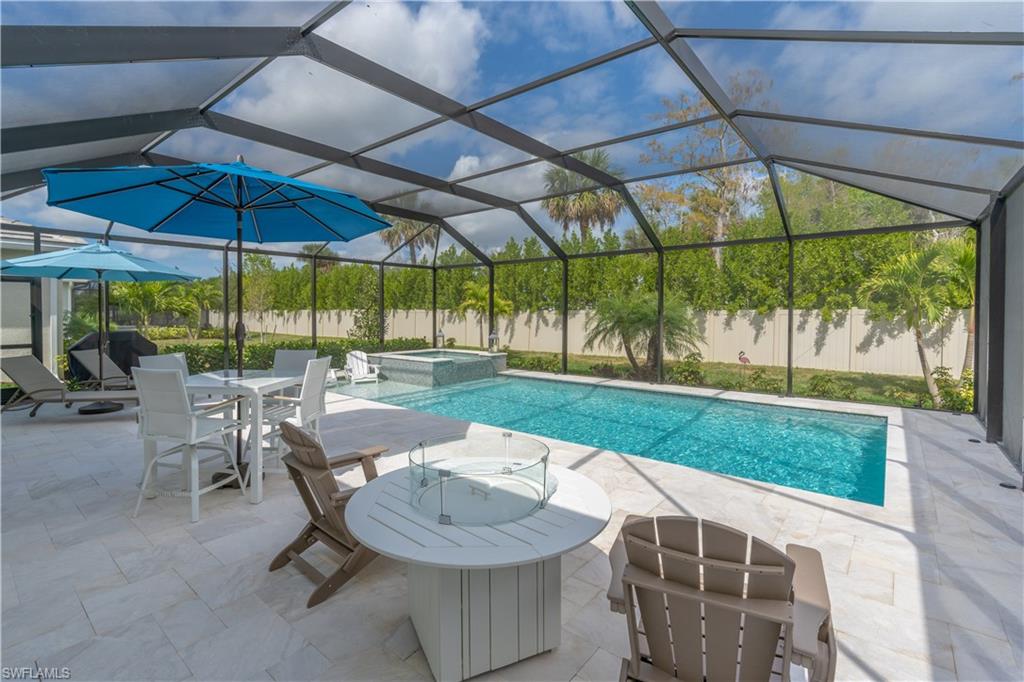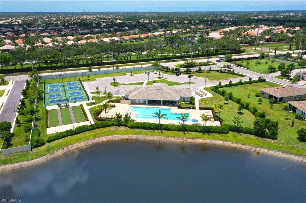 Newer construction 2023! This beautifully designed Shelby model features 3 bedrooms, a private den, and 2.2 baths(Outdoor Pool Bath), plus a spacious foyer and wide hallway for a bright, open feel. The well-planned layout offers the primary suite split from the secondary bedrooms, ideal for privacy. Set on a south-facing private lot in a premier South Naples location and Flood Zone X, this home is a standout choice for those who love the peace of mind, efficiency, and fresh finishes that new construction delivers. The open-concept design highlights high ceilings, crown molding, tray ceilings in both the living area and primary bedroom, and durable gray wood-look tile flooring throughout. The chef’s kitchen features a large quartz island with seating, Whirlpool stainless steel appliances, soft-close cabinetry with crown molding, a walk-in pantry, and designer pendant lighting—creating the perfect space for entertaining or relaxing at home. The expansive primary suite offers dual vanities with quartz countertops, a soaking tub, large walk-in shower with a bench, and a private water closet. The laundry room includes front-loading washer and dryer, upper cabinetry, and a utility sink. Additional highlights include impact windows, recessed lighting, a smart home system with Qolsys IQ panel, and an oversized 32.6’ deep garage—perfect for a golf cart, toys, or extra storage. Located in a smaller, well-maintained community of just 251 homes, this neighborhood offers a rare combination: resort-style amenities with low quarterly HOA fees. Enjoy a clubhouse, resort pool, pickleball, bocce, and game room—all included in a fee of just \$903/quarter, which also covers irrigation and lawn care. Additionally, flexible leasing allows for up to three rentals per year, each with a 30-day minimum. This home is conveniently located approximately 9 miles from 5th Avenue, 13 miles from Marco Island, and 5 miles from I-75, providing fast access to Naples' best beaches, dining, shopping, and medical services. Move-in ready, thoughtfully designed, and located in one of South Naples’ most accessible communities—don’t miss this exceptional opportunity.