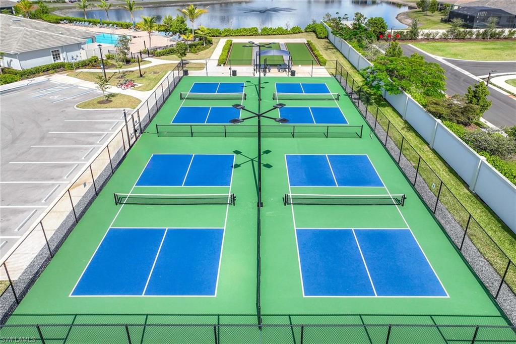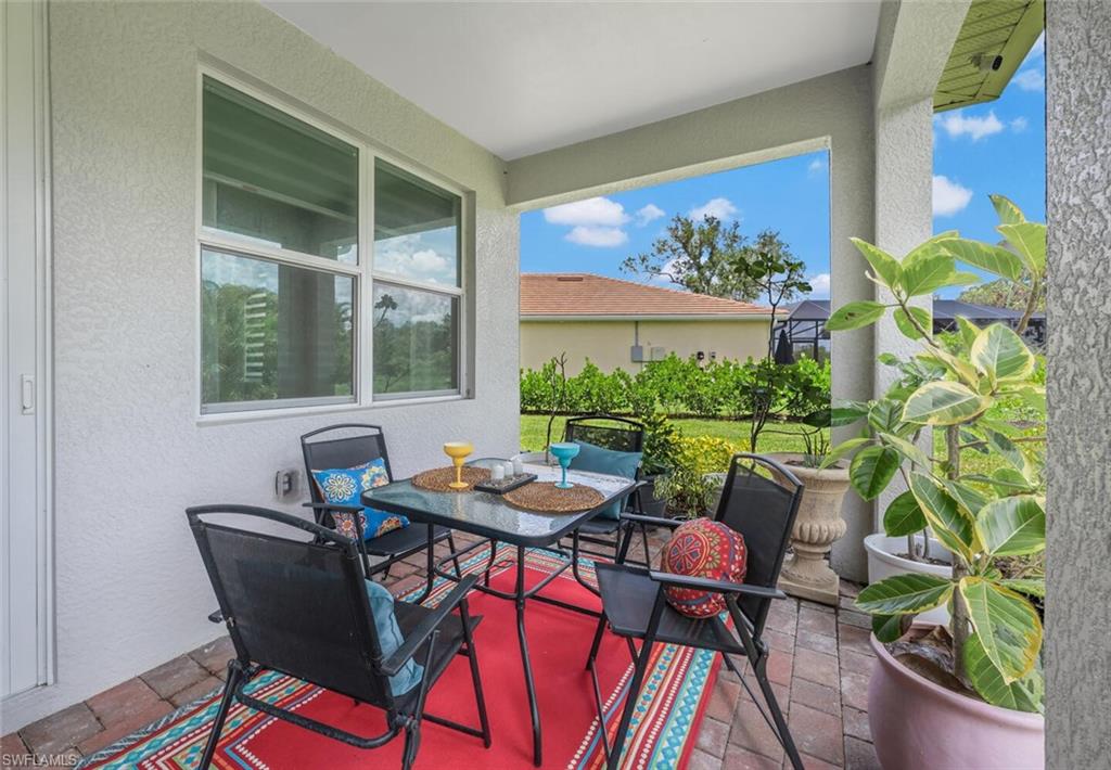 Perfect location for you and your guests, diagonally across from the clubhouse and pool, tennis and mailboxes. This immaculate furnished, four-bedroom home, upgraded with plantation shutters, screened lanai, and front door area, and all tile flooring throughout located in the exclusive gated community of Tamarindo. Enjoy the serenity of a screened, paved lanai and a cozy screened front porch, The open-concept layout features a generous great room that seamlessly connects to the kitchen and dining area. The kitchen is a chef's dream, boasting quartz countertops, stainless steel appliances, a chic white subway tile backsplash, and stylish white cabinetry. Retreat to the primary suite, which includes a luxurious walk-in shower, and a double vanity. Go outside to the expansive screened lanai, ideal for entertaining or relaxing. This is a smart home, control your air conditioner and doors from your phone. Community amenities are second to none, featuring an exceptional clubhouse, resort-style pool, lap lanes, a fitness center, four pickleball courts, and three bocce ball courts. With picturesque lakes and convenient access to the shopping, dining, and pristine beaches of Naples and Marco Island, this home offers the best of Florida living. Move in and start enjoying your new lifestyle today!