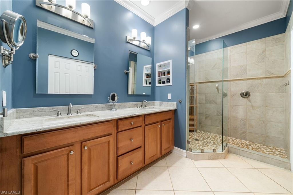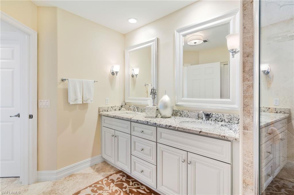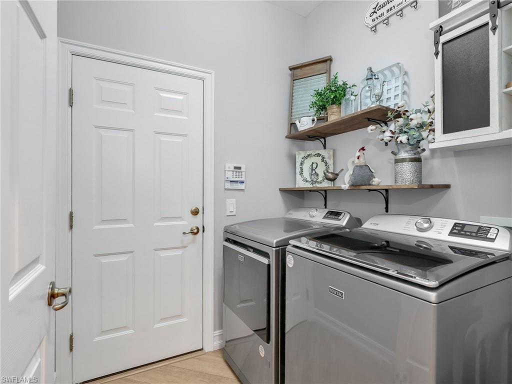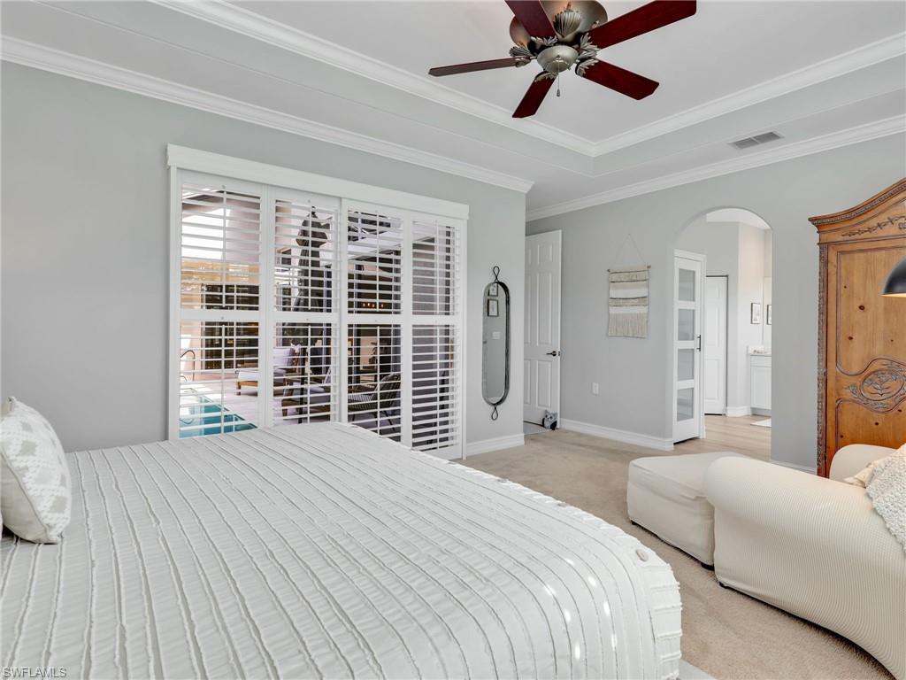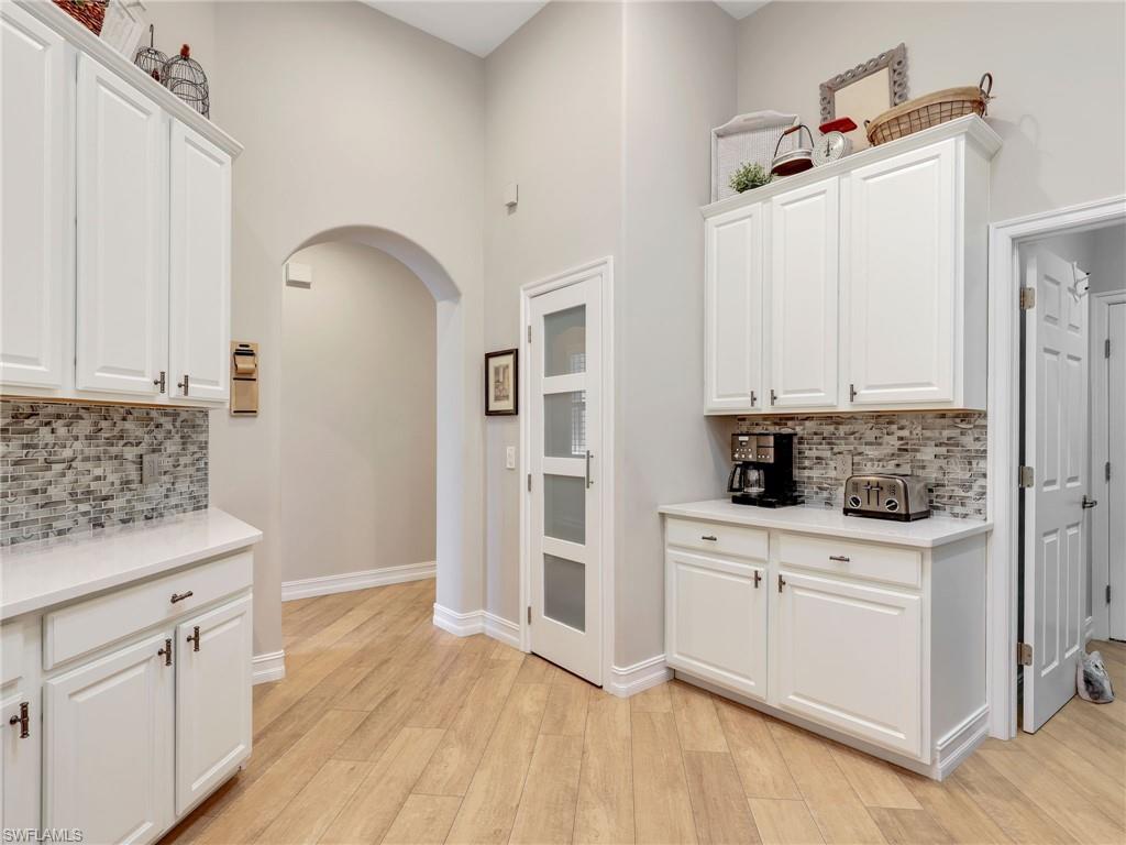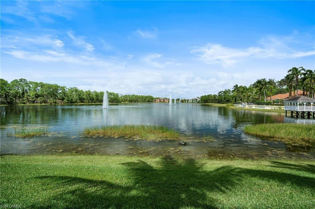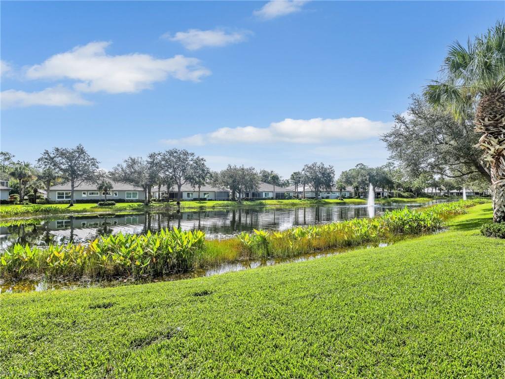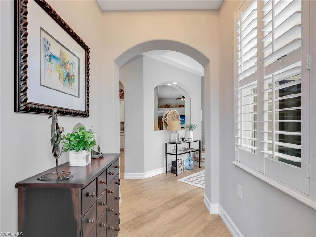 This stunning attached villa in Tarpon Bay offers a picture-perfect and peaceful paradise in prestigious North Naples. The property has been meticulously updated over the past few years, with no detail overlooked. The interior boasts neutral paint throughout, a chef's kitchen with gas cooking, newer appliances, popular white all-wood cabinets, quartz countertops, and a custom pantry door with slide-out shelving for convenience. High-end LVP flooring flows beautifully through the main living areas. The Plantation shutters offer wonderful privacy while highlighting the vast amount of windows throughout the home. Walking through the entry opens up to the spacious kitchen and the grand family room that features soaring ceilings and overlooks the sparkling blue pool. The primary bedroom and bath exemplify pure luxury. The primary bedroom is uniquely situated, surrounded by the deep blue lake on one side and the magnificent salt water pool on the other. The master bath is a bright and light oasis with a walk-in shower and neutral tones of whites, grays, and beiges, offering complete comfort. The primary bedroom closets feature custom cabinetry for maximum space and organization. The second and third bedrooms provide privacy and flexibility, ideal for a home office or accommodating family and friends. The second bathroom has also been redone in a chic combination of white with black accents, complementing any decor. Structural exterior updates include a new roof, exterior paint, hurricane-grade windows, and a whole-home generator for complete peace of mind. Additionally, the pool received a new surface and limestone decking in 2019. The garage has been re-imagined with custom coated flooring, extensive overhead shelving, and is fully air-conditioned.