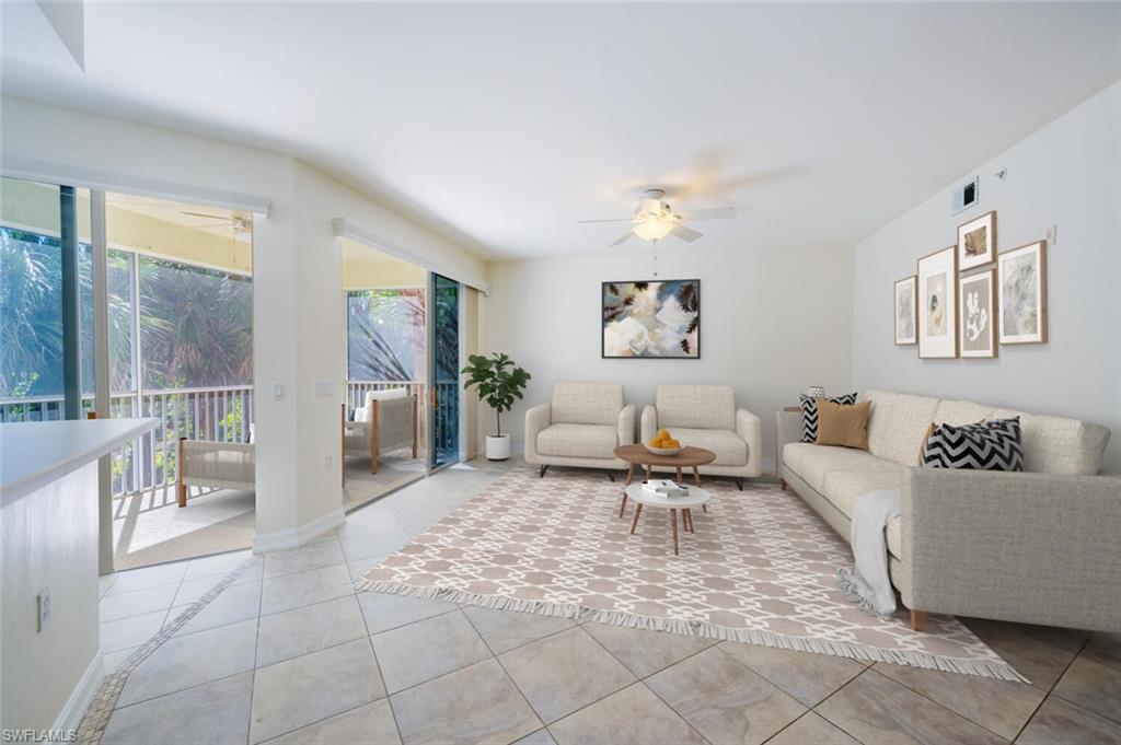 Upgraded top floor, end unit condo in a great location in North Naples! This sought after condo is sold turnkey, just bring your suitcase and relax! Welcome to this newly renovated 2 bedroom/2 bath condo in Tarpon Bay which boasts new laminate flooring throughout, new custom paint, upgraded lighting, brand new furniture and accessories. The kitchen has a gas cook top, open floor pan to easily entertain. The lanai is screened in with added glass sliding panels so you can enjoy the fresh air or close the glass panels to extend more living space! The lanai has a very private, lush tropical landscape view! All this just walking distance to Tarpon Bay's abundant amenities! The centerpiece of the Tarpon Bay community is its clubhouse, infinity-edge pool, spacious pool deck, club rooms, library, fitness, tennis, basketball, pickleball and kayaking. Just a short drive to RSW airport, Vanderbilt beach and Mercato! The current owner has had no trouble renting this unit not only in season but throughout the year! Whether you want to use the condo for yourself, rent part time or full time this condo has it all! The location is close to all the good things Naples has to offer. …and The Sunsets are Free!