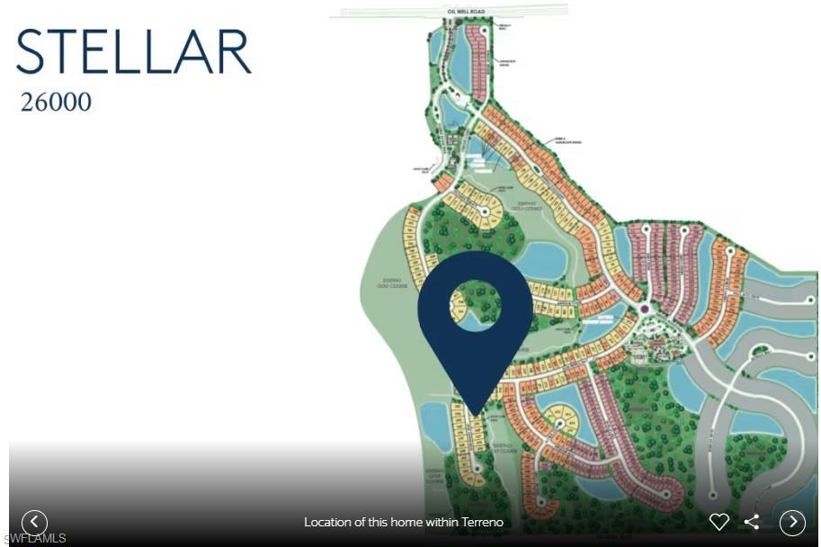 New construction Stellar plan with golf course views - AVAILABLE NOW! This Stellar pool & spa home with golf course view features impact windows, 10' zero corner sliding glass door (impact), natural gas appliances, laundry upgrade with appliances, beautiful group 6 48" tile floors throughout, extended covered lanai with outdoor kitchen prep, 4' garage extension with epoxy finish, & so much more! Terreno by DiVosta is a gated community offering a resort lifestyle with open floor plans, gourmet kitchens, and large outdoor living spaces. For those looking for resort lifestyle communities with private amenities and modern houses, or luxury homes for sale in Naples, FL, Terreno should be your top choice. Neighborhood features include 15,000 sq. ft. grand clubhouse with large community room for events, catering kitchen, state-of-the-art fitness center, exercise studio, 8 pickleball courts, 2 tennis courts, dog park, playground, firepit lounge, dog park, resort style pool, lap lanes, heated spa, full-service restaurant bar & grill, food truck drive-up, 18-hole public golf-course next door & more!