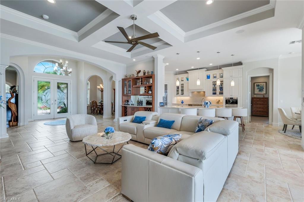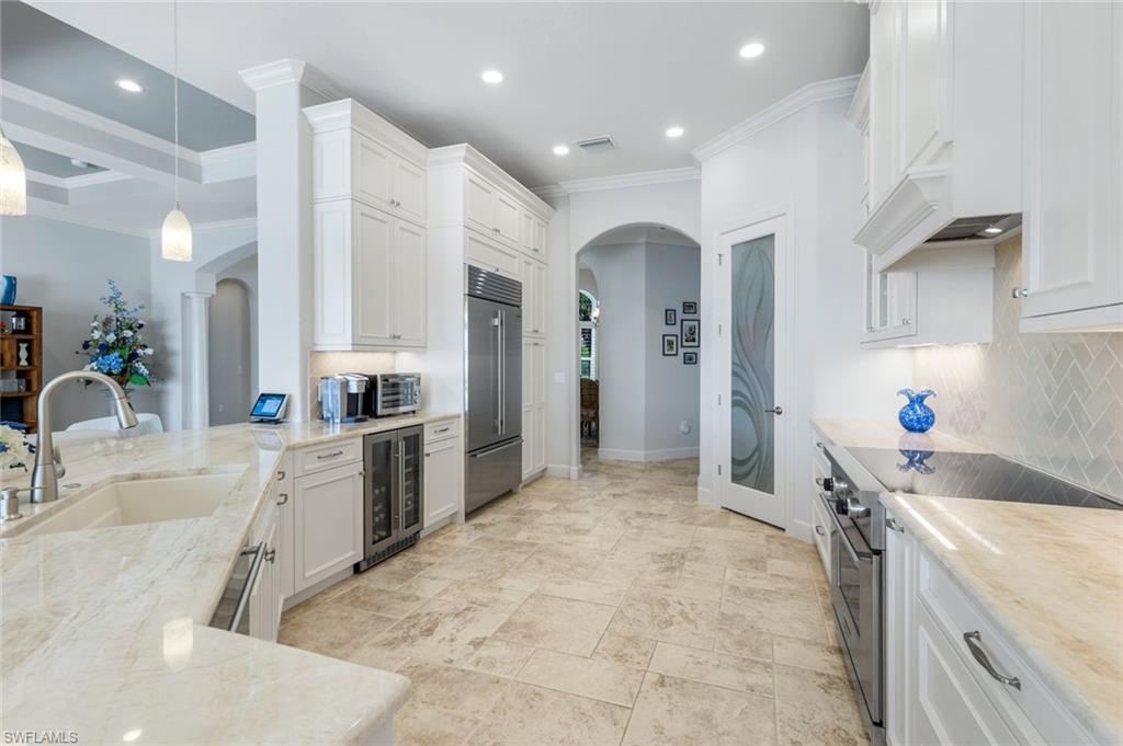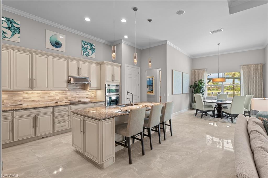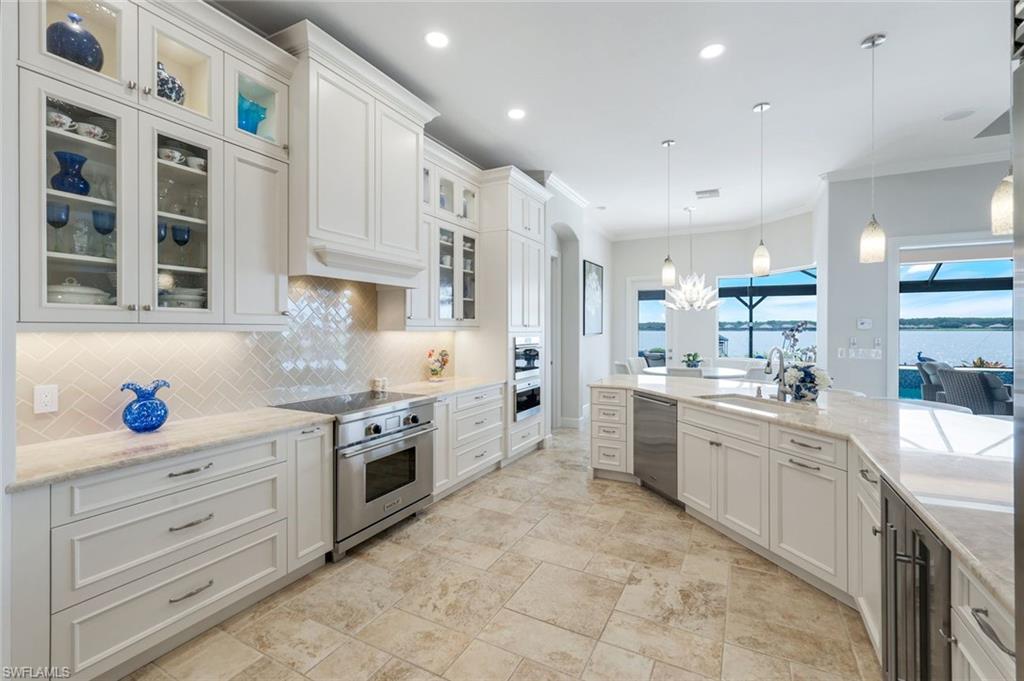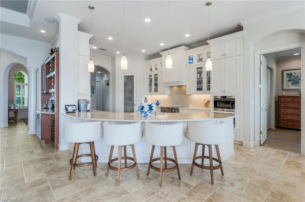 Live the Ultimate Vacation Lifestyle in The Quarry! This beautifully remodeled 4 Bedroom plus Den, 4 full bath, 3 car garage home is perfectly situated overlooking the 14th fairway with picturesque golf course, lake, and preserve views with no roof tops in sight! Custom features and professional design gives this home a model like feel and is a true one of a kind. From the moment you walk in the door, you are greeted with a wide open Great Room style floorplan with two sliding glass doors to the lanai and spacious pool area. The spacious kitchen is the heart of the home with center island, two breakfast bars with seating for 8, updated quartz countertops, custom tile backsplash, double wall ovens, wine cooler, and two additional beverage coolers, making this the perfect kitchen for entertaining. The luxurious Primary Suite features a sliding glass door to the lanai, spacious closets with cabinetry, and bath boasting dual sinks, walk in shower, soaking tub, and custom wall paper detail. Enjoy days around the heated pool/spa and al fresco dining on the lanai complete with travertine marble deck, raised sun deck, spa, and wet deck. Other fine appointments of this home include: wood floors throughout living room, dining room, den, and primary bedroom; custom window treatments throughout; custom wallpaper accents; special order chandeliers, lights, and fans; crown molding throughout; motorized roll down hurricane shutters on the lanai and front foyer; freshly painted interior; two brand new HVACs; air conditioned three car garage; and more! Furniture & decor package available! The Quarry is an exceptional lakefront community offering unparalleled amenities and a lifestyle like no other. Enjoy boating, golf, tennis, pickleball, bocce ball, a Tiki Bar, poolside food and drink service, a fully equipped gym, and a variety of social activities. The recently renovated and expanded “Lake Lodge & Beach Club” provides the perfect setting for relaxation, while over 500 acres of navigable lakes (with boat slips available for lease) offer endless opportunities for water enthusiasts. The private 18-hole golf club features optional golf and social memberships, providing an elite experience for golf lovers (full golf memberships available/no waitlist). Schedule your private showing today!