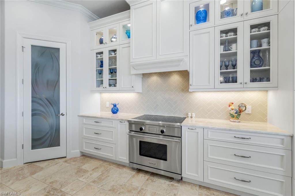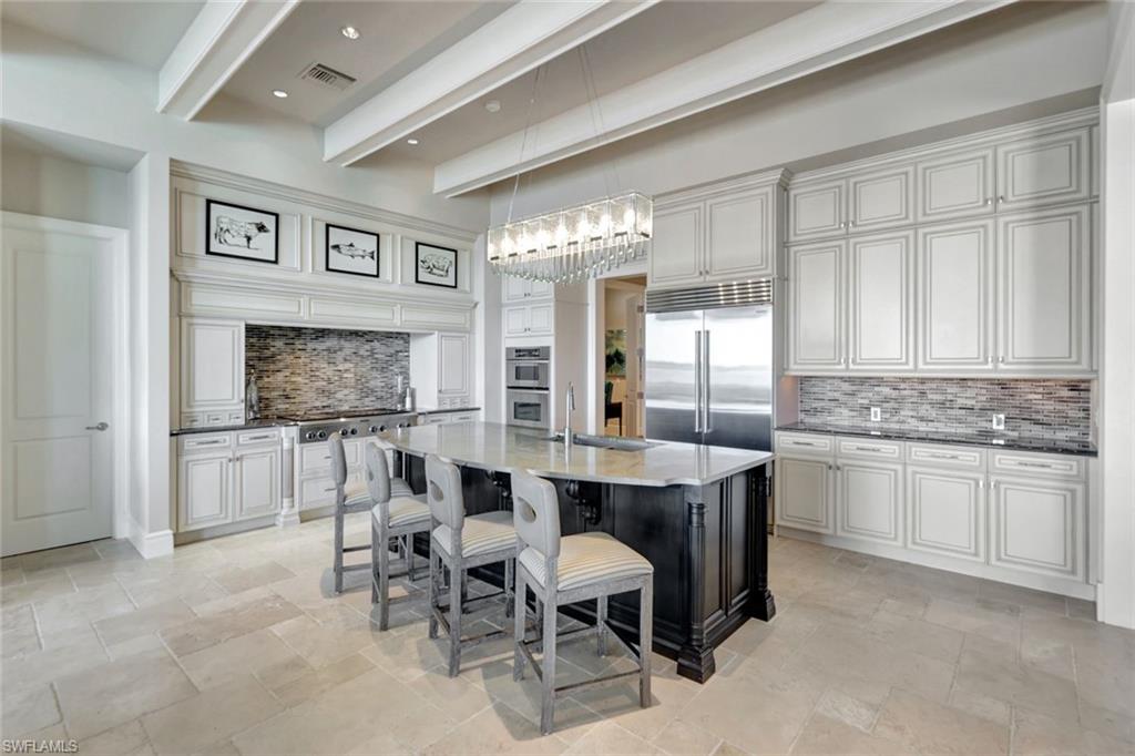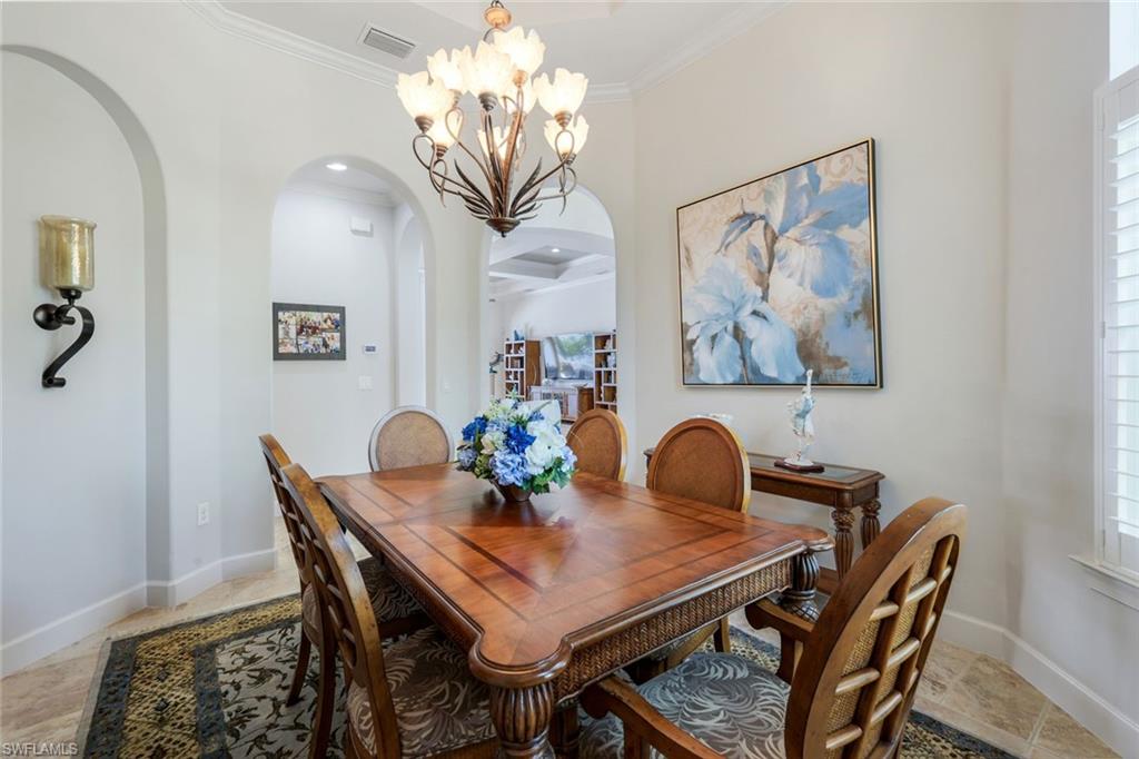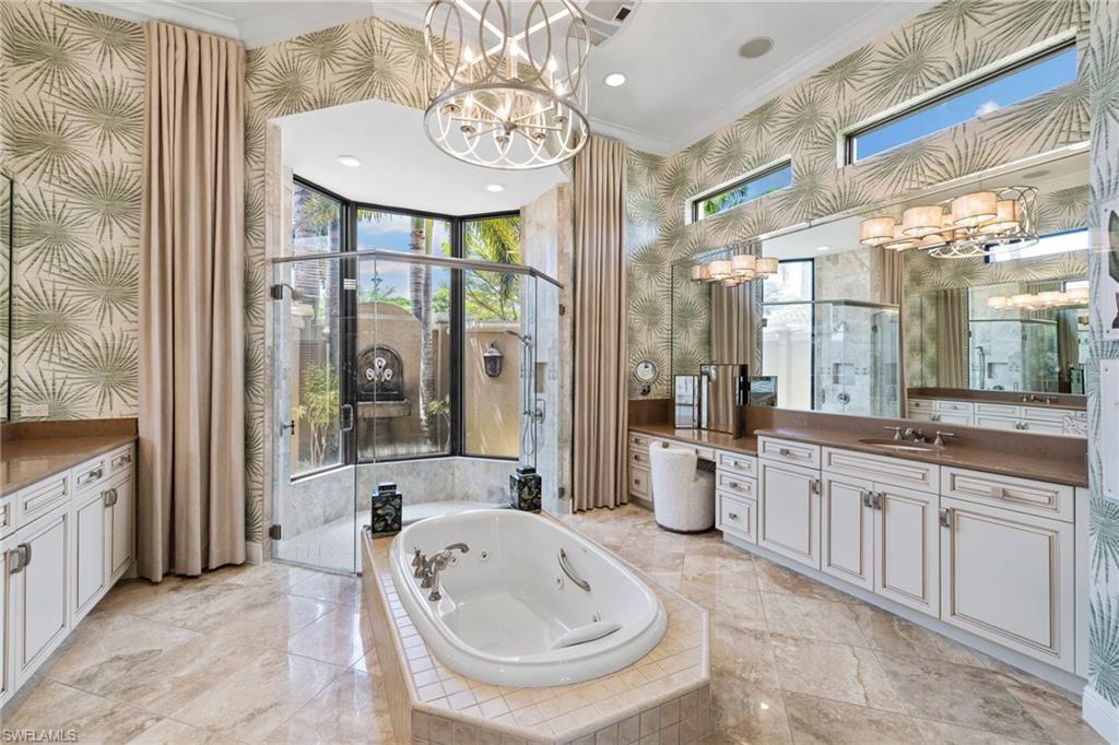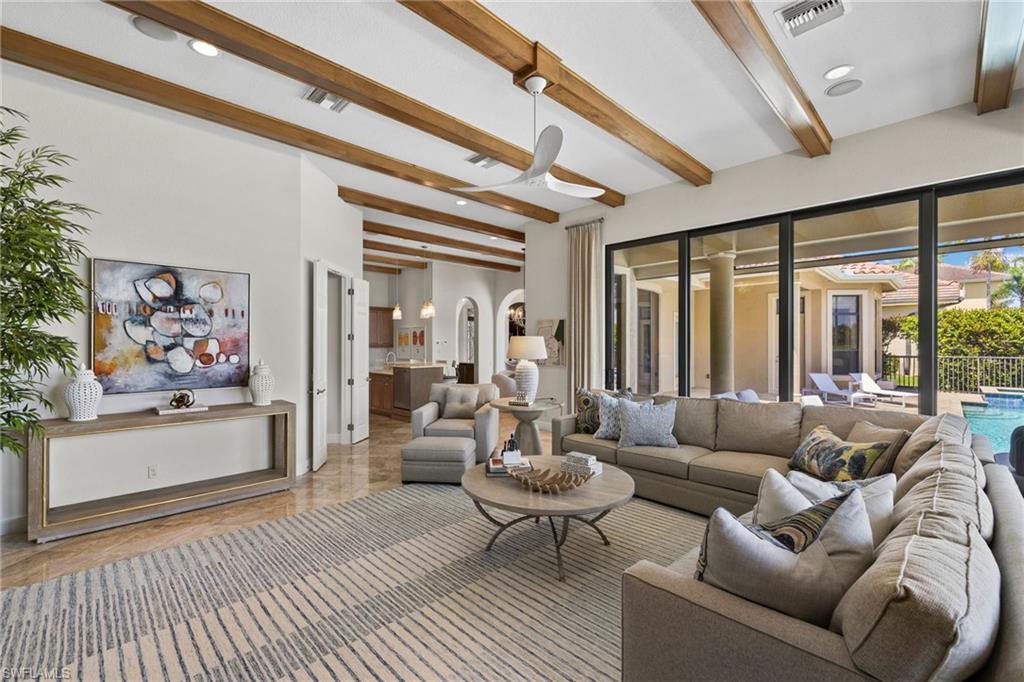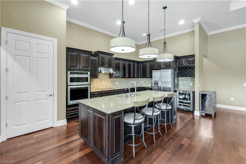 Live the Ultimate Vacation Lifestyle in The Quarry! This beautifully remodeled 4 Bedroom plus Den, 4 full bath, 3 car garage home is perfectly situated overlooking the 14th fairway with picturesque golf course, lake, and preserve views with no roof tops in sight! Custom features and professional design gives this home a model like feel and is a true one of a kind. From the moment you walk in the door, you are greeted with a wide open Great Room style floorplan with two sliding glass doors to the lanai and spacious pool area. The spacious kitchen is the heart of the home with center island, two breakfast bars with seating for 8, updated quartz countertops, custom tile backsplash, double wall ovens, wine cooler, and two additional beverage coolers, making this the perfect kitchen for entertaining. The luxurious Primary Suite features a sliding glass door to the lanai, spacious closets with cabinetry, and bath boasting dual sinks, walk in shower, soaking tub, and custom wall paper detail. Enjoy days around the heated pool/spa and al fresco dining on the lanai complete with travertine marble deck, raised sun deck, spa, and wet deck. Other fine appointments of this home include: wood floors throughout living room, dining room, den, and primary bedroom; custom window treatments throughout; custom wallpaper accents; special order chandeliers, lights, and fans; crown molding throughout; motorized roll down hurricane shutters on the lanai and front foyer; freshly painted interior; two brand new HVACs; air conditioned three car garage; and more! Furniture & decor package available! The Quarry is an exceptional lakefront community offering unparalleled amenities and a lifestyle like no other. Enjoy boating, golf, tennis, pickleball, bocce ball, a Tiki Bar, poolside food and drink service, a fully equipped gym, and a variety of social activities. The recently renovated and expanded “Lake Lodge & Beach Club” provides the perfect setting for relaxation, while over 500 acres of navigable lakes (with boat slips available for lease) offer endless opportunities for water enthusiasts. The private 18-hole golf club features optional golf and social memberships, providing an elite experience for golf lovers (full golf memberships available/no waitlist). Schedule your private showing today!