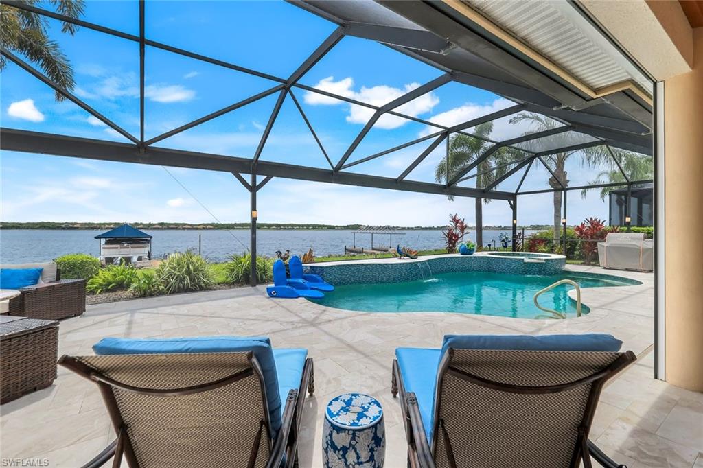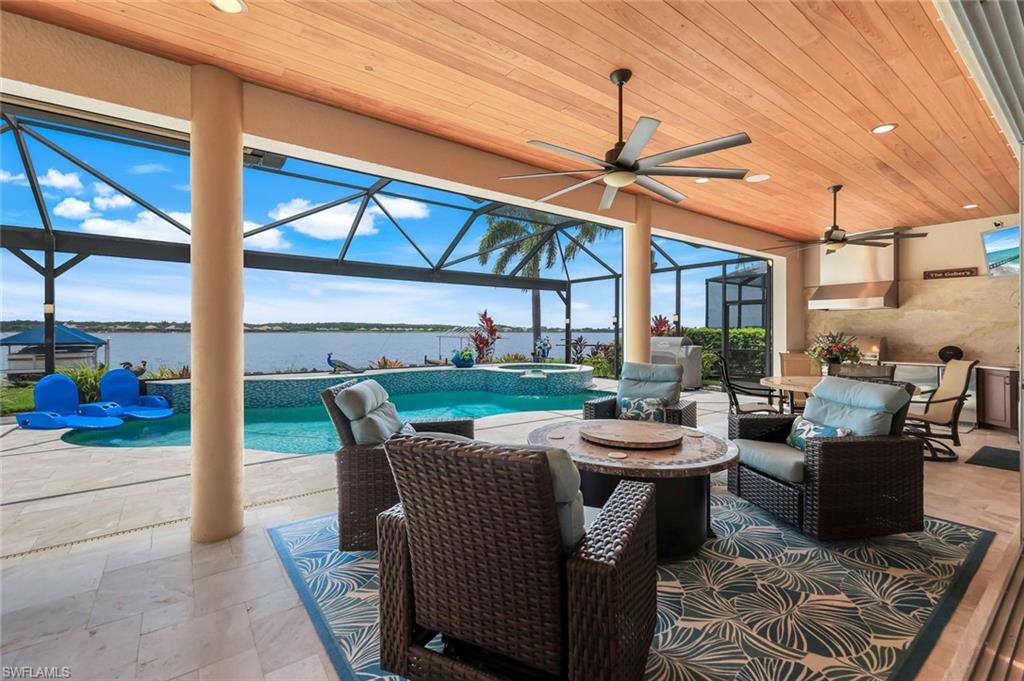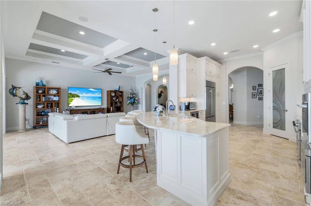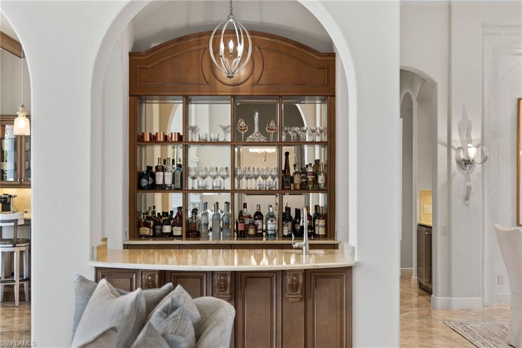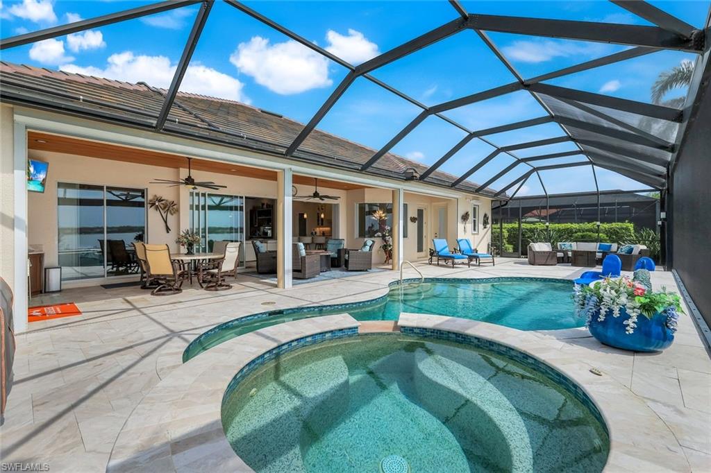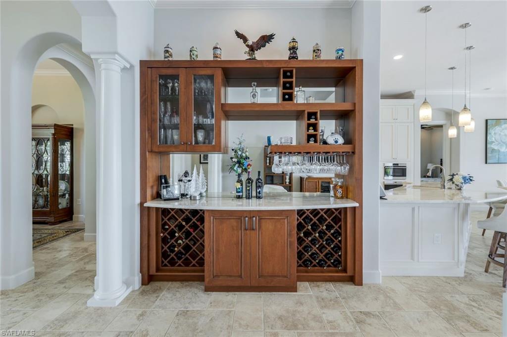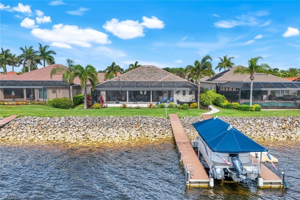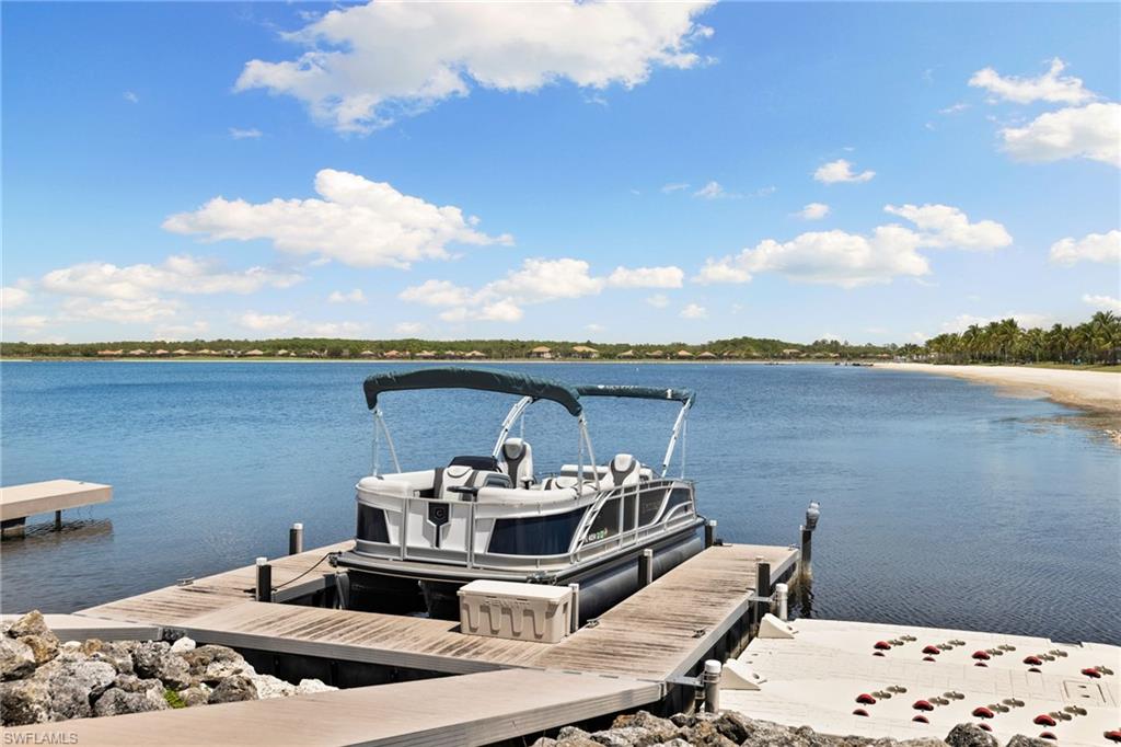 Live the ULTIMATE LIFESTYLE IN The Quarry, a Golf and Beach Community (placed in the top 4% of clubs and communities globally). Step inside this immaculate WATERFRONT home and enjoy BREATHTAKING Sunrise Views of Stone Lake. Boasting 4 spacious bedrooms plus a den, 3 full bathrooms, and a 2-car EXTENDED air-conditioned garage complete with epoxy floor and custom organizers, this home provides over 3,000 square feet of comfort and style. The NEWLY remodeled kitchen is a chef's dream and comes equipped with top-of-the-line appliances (WOLF AND SUB-ZERO), custom cabinets, and quartzite countertops. The crown molding adds a touch of elegance throughout the home, while the custom built-in bar in the great room is perfect for hosting gatherings for friends and family. The recently remodeled primary bathroom comes with custom tile and cabinets for a luxurious and spa like feel. Step outside to the expansive lanai, complete with a custom outdoor kitchen, marble flooring, and Cyprus wood ceiling for the ultimate outdoor living experience. The salt-water pool/spa is perfect for those hot summer days. And don't forget about the deeded dock with covered canopy, hydraulic lift, and jet ski capability for all your boating needs. A 2018 Bennington Pontoon Boat is available for purchase. The whole house generator, electric roll down shutters and accordion shutters will ensure your home is always protected during storm season. This home also features a newer Roof (2019), newer dual zoned air conditioners (2022), plantation shutters and has been freshly painted inside. Tucked away in North Naples, The Quarry isn't just a community, it's a resort-style escape on 500+ acres of pristine lakes and preserves! Vacation vibe amenities include the newly renovated beach club with restaurant, tiki bar, resort pool, lap pool, wellness center, 5 lighted soft-surface tennis courts, 3 lighted bocce courts, 5 lighted pickleball courts, a tennis shop, boating, kayaking, fishing and the full-time activities director will make sure a great time is had by all. In addition, various optional golf memberships are offered at the privately owned Quarry Golf Club - (NO WAIT LIST). Designed by world-renowned architectural team of Dr. Michael Hurdzan and Dana Fry in 2007, this Par 72 championship golf course offers an unparalleled golf experience with spectacular views. Water appears on every hole, and the course is a true test for golfers of all levels. With 5 sets of tees and a unique layout to every hole, you'll never get tired of challenging this exceptional course. Don't miss out on this incredible opportunity to own a piece of paradise in The Quarry!