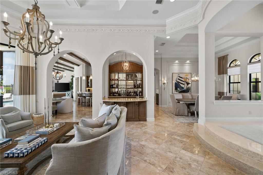 Golf and boating highlight this rare waterfront estate in The Quarry. This custom Arthur Rutenberg estate is perfectly positioned on a .38 acre home site with sweeping views of Stone Lake and the beach. A private dock and boat lift provide direct access to over 500 acres of navigable lakes and waterways, delivering an unmatched boating lifestyle right from your backyard. Step inside through wrought-iron doors and be greeted by picture windows showcasing the forever lake views and an open floor plan designed for entertaining. Highlights include a wet bar and wine bar, a chef’s kitchen with gas cooktop, exposed stained beams, multiple tray ceilings, and pocketing sliding glass doors that blend indoor and outdoor living. Notable upgrades include impact-rated windows and doors, a whole-house water softener, air-conditioned garage, two gas fireplaces, motorized roll-down hurricane and bug screens, tile and wood flooring throughout, and a custom pool with tiki torch ambiance. The Quarry is a gated, resort-style community with something for everyone: boating, championship golf, tennis, pickleball, bocce, multiple dining options, a tiki bar, poolside food and beverage service, a fitness center, and a full social calendar led by an on-site activities director. Golf membership is optional, and a $20 million renovation of the Lake Lodge and Beach Club was recently completed. A pontoon boat is also available for purchase.