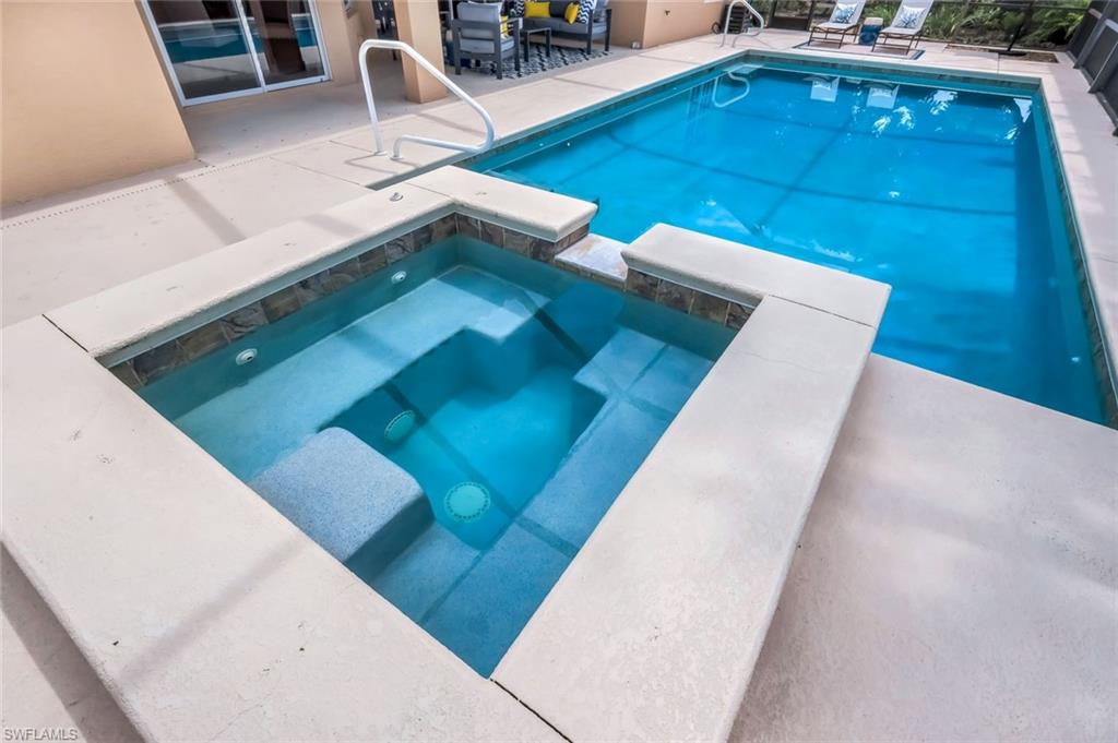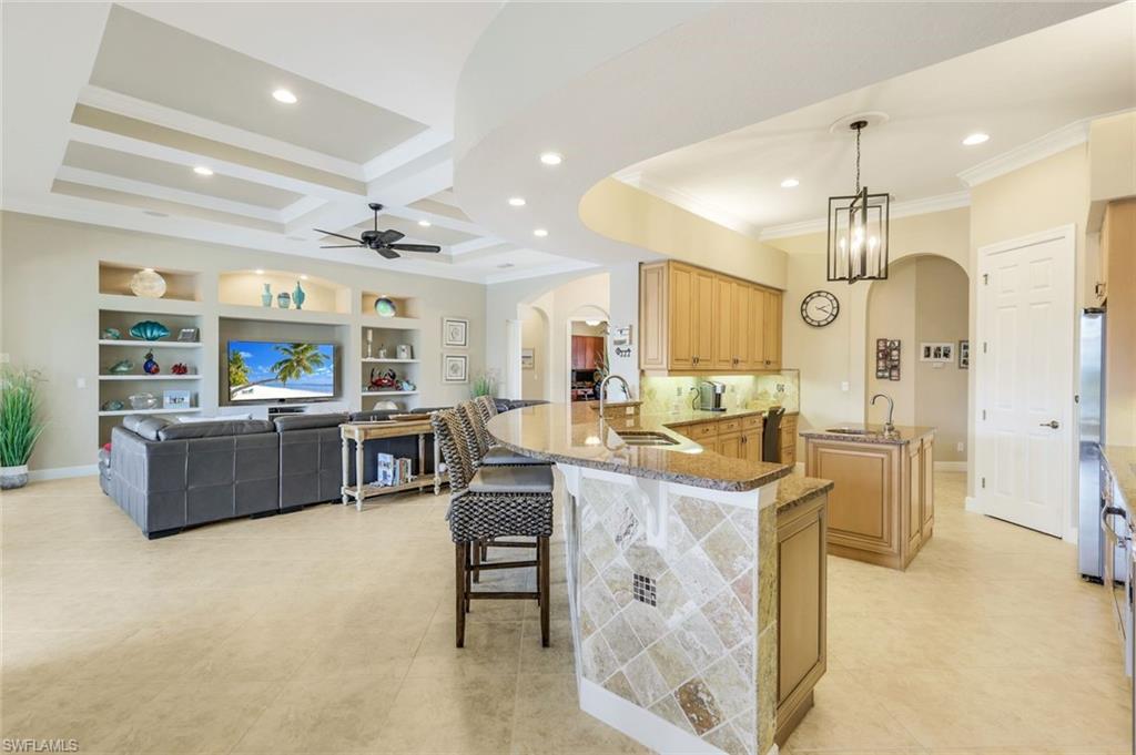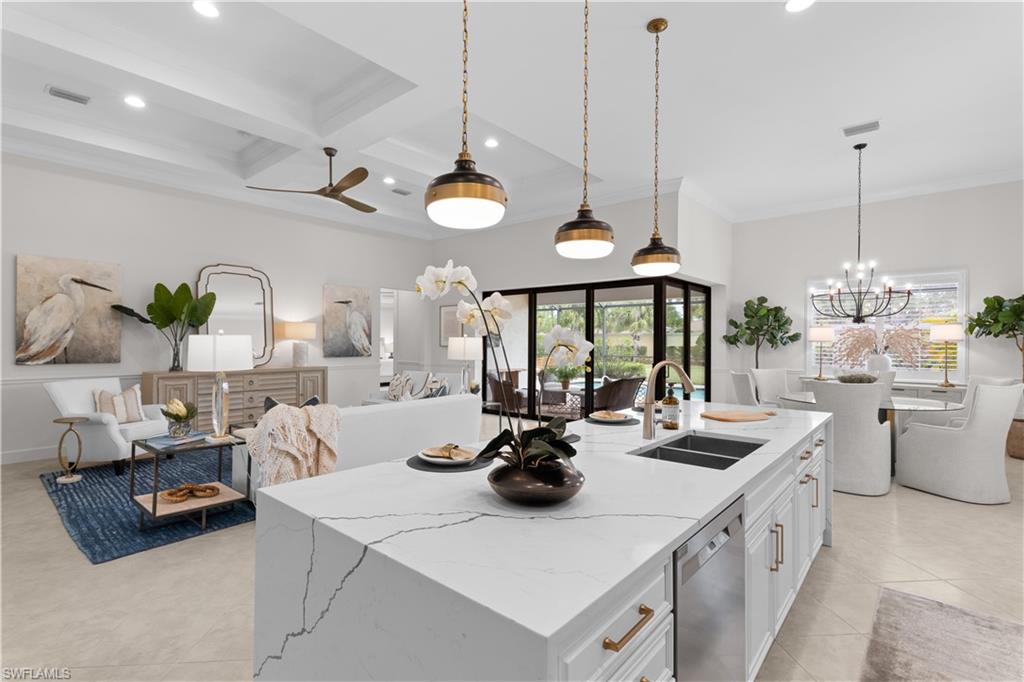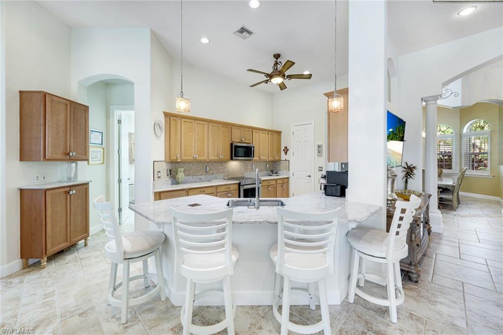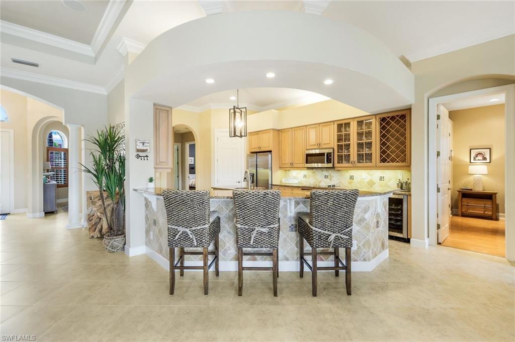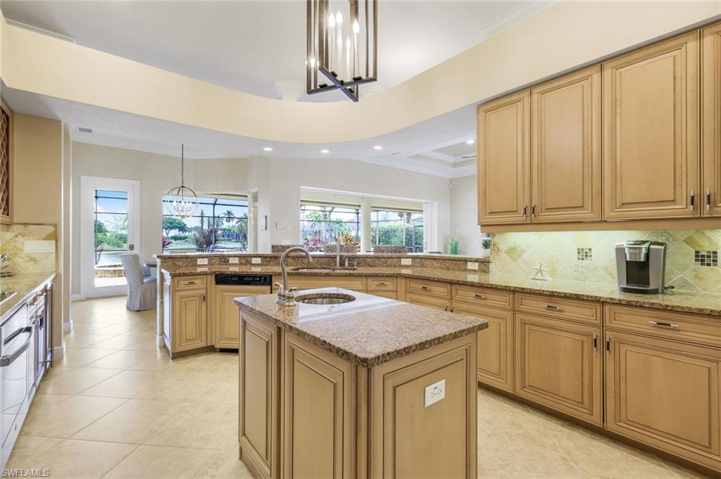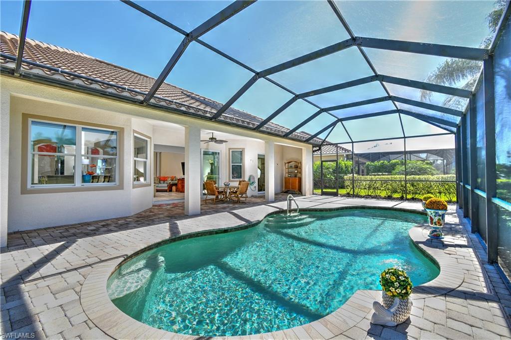 Upgrades galore! This home is a must-see with its fresh paint, a newer kitchen complete with KitchenAid appliances, Carrea Marble countertops, hurricane impact windows throughout, custom cabinetry and a walk-in pantry. The great room is spacious thanks to the removal of the interior partition. Enjoy dinner on the oversized covered lanai by your solar heated saltwater pool and watch the sunset across the lake. The dramatic master suite opens to the Lania and boasts 2 large custom closets, a soaking tub, dual shower heads and dual sinks. The stunning wainscot dining room overlooks the newly landscaped garden. Upscale features include 12 ft. ceilings, tray ceilings, large crown molding, solid wood cabinetry, custom closet cabinetry in every closet, granite and wood floors with upgraded tiles, epoxy garage floor, extended garage and storage. Nestled in North Naples. The Quarry is a one of a kind community built around 3 pristine lakes, approximately 500 acres of interlocking waterways and navigable Stone Lake at its heart. Enjoy boating, water skiing, kayaking or beach activities. Experience Southwest Florida at its best in The Quarry. The Quarry Beach Club is a private member owned club that features a new redesigned resort and lap pool, fitness and wellness center, tennis, pickleball and bocce court and boating. Dining at its finest is available at the indoor dining room or outdoor Q Bar. The lifestyle calendar of events offers something for everyone. It's all right here for you to enjoy. You'll never want to leave.