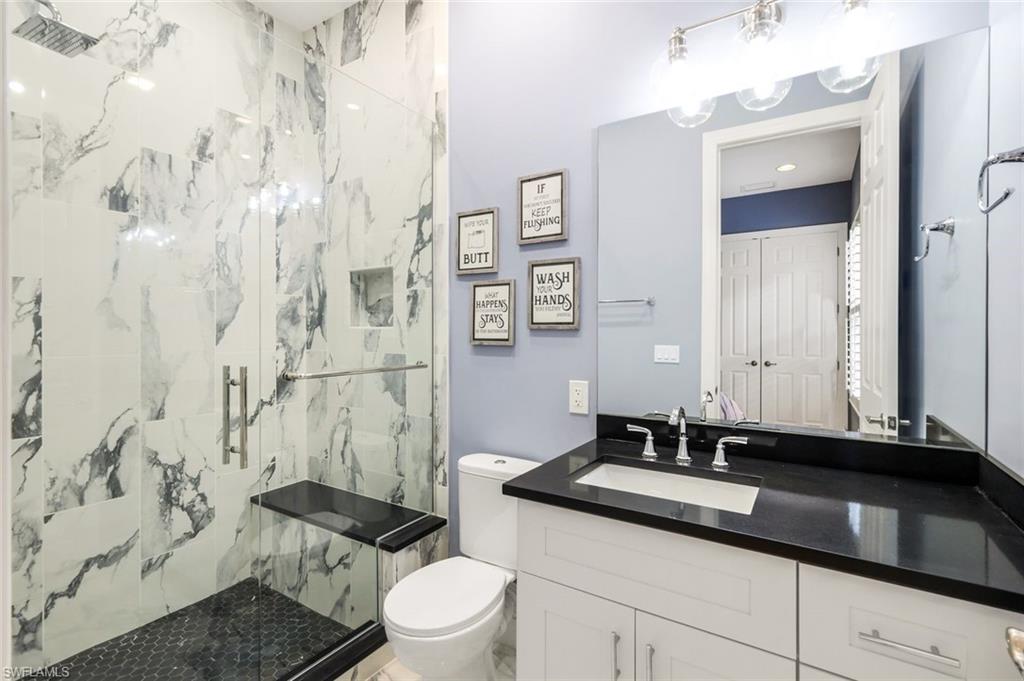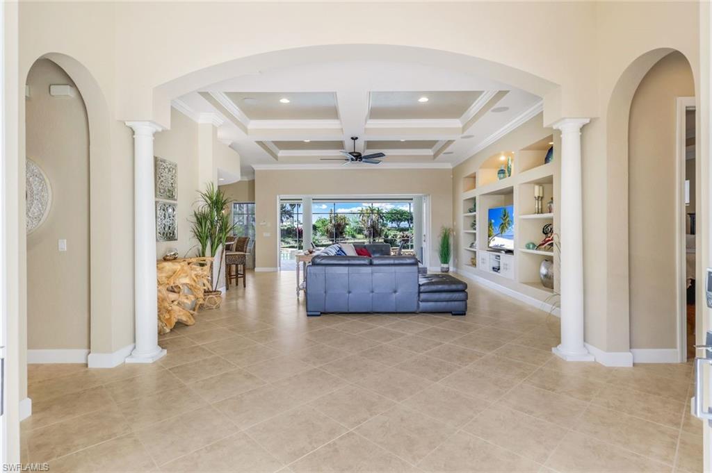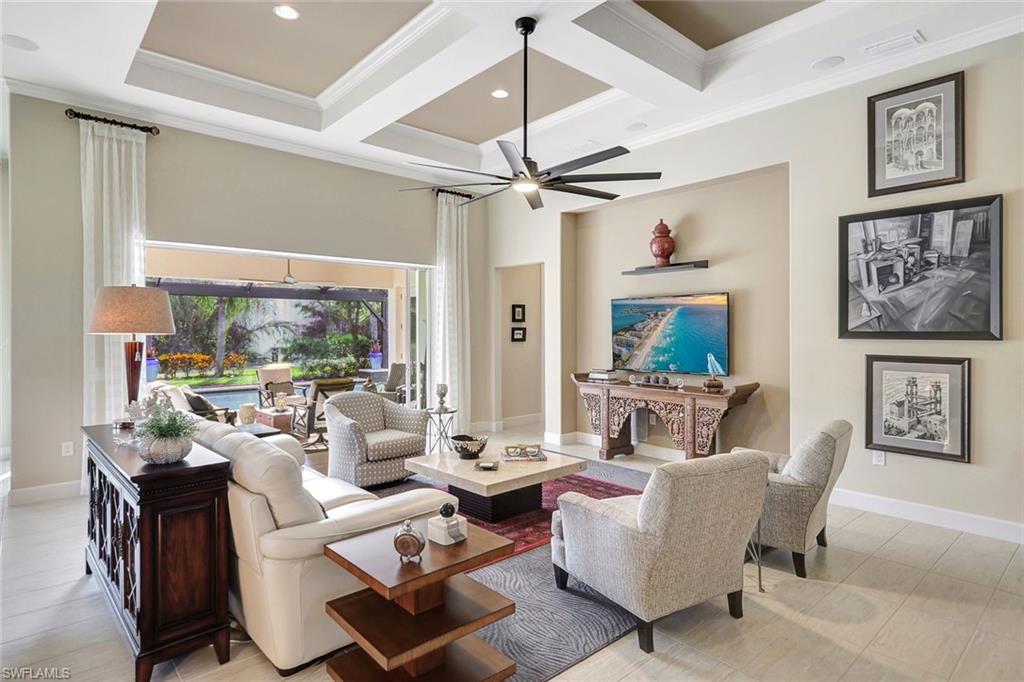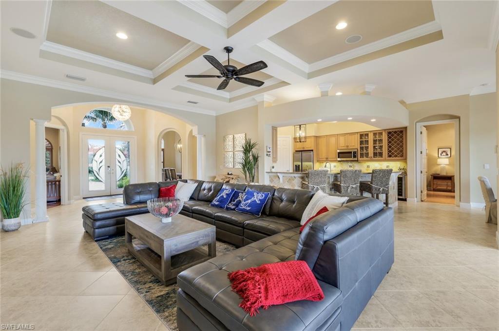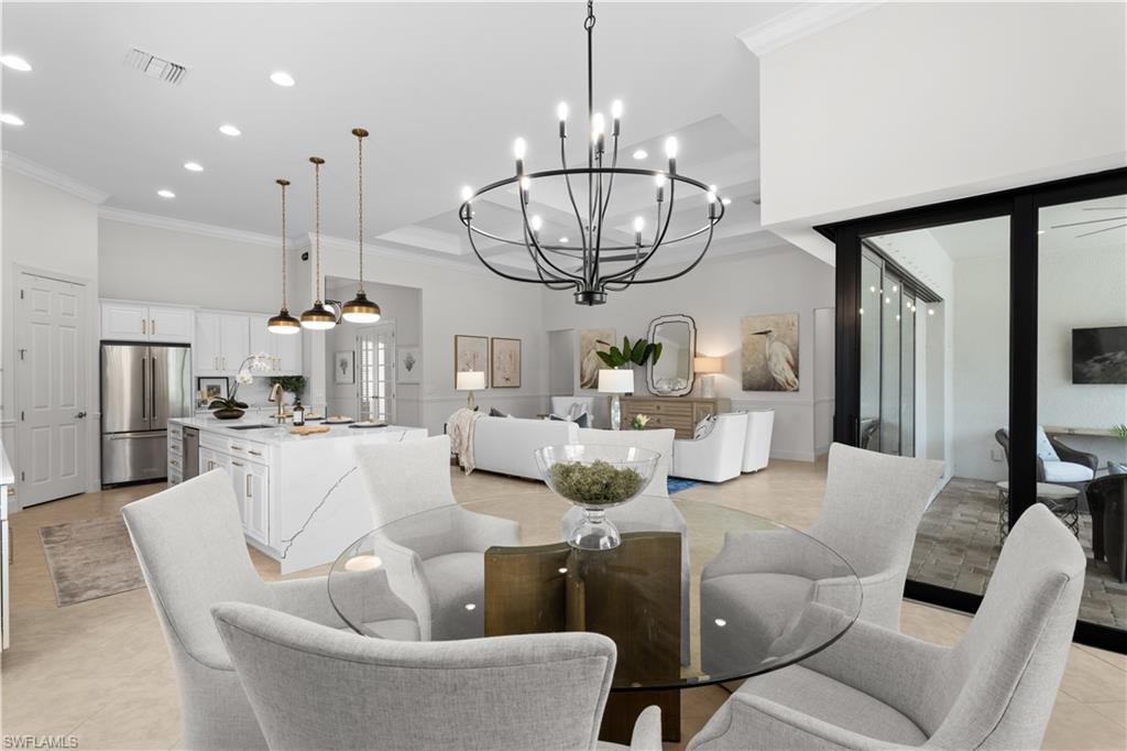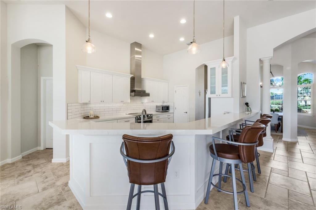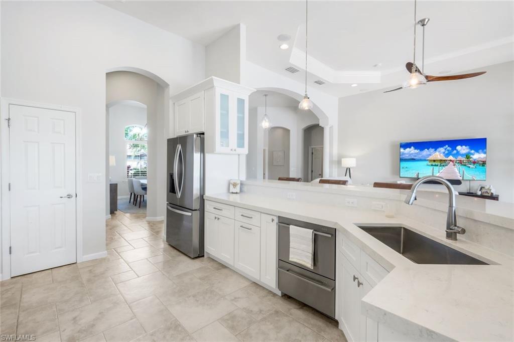 Upgrades galore! This home is a must-see with its fresh paint, a newer kitchen complete with KitchenAid appliances, Carrea Marble countertops, hurricane impact windows throughout, custom cabinetry and a walk-in pantry. The great room is spacious thanks to the removal of the interior partition. Enjoy dinner on the oversized covered lanai by your solar heated saltwater pool and watch the sunset across the lake. The dramatic master suite opens to the Lania and boasts 2 large custom closets, a soaking tub, dual shower heads and dual sinks. The stunning wainscot dining room overlooks the newly landscaped garden. Upscale features include 12 ft. ceilings, tray ceilings, large crown molding, solid wood cabinetry, custom closet cabinetry in every closet, granite and wood floors with upgraded tiles, epoxy garage floor, extended garage and storage. Nestled in North Naples. The Quarry is a one of a kind community built around 3 pristine lakes, approximately 500 acres of interlocking waterways and navigable Stone Lake at its heart. Enjoy boating, water skiing, kayaking or beach activities. Experience Southwest Florida at its best in The Quarry. The Quarry Beach Club is a private member owned club that features a new redesigned resort and lap pool, fitness and wellness center, tennis, pickleball and bocce court and boating. Dining at its finest is available at the indoor dining room or outdoor Q Bar. The lifestyle calendar of events offers something for everyone. It's all right here for you to enjoy. You'll never want to leave.