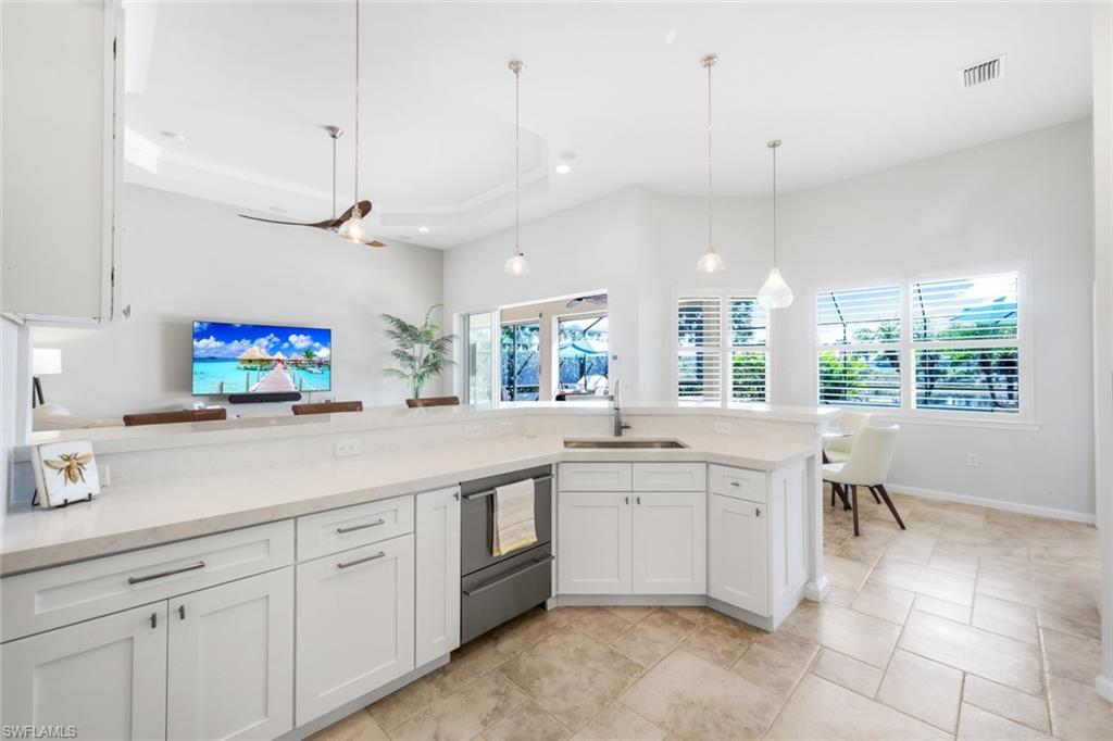 Welcome to the gorgeous, EXTENSIVELY RENOVATED, AND UPDATED dream home you've been searching for, in the prestigious gated lakefront community of The Quarry. *Be sure to explore every corner of this stunning home with our immersive 3D virtual tour*. This home has it all. Starting with the exterior, this homesite boasts that highly sought after southern exposure lakefront location everyone desires, along with exclusive access to the Quarry's one of a kind boating lake. This home shows off a new flat style roof and color matched ELECTRIC Remote Controlled roll down hurricane shutters on all openings and windows. New exterior paint coordinates with the new roof for flawless curb appeal and style in an updated color palette. An oversized lanai and pool area with water views complete the perfect ambiance for enjoying your best life in Naples. Heading inside, this remodeled, updated designer interior is a stunner. The light filled floor plan is a 3 bedroom plus den, flex area (with custom hideaway doors) and 2 full bathrooms. The kitchen features an oversized custom island, backsplash, and all new stainless steel appliances, finished off with all new cabinetry and quartz countertops. Beautiful new LVP flooring covers the living areas and bedrooms, fresh carpet for the master bedroom, and fresh new paint completes the look through the interior of the home. The garage was also included in the upgrades, with a new coordinating modern epoxy finish. A new and upgraded HVAC will be sure to keep you feeling comfortable at all times. The Quarry is the ultimate active lifestyle community where world class amenities go far beyond the fairways. Boating with launch area and slips available. A recent beach club renovation is ready to wow you with included access to pickleball, tennis, state of the art fitness and wellness center, resort style pool and lap pool, (golf membership is optional). Beach side restaurants and bars for formal and casual options, green space, a social director, activities, and beach lounging in front of the areas largest lake with amazing water views. Don't miss the chance to enjoy the best of everything in one exceptional home. Schedule a showing today and start living the resort lifestyle you've always dreamed of.