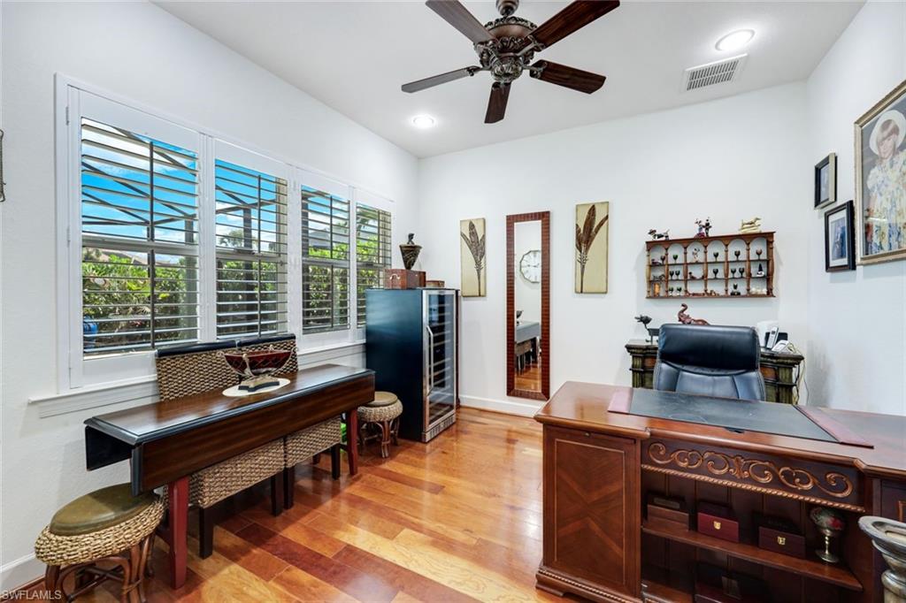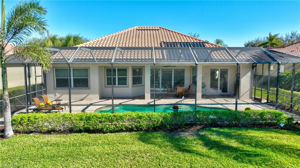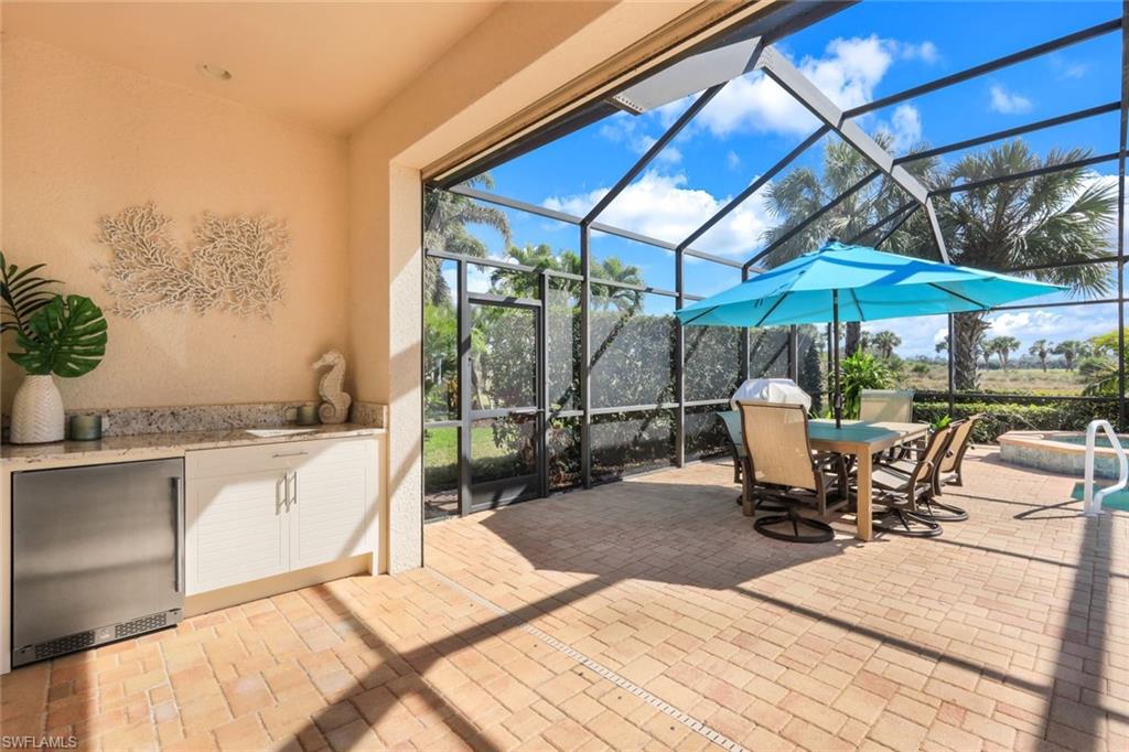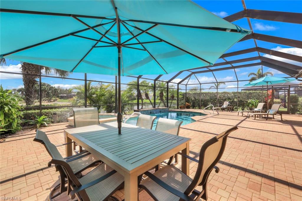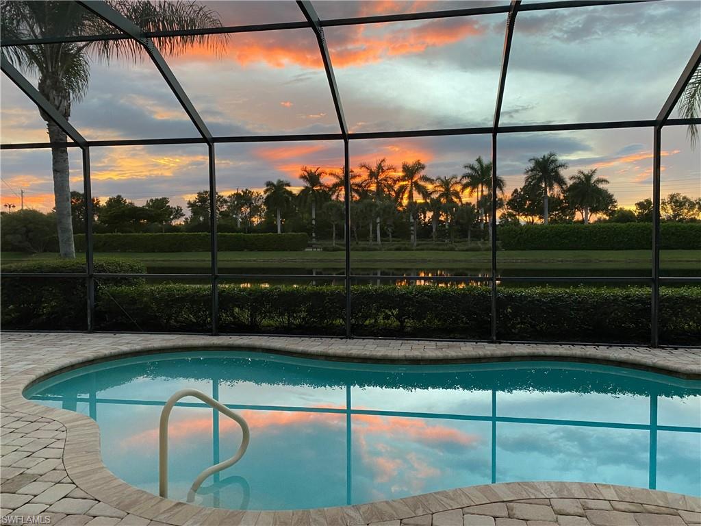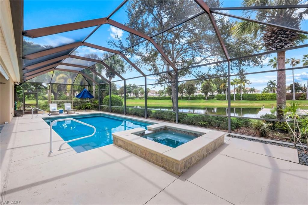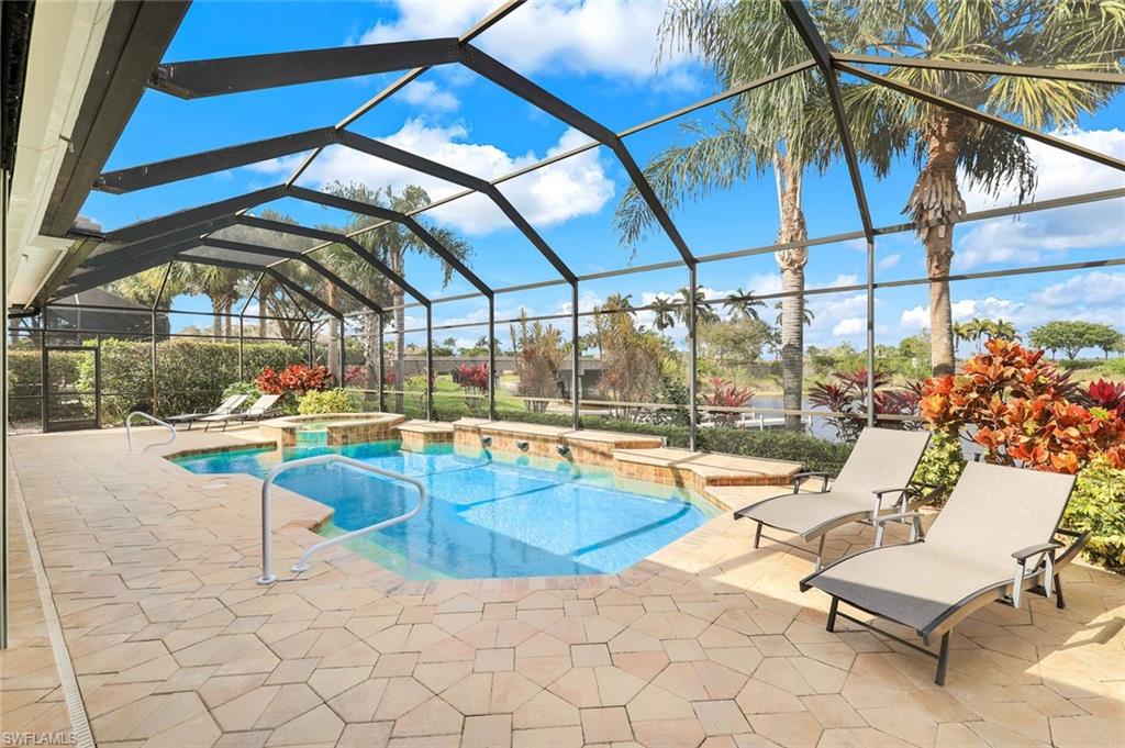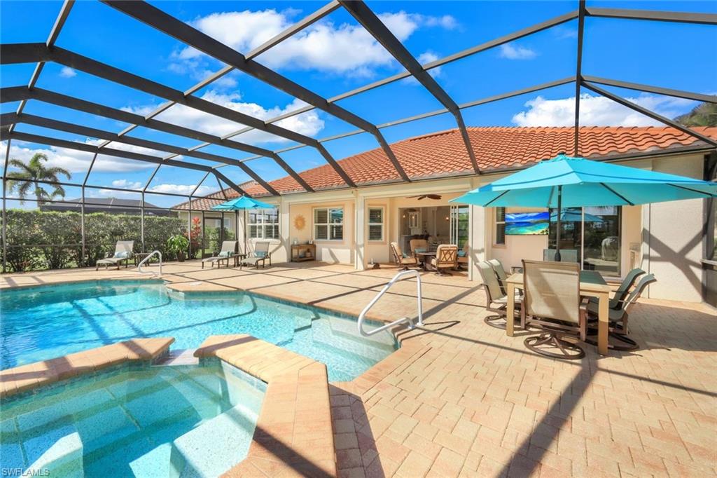 Start living the dream today! Move in ready and WATCH SUNRISE GOLF AND SUNSET LAKE PICTURESQUE VIEWS from the southern exposure while you enjoy a light filled paradise in between. This stunning single-family home is just under 2600 square feet and offers 3 bedrooms plus a den, 2.5 bathrooms, and a 2-car garage. The highlight of this property is the in-ground pool with a spa on an oversized extended lanai, perfect for relaxing and entertaining guests on those warm Florida days. The newly renovated kitchen includes stainless-steel appliances and quartz countertops, making it a chef's paradise with plenty of counter space and storage. The den is conveniently located in the rear of the home with pool, lake, and golf course views and features a murphy bed, perfect for accommodating overnight guests. Electric Hurricane shutters on all windows, plantation shutters and crown molding throughout are just a few more upgrades that this home offers. The natural beauty of Southwest Florida is evident everywhere in The Quarry with incredible nature preserves, abundant wildlife, and expansive lakes. Stone Lake is one of the few navigable lakes in Southwest Florida where residents enjoy boating, water skiing, and kayaking. The Quarry also has a lap pool, resort pool, fitness and wellness center, tennis, pickleball and bocce. Dining at its finest is available at the Indoor/Outdoor restaurant and Tiki Bar. In addition, optional golf memberships are offered at the privately owned Quarry Golf Club. Designed by world-renowned architectural team of Dr. Michael Hurdzan and Dana Fry in 2007, this Par 72 championship golf course offers an exceptional golf experience with spectacular views. This home truly has it all and is ready for you to move in and start making memories. Don't miss out on this incredible opportunity to own a piece of paradise in The Quarry!