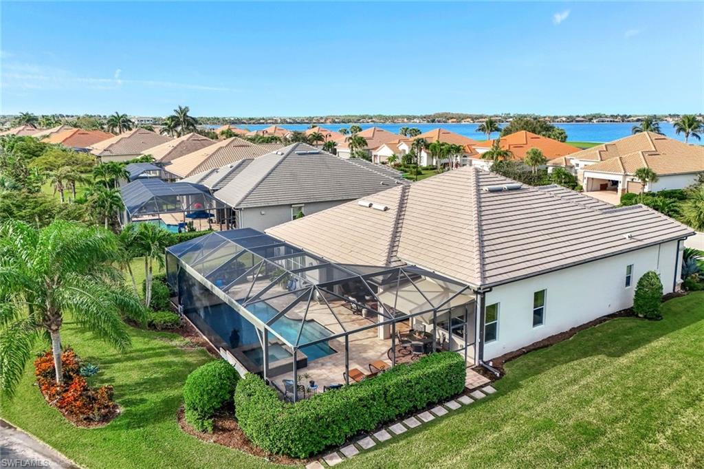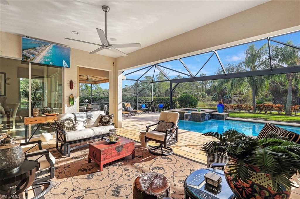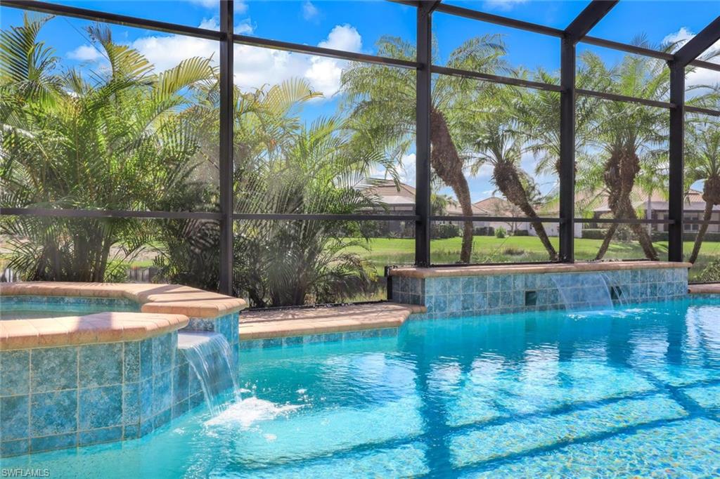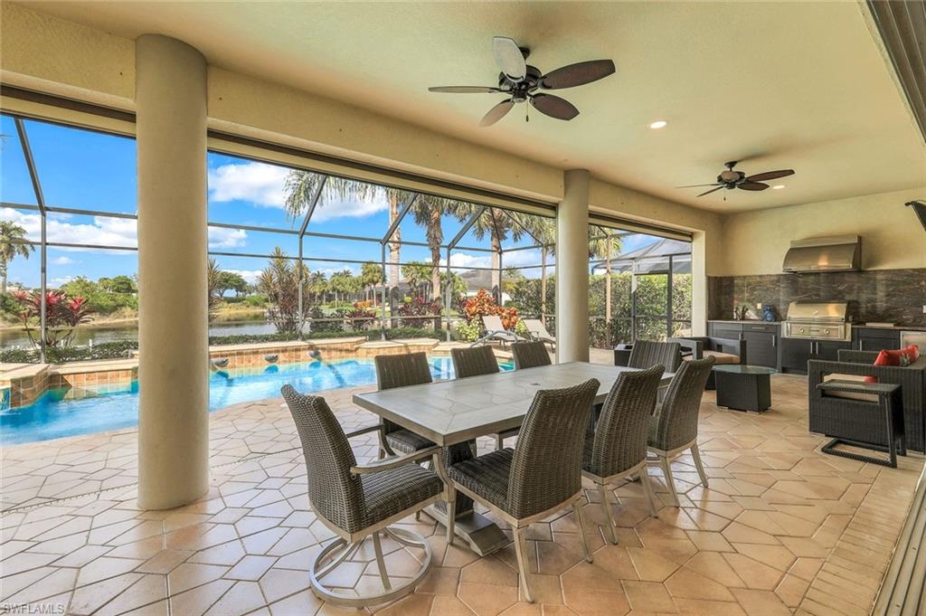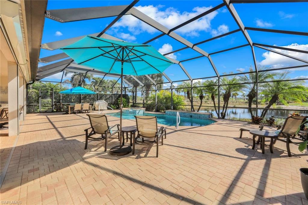 LIVE A VACATION LIFESTYLE IN A COUNTRY CLUB SETTING! This customized, spacious home features 3 BEDROOMS PLUS A DEN, 3 FULL BATHS, A RARE 4 CAR AIR CONDITIONED GARAGE and is situated on an oversized pie-shaped lot. This exceptional home is perfect for entertaining friends and family. Step outside to your private resort-style lanai, where a saltwater infinity pool and spa await - enhanced with breathtaking fire and water features, a picture window screen for unobstructed water views, and elegant marble travertine tile. The custom outdoor kitchen is fully equipped with an oversized stove, grill, sink, dishwasher, refrigerator, blender and plenty of built in storage, while the outdoor shower, nebula lighting, and lush landscaping add the perfect finishing touches to your outdoor oasis. Inside, enjoy a bright layout with porcelain tile and hardwood flooring throughout (no carpet), quartz countertops, a farm-style sink and custom tray ceilings. A long list of special features and upgrades include an air conditioned 4 car garage ideal for car collectors, boats, or a home gym, newer tile roof (2019), newer water heater (2024), newer HVAC (2021), custom outdoor landscaping and lighting throughout, freshly painted inside and out, electric storm and accordian shutters throughout, 500 gallon propane tank for heating the pool and spa plus more! This home is a "must see" to appreciate the finishing touches. The Quarry—an exceptional lakefront community sprawled across over 500 acres of pristine lakes. This gated, amenity-rich environment is perfect for boating, water skiing, jet skiing, kayaking, and fishing enthusiasts. Enjoy the Beach Club, which features a resort pool, lap pool, hot tub, tennis, pickleball, and bocce courts, a Tiki bar with poolside food and beverage service, a state-of-the-art wellness center, and a full-time activities director who organizes a variety of social events. There is also NO WAITLIST for OPTIONAL golf membership to The Quarry Golf Lodge and a NEW Limited-time 3-year payment plan available for the PGA-level Hurdzan-Frye 18-hole golf course. Whether you are an avid golfer or simply want the lifestyle without the obligation, discover The Quarry!