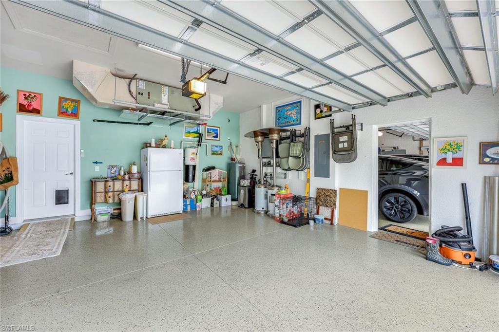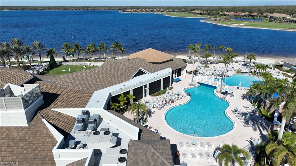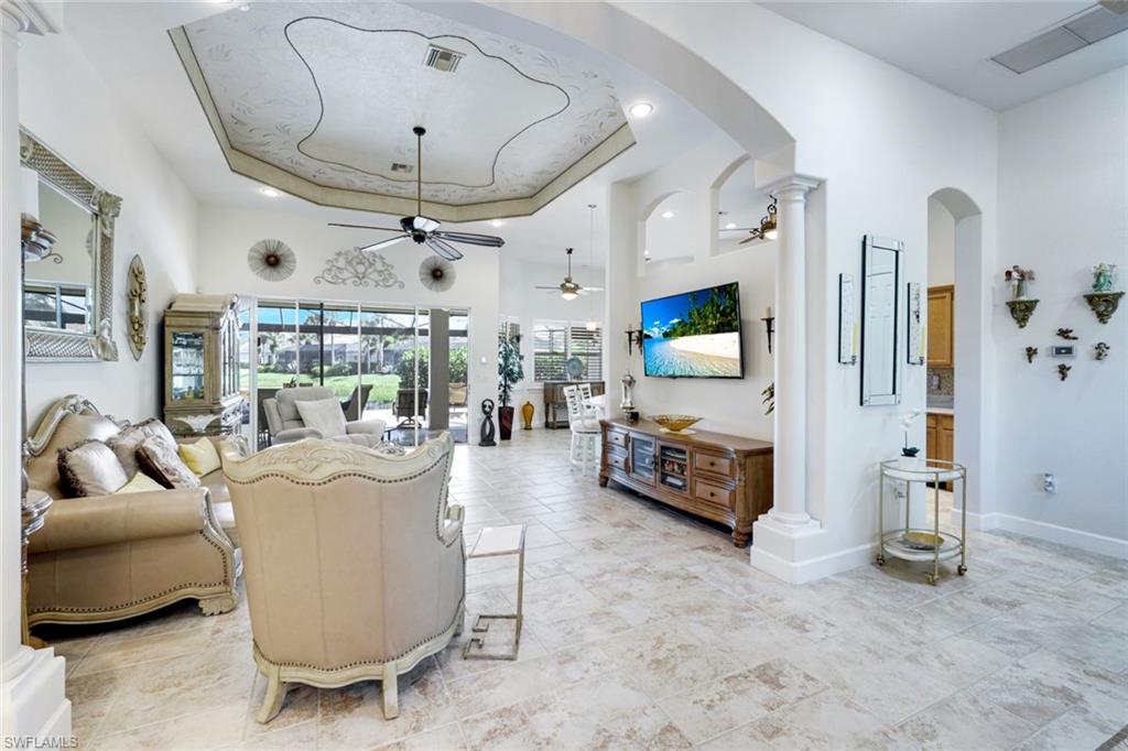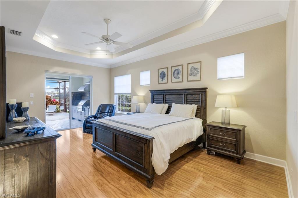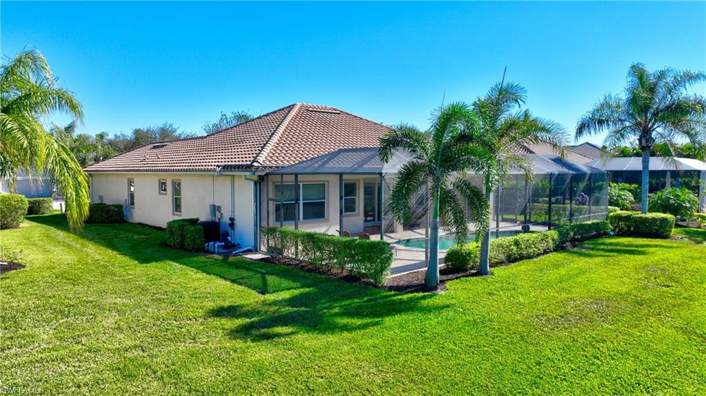 LIVE A VACATION LIFESTYLE IN A COUNTRY CLUB SETTING! This customized, spacious home features 3 BEDROOMS PLUS A DEN, 3 FULL BATHS, A RARE 4 CAR AIR CONDITIONED GARAGE and is situated on an oversized pie-shaped lot. This exceptional home is perfect for entertaining friends and family. Step outside to your private resort-style lanai, where a saltwater infinity pool and spa await - enhanced with breathtaking fire and water features, a picture window screen for unobstructed water views, and elegant marble travertine tile. The custom outdoor kitchen is fully equipped with an oversized stove, grill, sink, dishwasher, refrigerator, blender and plenty of built in storage, while the outdoor shower, nebula lighting, and lush landscaping add the perfect finishing touches to your outdoor oasis. Inside, enjoy a bright layout with porcelain tile and hardwood flooring throughout (no carpet), quartz countertops, a farm-style sink and custom tray ceilings. A long list of special features and upgrades include an air conditioned 4 car garage ideal for car collectors, boats, or a home gym, newer tile roof (2019), newer water heater (2024), newer HVAC (2021), custom outdoor landscaping and lighting throughout, freshly painted inside and out, electric storm and accordian shutters throughout, 500 gallon propane tank for heating the pool and spa plus more! This home is a "must see" to appreciate the finishing touches. The Quarry—an exceptional lakefront community sprawled across over 500 acres of pristine lakes. This gated, amenity-rich environment is perfect for boating, water skiing, jet skiing, kayaking, and fishing enthusiasts. Enjoy the Beach Club, which features a resort pool, lap pool, hot tub, tennis, pickleball, and bocce courts, a Tiki bar with poolside food and beverage service, a state-of-the-art wellness center, and a full-time activities director who organizes a variety of social events. There is also NO WAITLIST for OPTIONAL golf membership to The Quarry Golf Lodge and a NEW Limited-time 3-year payment plan available for the PGA-level Hurdzan-Frye 18-hole golf course. Whether you are an avid golfer or simply want the lifestyle without the obligation, discover The Quarry!