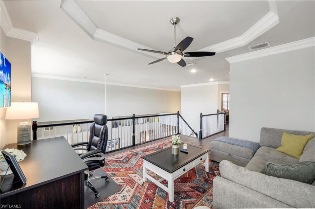 Experience a Vacation Lifestyle in a Country Club Setting! Walk to the amenity-rich Beach Club from this meticulously remodeled FURNISHED home featuring 4 bedrooms, loft office/sitting area and an extended 2-car garage. Nestled on a quiet cul-de-sac on a spacious, premium pie-shaped lot with southern exposure, the home offers breathtaking views of both water and the golf course. Boasting exceptional curb appeal, this home is surrounded by lush landscaping that creates a welcoming and picturesque entrance. Upon arrival, you are welcomed by an elegant stone facade, complemented by a custom front entry door and matching garage door. Inside, enjoy stunning views of the serene waters and the 16th hole of the golf course. The renovated kitchen is bright and airy, showcasing white quartz countertops, sleek white cabinetry, and stainless steel appliances. The expansive primary suite provides direct access to the lanai and boasts a luxurious bathroom. The second floor hosts two additional bedrooms along with a versatile flex room that functions as a home office and a cozy additional living space, all while offering spectacular views. Step outside to the lanai to a tropical retreat featuring a pool and spa. Additional high-end finishes include crown molding throughout, tray ceilings, luxury laminate flooring in the main living areas and stairs, and porcelain plank tile in the bathrooms—each detail meticulously crafted for your enjoyment. This home is equipped with impact windows and doors throughout for your peace of mind. This home is a "must-see" to appreciate its exquisite finishing touches. This gated, amenity-rich environment is perfect for boating, water skiing, jet skiing, kayaking, and fishing enthusiasts. Enjoy the Beach Club, which features a resort pool, lap pool, hot tub, tennis, pickleball, and bocce courts, a Tiki bar with poolside food and beverage service, a state-of-the-art wellness center, and a full-time activities director who organizes a variety of social events. There is also NO WAITLIST for OPTIONAL golf membership to The Quarry Golf Lodge and a NEW Limited-time 3-year payment plan available for the PGA-level Hurdzan-Frye 18-hole golf course. Whether you are an avid golfer or simply want the lifestyle without the obligation, discover The Quarry!