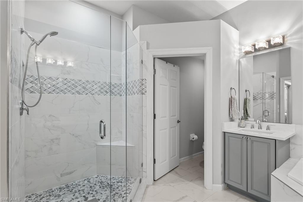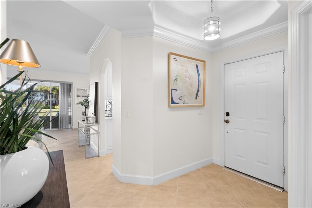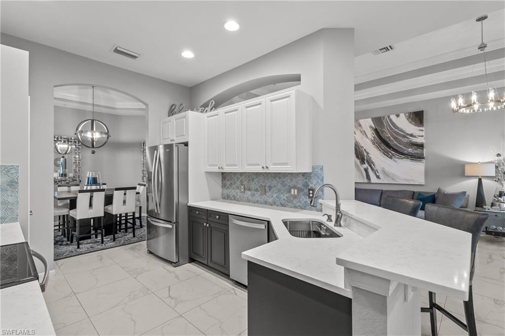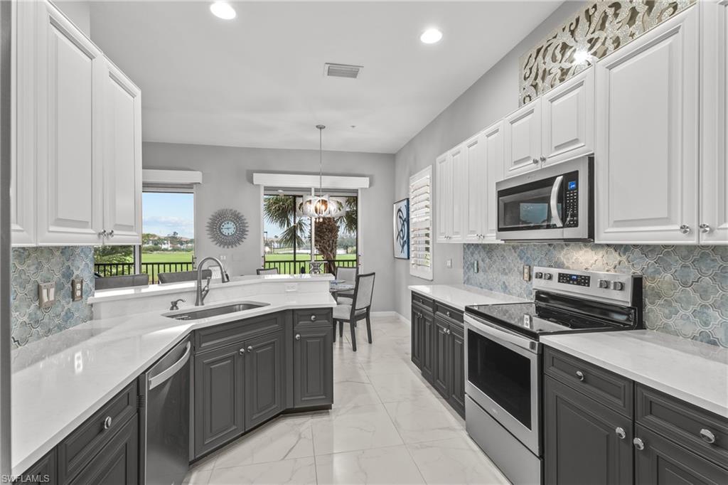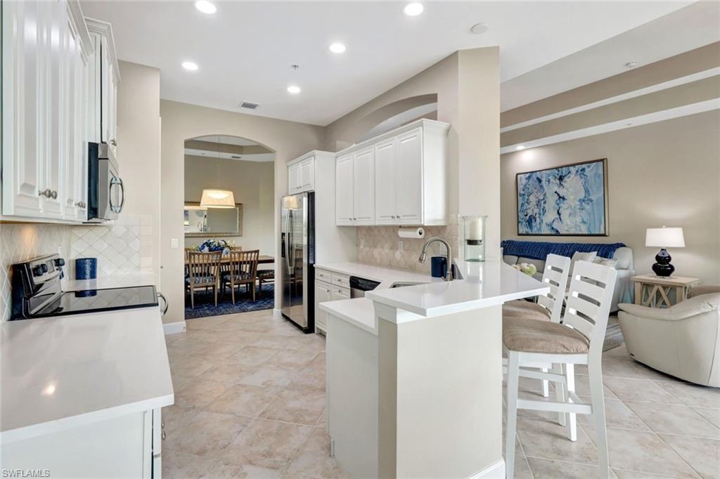 LIVE A VACATION LIFESTYLE IN THE QUARRY! This BETTER THAN NEW first floor end unit coach home features 2 Bedrooms plus Den, 2 Baths, and attached 2 car garage and is situated overlooking the 18th fairway & lake and is just steps away from both clubhouses. Recently renovated from top to bottom, this spacious condo offers a great room style floorplan with two sets of sliding glass doors to the lanai where one can watch the boats go by and enjoy the warm Naples weather. A long list of special features include: BRAND NEW quartz countertops in the kitchen, baths, and laundry room including new sinks; BRAND NEW kitchen tile backsplash; BRAND NEW plantation shutters on all windows; BRAND NEW ceilings fans & bath lighting throughout; FRESHLY PAINTED interior/garage walls and cabinets including NEW cabinet hardware; NEW AC (2022); NEW Stainless Steel Appliances (2023); two walk in showers with frameless shower enclosure in the Master Bath; diagonal tile & engineered hardwood floors throughout (no carpet); and more! Furniture & decor package available! The Quarry is a unique lakefront community offering something for everyone: Boating, Golf, Tennis, Pickleball, Bocce, Tiki Bar, Restaurant, Pool-Side Food/Drink Service, Fitness/health center, Social Activities, and more! The Quarry offers a lifestyle like no other at the BRAND NEW "Lake Lodge & Beach Club", over 500 acres of navigable lakes (boat slips available for lease), and a private 18 hole Golf Club (social/golf memberships 100% optional and available).