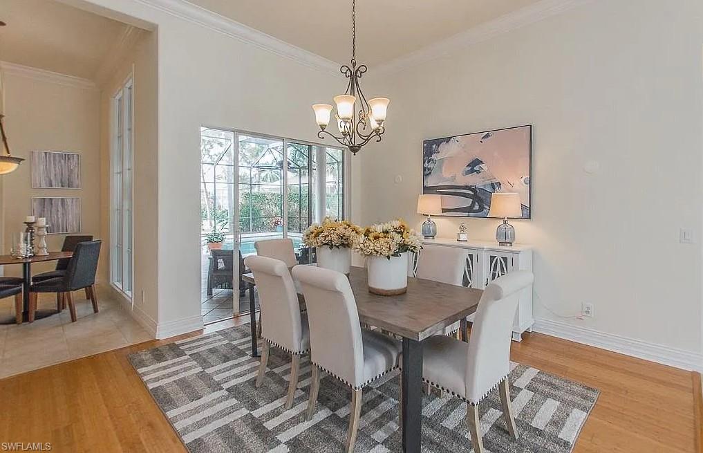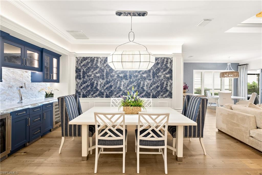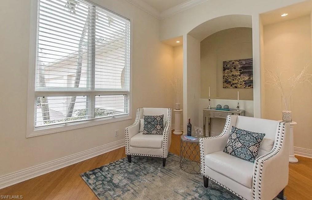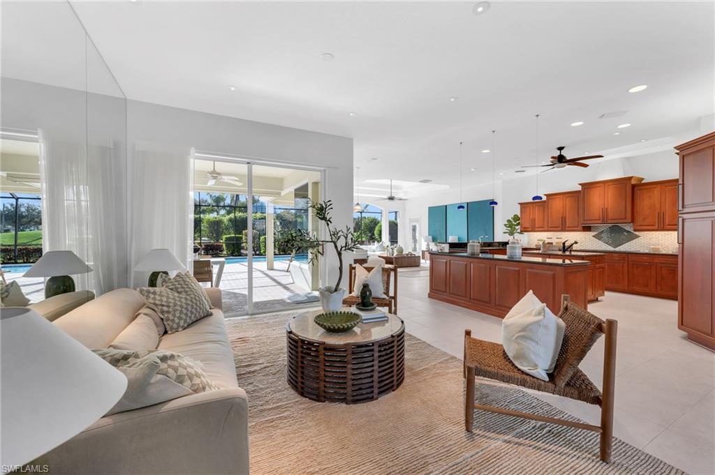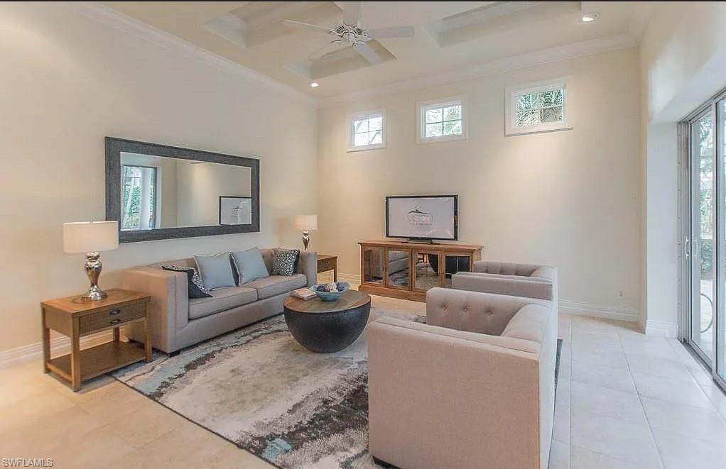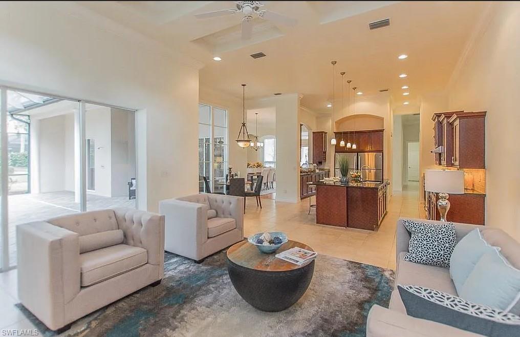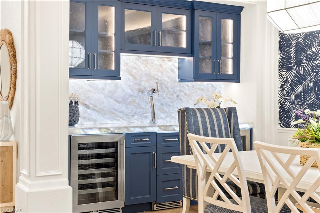 This stunning residence has been completely reimagined by the award winning team at Design West and presents a true “close today and entertain tomorrow” opportunity. Every detail of this three-bedroom plus den, South-facing pool home has been professionally curated and finished to the highest of standards, creating one of the most exceptional turnkey offerings here in Naples. Interiors showcase DuChateau hardwood flooring, a Cristallo Italian backlit quartzite wine bar, designer furnishings and window treatments, striking wallcoverings, custom ceiling inlays, refined lighting, and luxurious accessories that harmonize seamlessly throughout the entire property. The gourmet kitchen, dining, and great room flow effortlessly for entertaining, complete with custom chandeliers, area rugs, and accent furnishings. The primary suite includes a full Design West furnishing package with custom closets, wallcoverings, rug, lighting, and a wood ceiling inlay, while guest rooms and baths are equally tailored with coordinated furniture, mirrors, and finishes. Peace of mind comes with a brand-new tile roof (2019), electronic hurricane shutters with accordion shutters on remaining windows, and a custom epoxy-finished garage with cabinetry plus an extended bay for a golf cart. Outdoor living is equally refined, with a south-facing saltwater pool, sectional seating, dining areas, and designer furnishings overlooking tranquil golf course views. Offered fully furnished and accessorized, this home represents the most effortless and sophisticated move-in experience available in The Strand. Residents enjoy resort-style amenities including a full-service spa, pickleball, tennis, bocce, dining, an active social calendar, and 27 holes of championship golf. Schedule your private tour today to experience the best of Naples living.