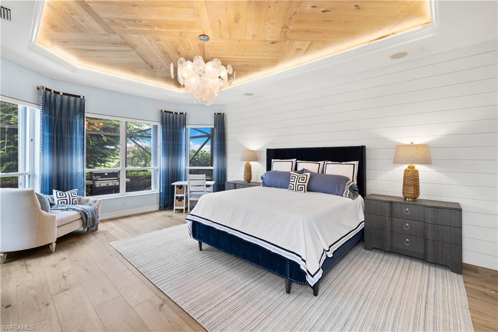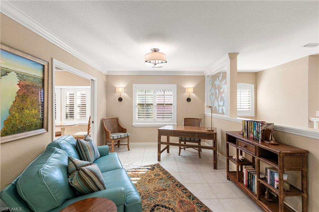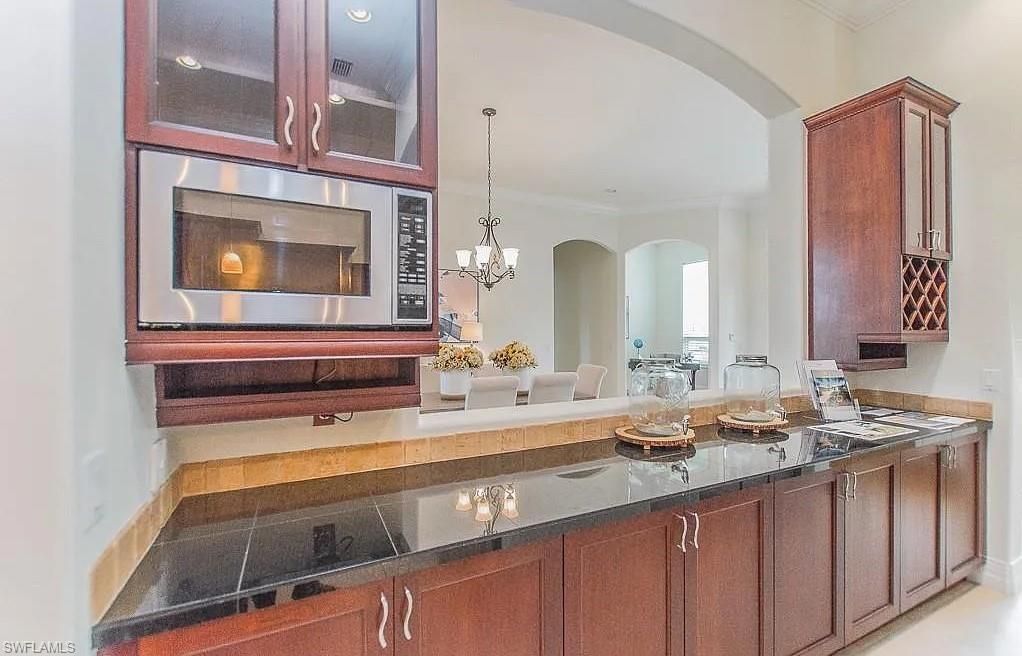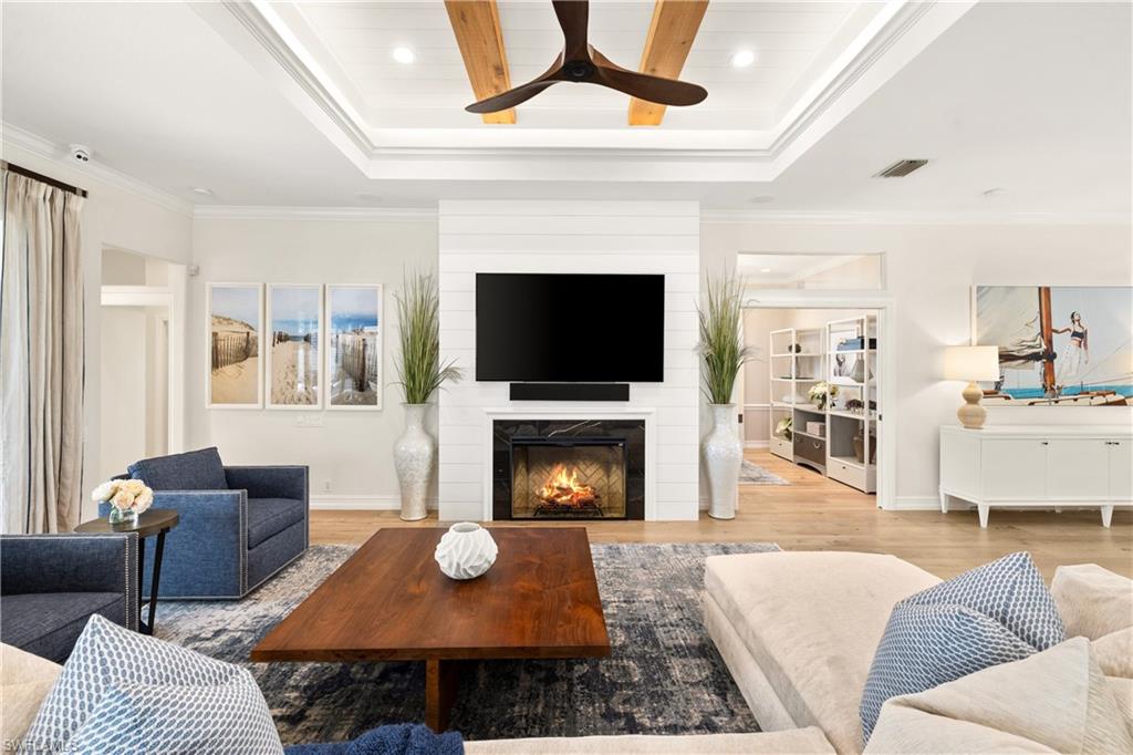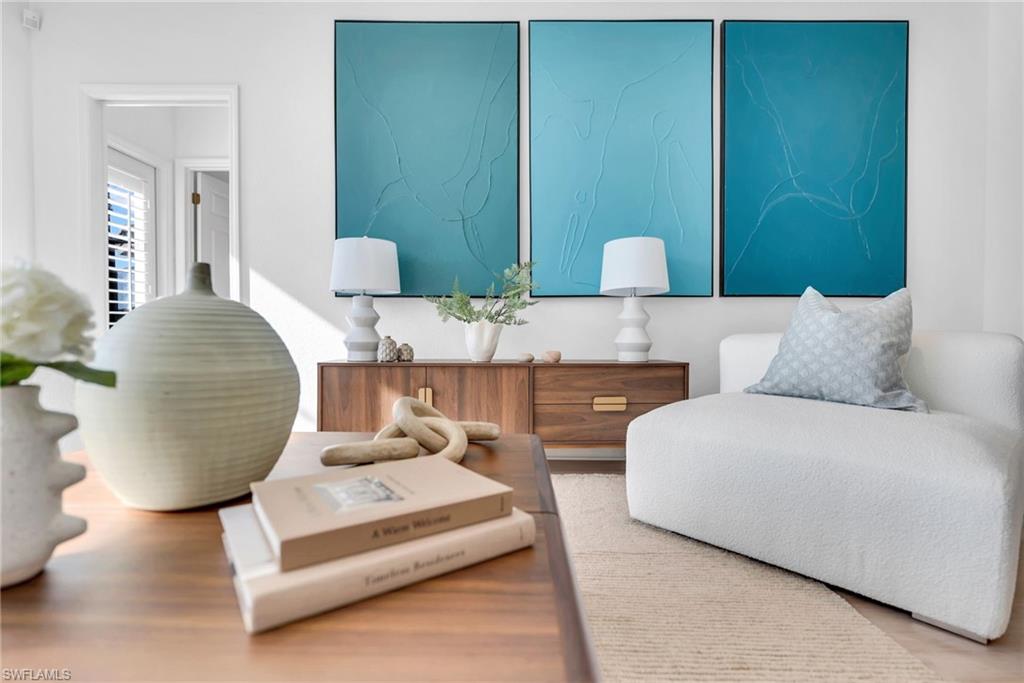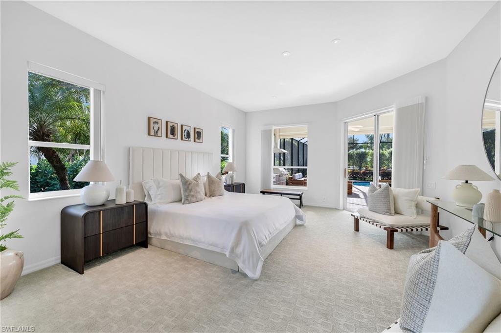 This stunning residence has been completely reimagined by the award winning team at Design West and presents a true “close today and entertain tomorrow” opportunity. Every detail of this three-bedroom plus den, South-facing pool home has been professionally curated and finished to the highest of standards, creating one of the most exceptional turnkey offerings here in Naples. Interiors showcase DuChateau hardwood flooring, a Cristallo Italian backlit quartzite wine bar, designer furnishings and window treatments, striking wallcoverings, custom ceiling inlays, refined lighting, and luxurious accessories that harmonize seamlessly throughout the entire property. The gourmet kitchen, dining, and great room flow effortlessly for entertaining, complete with custom chandeliers, area rugs, and accent furnishings. The primary suite includes a full Design West furnishing package with custom closets, wallcoverings, rug, lighting, and a wood ceiling inlay, while guest rooms and baths are equally tailored with coordinated furniture, mirrors, and finishes. Peace of mind comes with a brand-new tile roof (2019), electronic hurricane shutters with accordion shutters on remaining windows, and a custom epoxy-finished garage with cabinetry plus an extended bay for a golf cart. Outdoor living is equally refined, with a south-facing saltwater pool, sectional seating, dining areas, and designer furnishings overlooking tranquil golf course views. Offered fully furnished and accessorized, this home represents the most effortless and sophisticated move-in experience available in The Strand. Residents enjoy resort-style amenities including a full-service spa, pickleball, tennis, bocce, dining, an active social calendar, and 27 holes of championship golf. Schedule your private tour today to experience the best of Naples living.