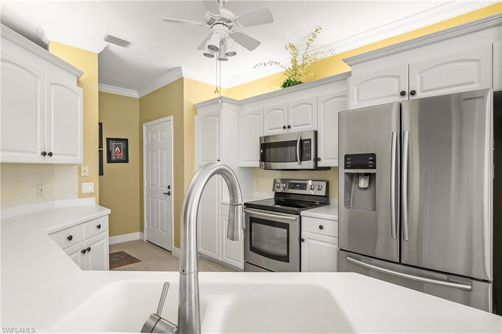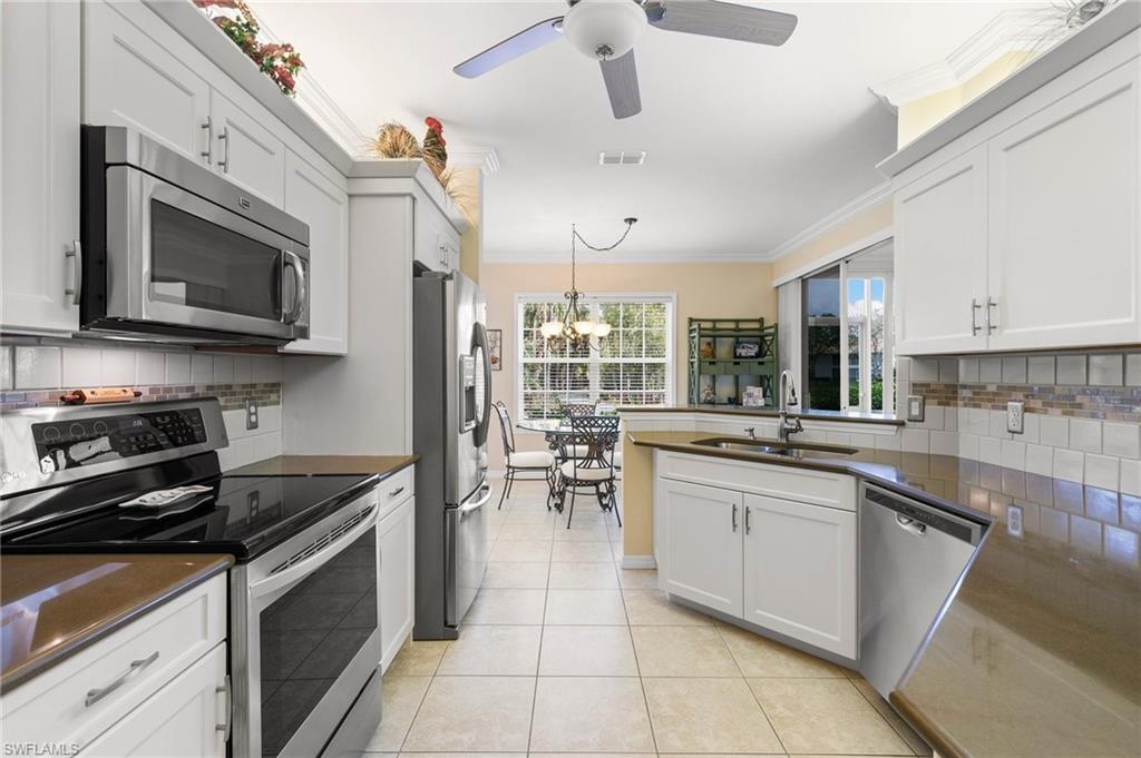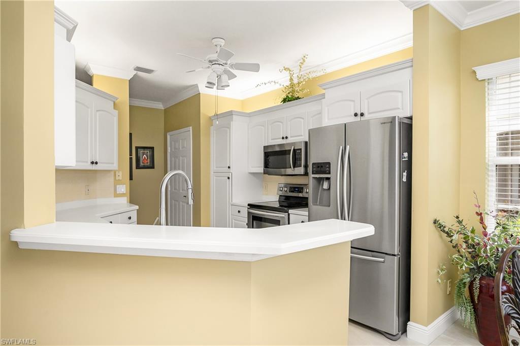Welcome to this stunning first floor property in North Naples. This home offers the pinnacle of luxury living with 24-hour security, three 9-hole golf courses, a newly renovated fitness center, multiple dining facilities, and a vibrant clubhouse for social activities. Overlooking a picturesque golf course and serene lake with a fountain, the outdoor space includes a screened lanai with hurricane shutters. The renovated kitchen and bathrooms boast custom cabinets, granite countertops, and a newly painted living/dining area, while a new dining light fixture adds a touch of elegance. Conveniently located near the Strand/Publix shopping center and just a stone's throw from breathtaking beaches and outstanding restaurants, this property is offered turnkey, making it a standout choice for your next move. BRAND NEW AC INSTALLED SEPT 2025!