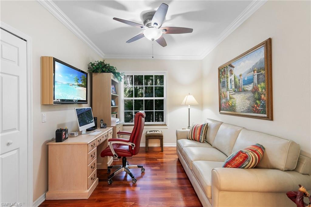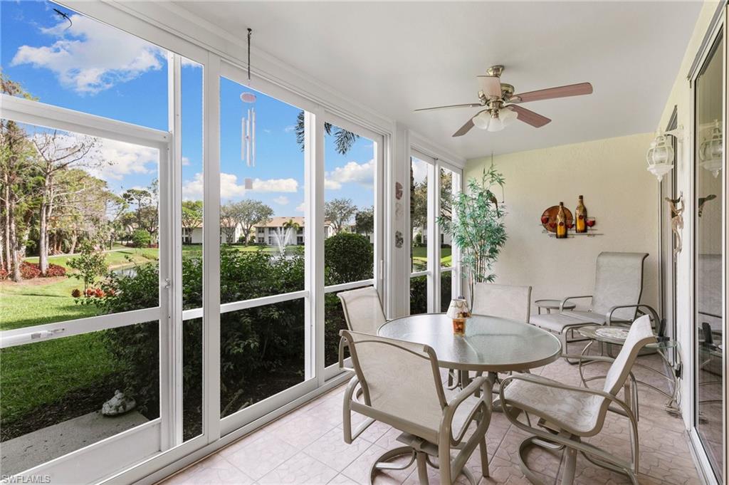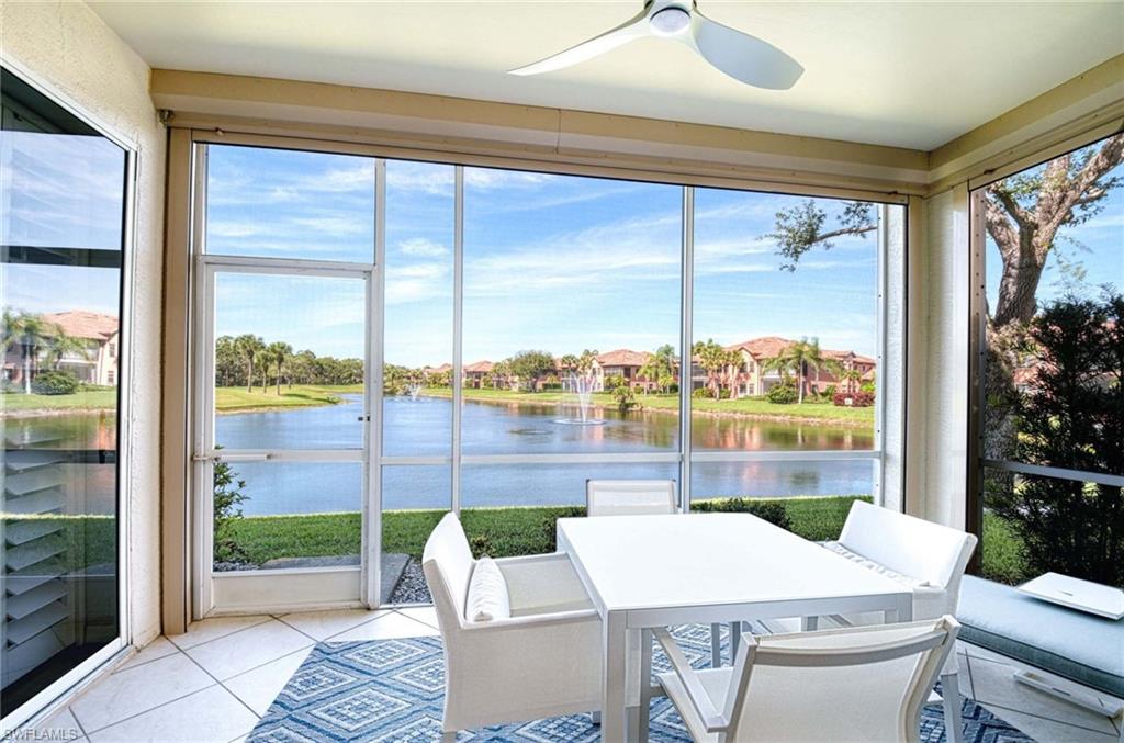Welcome to this beautifully maintained second-floor residence in the Strand that offers 2 bedrooms, 2 baths, plus a versatile den-ideal for a home office or guest space. Lovely, light and bright eat-in kitchen to enjoy your morning coffee, and open great room and dining room ideal for entertaining . The open, light-filled floor plan features wood and tile floors in the main living areas, soft carpet in the bedrooms, and an air-conditioned glass enclosed lanai that extends your living space while showcasing peaceful lake and pool views showcasing an outstanding view of our lake along with three cascading waterfalls plus pool and clubhouse. A new roof adds peace of mind. The Strand is one of Naples premier gated communities, known for its newly remodeled clubhouse, outstanding dining, golf tennis, pickleball, fitness center and endless social activities. With its prime location and resort-style amenities, this condo is the perfect blend of comfort, style and Florida living. Don’t miss this one!!!!
