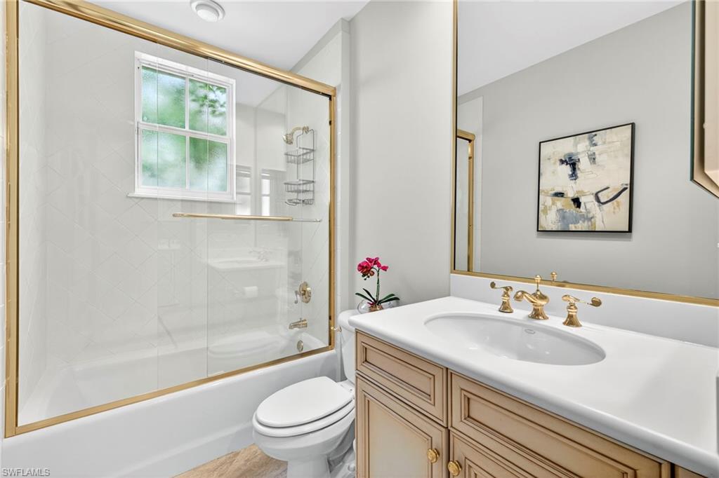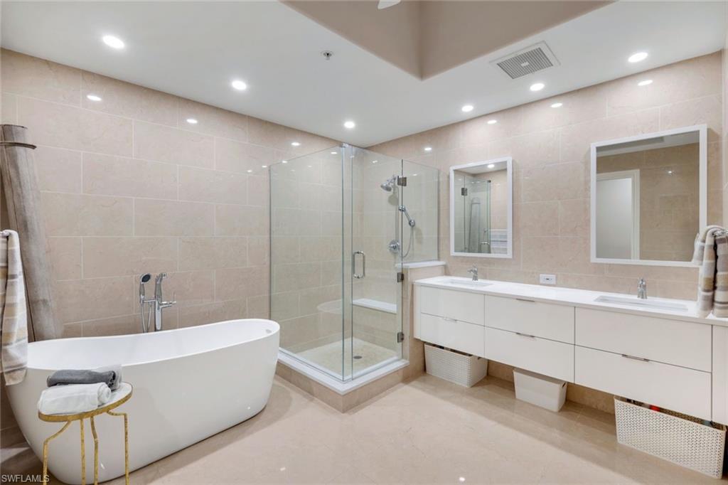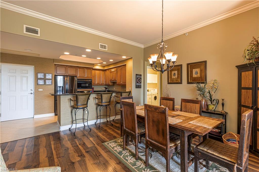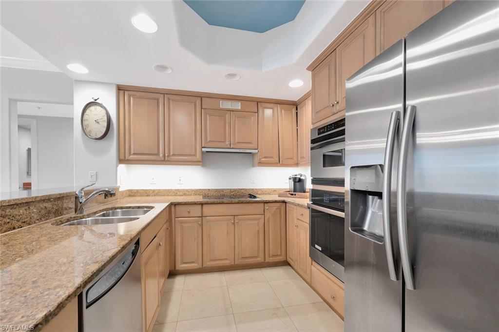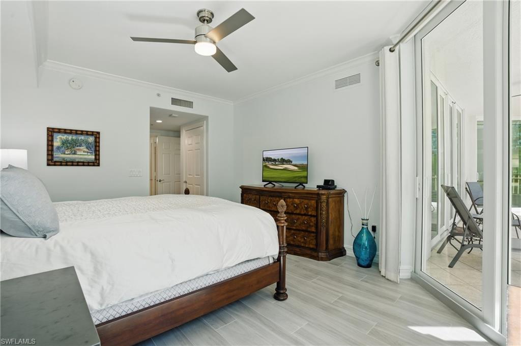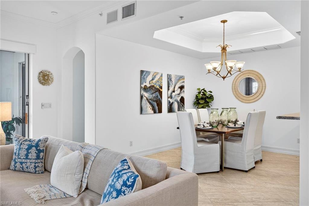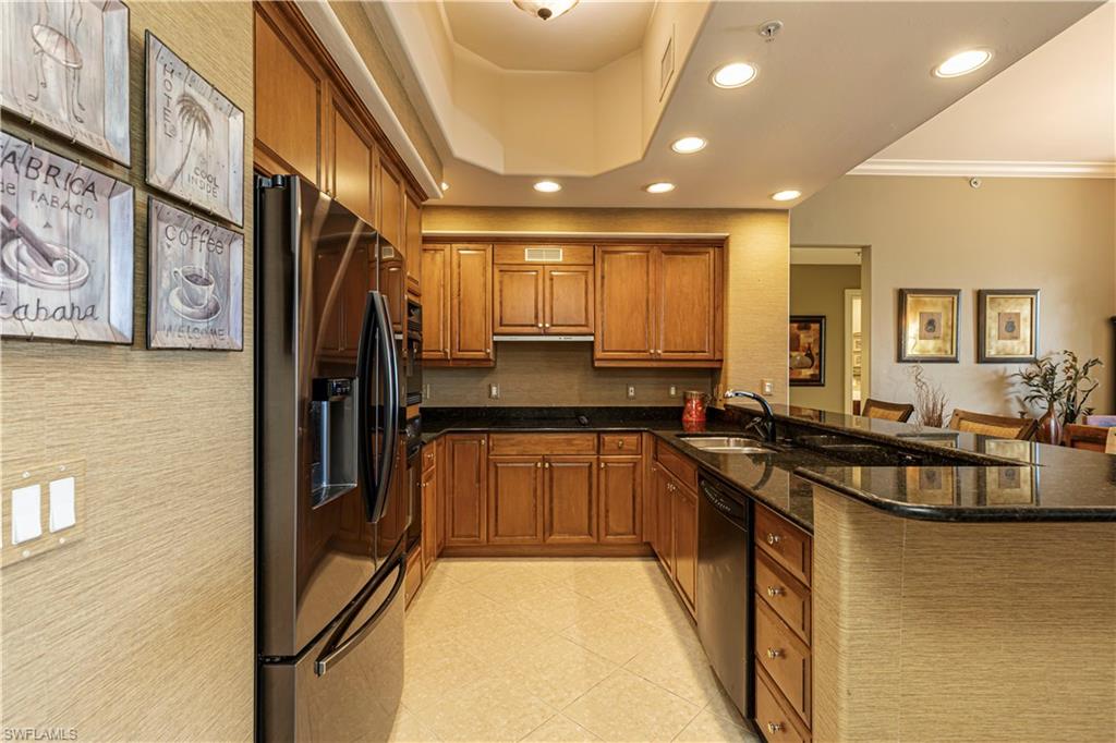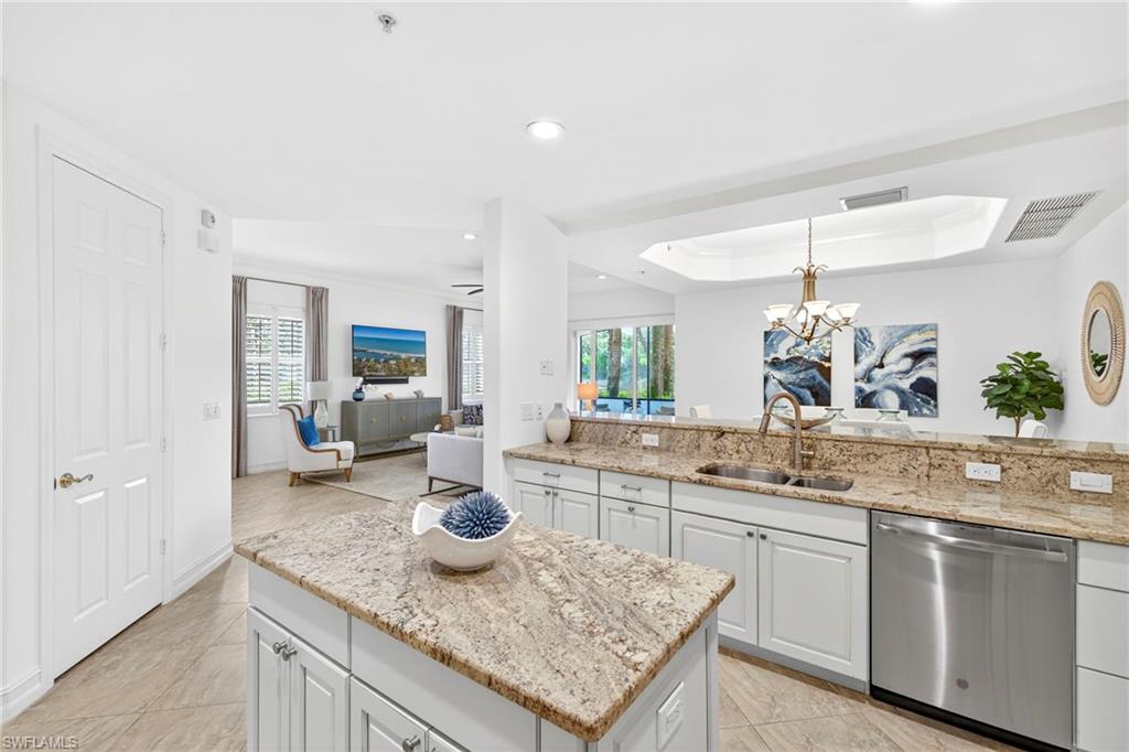 Welcome to your dream oasis in the heart of Tiburon, here in Naples Florida. This stunning two bedroom condo offers unparalleled blend of luxury and comfort, perfect for those seeking a serene lifestyle in a vibrant community. As you step inside you will be greeted by an open concept living space bathed in Natural light, thanks to large sliding glass doors that frame picturesque views of the pools, the Greg Norman designed Gold golf course, and surrounding landscape. The spacious living room features low maintenance Luxury Vinyl flooring, tasteful crown moulding creating an inviting ambiance for both relaxation and entertaining. The well laid out kitchen with black stainless steel appliances, plenty of cabinetry, and beautiful granite countertops make food prep a cinch. A large breakfast bar provides a perfect spot for casual dining, while the adjacent dining area is ideal for hosting parties with friends and family. The master suite is Large and features a walk in closet, and an en-suite bathroom that has dual sinks, a large soaking tub and a separate glass enclosed shower. The second bedroom is equally inviting with plenty of closet space as well as an easy access full bath, with a tub/shower combo. Stepping out into your screened in Lanai, you can enjoy morning coffee, or evening cocktails while enjoy beautiful golf course and pool views that truly define the beauty of Tiburon. Residents of this exclusive community can enjoy the many amenities offered, some with and without special memberships. Tiburon has a prime Naples location, being both close to the pristine beaches and upscale shopping and dining. This beautiful turnkey condo is the perfect place to call home for those seeking a luxurious and active lifestyle here in paradise. Come have a look and lets make it yours.