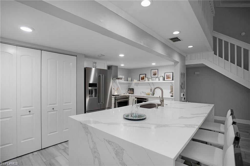 Serene Corner Townhouse in the Heart of Naples. Nestled at the back of a charming Naples community, this beautiful 3-bedroom, 3-bathroom with loft corner unit offers the perfect balance of privacy and sophistication. Enjoy tranquil yard views, extra quiet, and the sense of space that only a corner unit can provide. Step into an open-concept downstairs that creates a quaint, welcoming atmosphere. The newly renovated kitchen features all-new appliances, quartz countertops, tile backsplash, upgraded cabinets and stylish finishes. The smooth flow from kitchen, to dining, to living is perfect for entertaining or everyday living. Freshly painted interior, plantation shutters, newer carpet, and a wood-burning fireplace enhance the cozy vibe. With the primary suite and an additional bedroom on the first floor, plus a versatile open loft upstairs alongside a third bedroom and full bath, this layout suits every lifestyle. Upgrades include a new A/C, new washer and dryer, and new roof (courtesy of the HOA). Parking is a breeze with two spaces—one covered. Outdoor enjoyment is seamless, thanks to the large screened-in lanai—ideal for quiet mornings or evening gatherings—and a cozy screened-in sitting entry, perfect for welcoming guests or relaxing with a good book. Whether you're entertaining by the fireplace or enjoying the tranquility of being nestled in Naples, this open and airy townhouse is your private retreat in one of Florida's most desirable locations.
