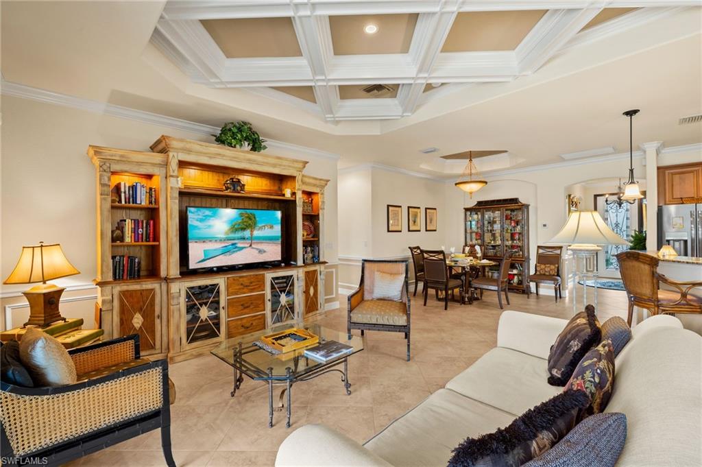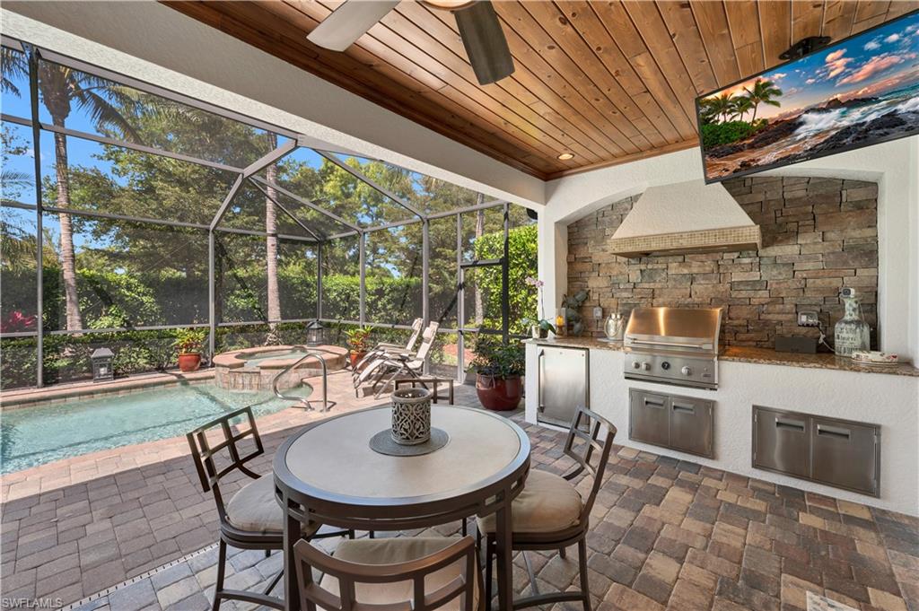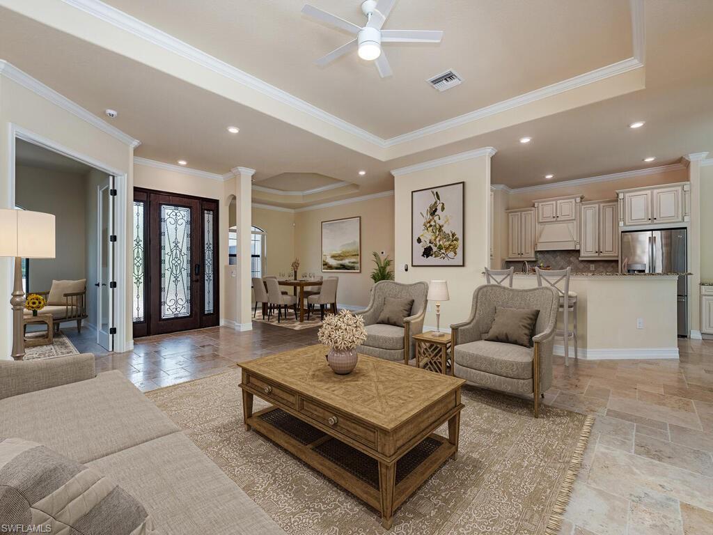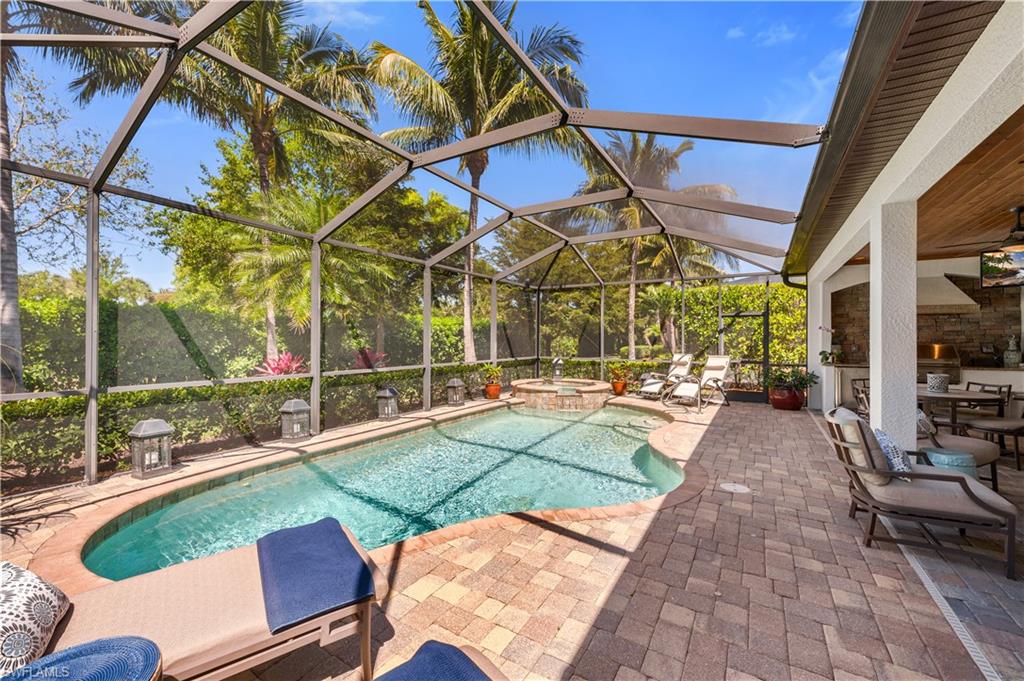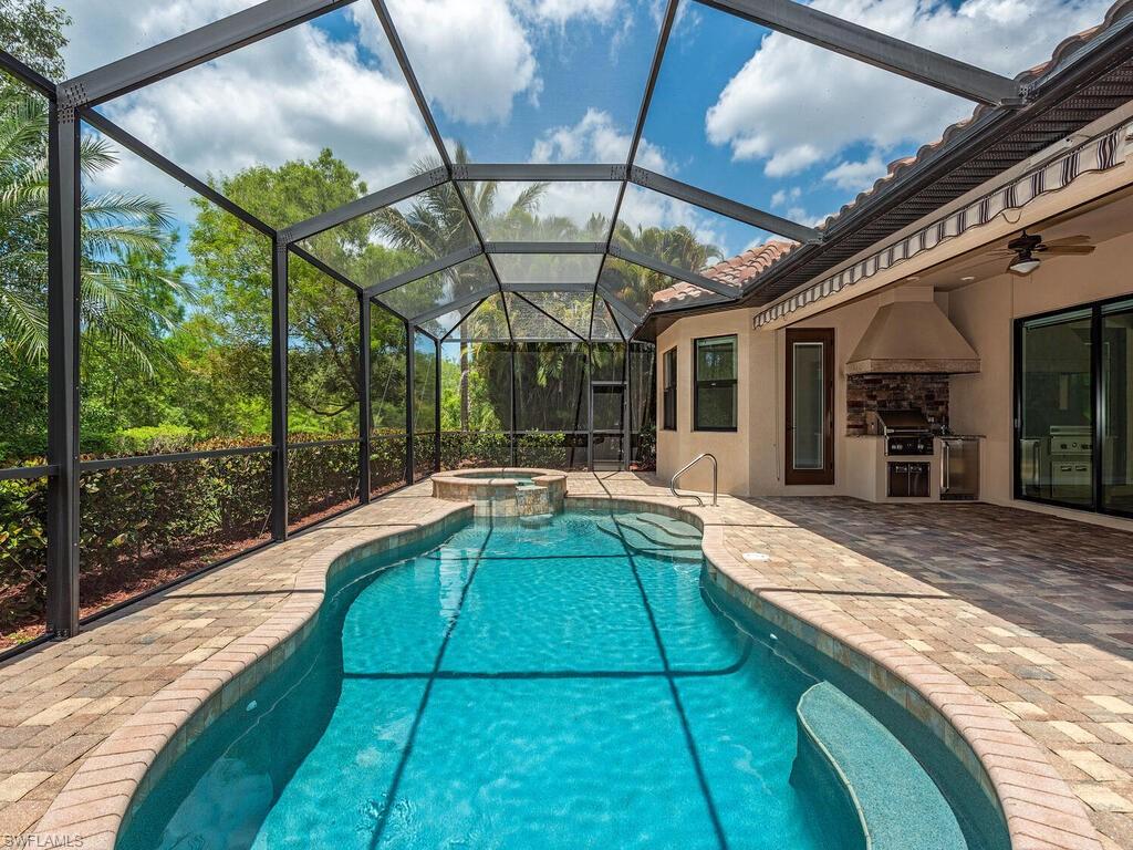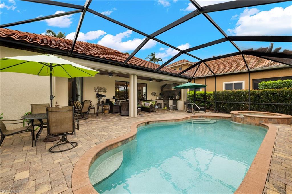 From the moment you arrive, the home’s inviting curb appeal and impact-resistant glass entry door set the tone for what lies beyond — a bright, open interior brimming with natural light and refined architectural touches. The entryway opens to soaring coffered ceilings, crisp wainscoting, and a welcoming layout that blends timeless design with modern sensibility. The kitchen, a true focal point of the home, features sleek white cabinetry, gleaming quartz countertops, and upgraded appliances — perfect for both everyday living and entertaining guests. The seamless transition from the indoor living area to the outdoor oasis through wide glass sliders creates the ideal Florida flow. Outside, a private retreat awaits. The screened lanai is complete with a built-in outdoor kitchen, a sparkling pool, and a rejuvenating spa — all framed by lush tropical landscaping for privacy and tranquility. Whether hosting friends for cocktails or enjoying a quiet evening under the stars, this is the ultimate Naples lifestyle setting. As part of Treviso Bay’s coveted social membership, residents enjoy access to the exclusive Villa Rilassare club, offering a resort-style lagoon pool, lap pool, poolside restaurant and bar, luxurious spa, fitness center, and courts for tennis, pickleball, and bocce. The TPC golf clubhouse provides additional dining, events, and community gatherings that make Treviso Bay one of Naples’ most sought-after communities. Located just five miles from Naples’ renowned white-sand beaches and the upscale shopping and dining of Fifth Avenue South, this exceptional property combines comfort, elegance, and an unbeatable location. It’s more than a home — it’s your private piece of paradise.