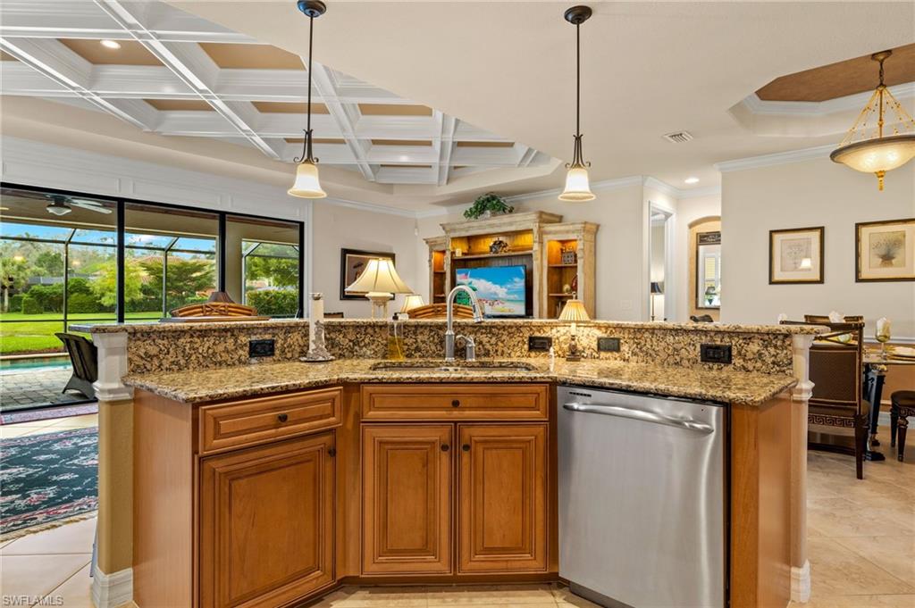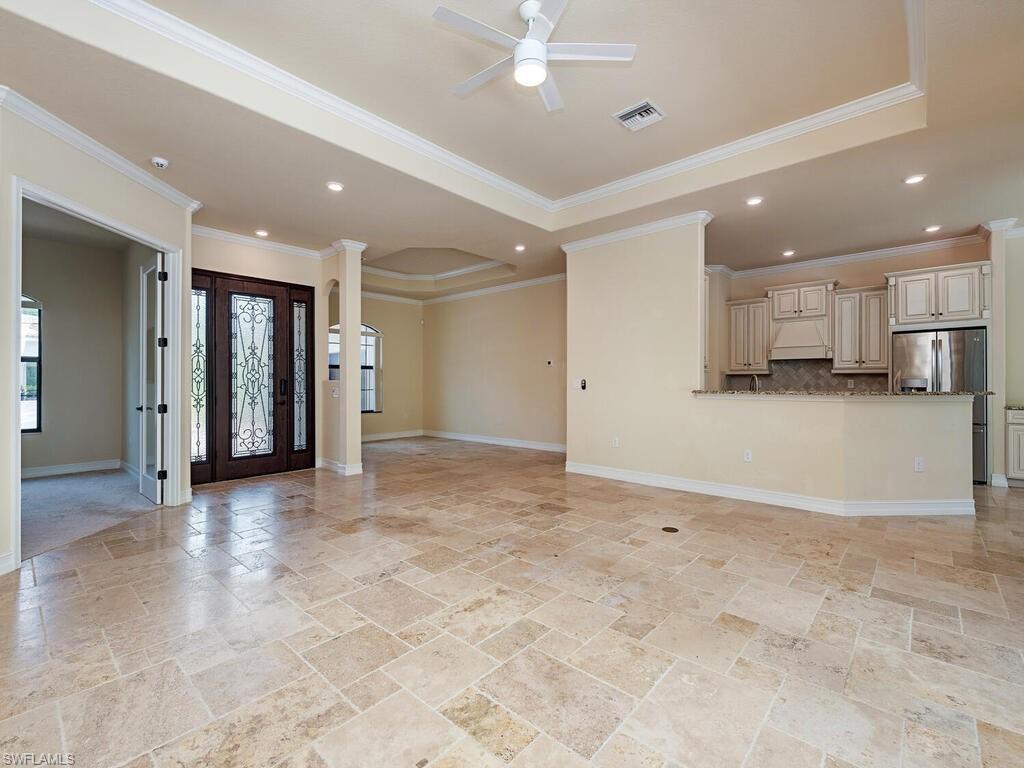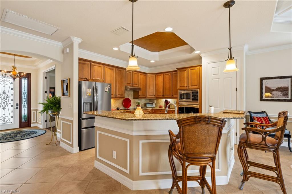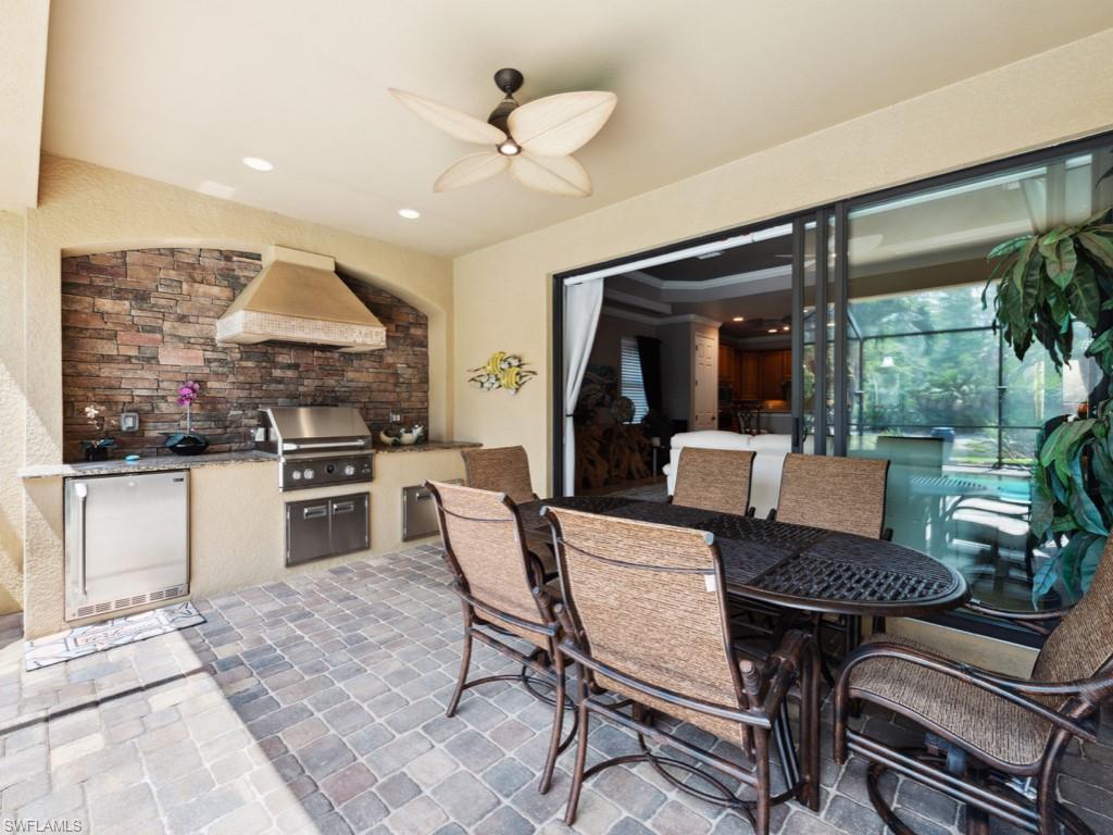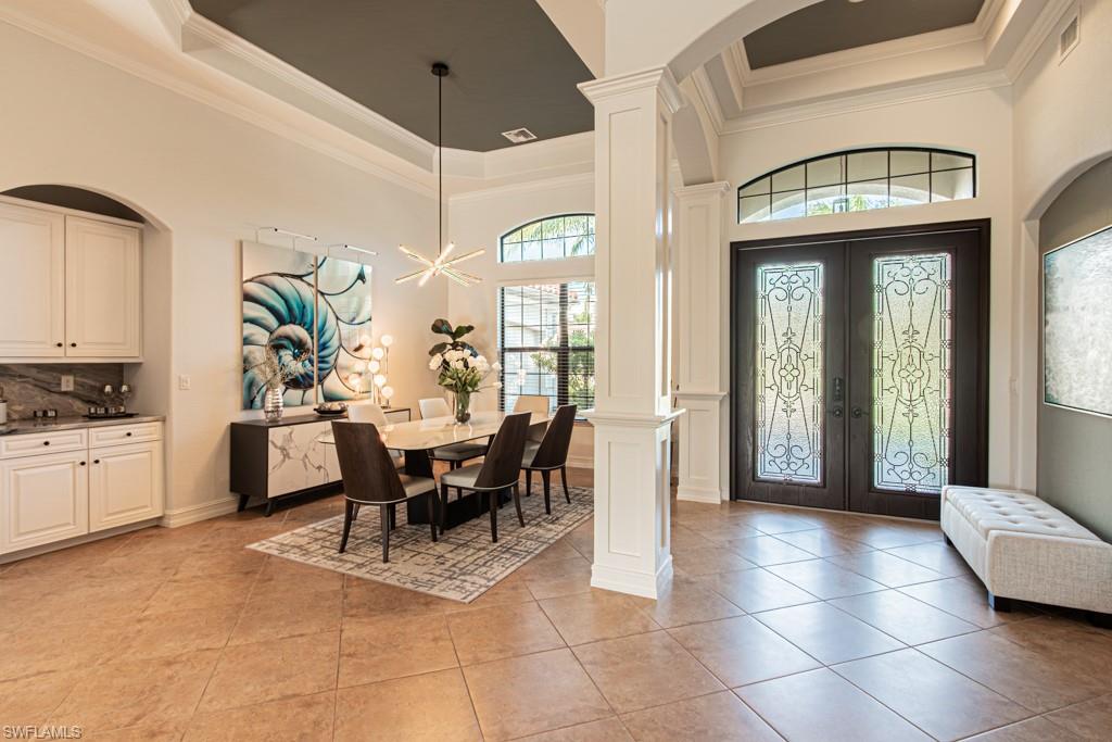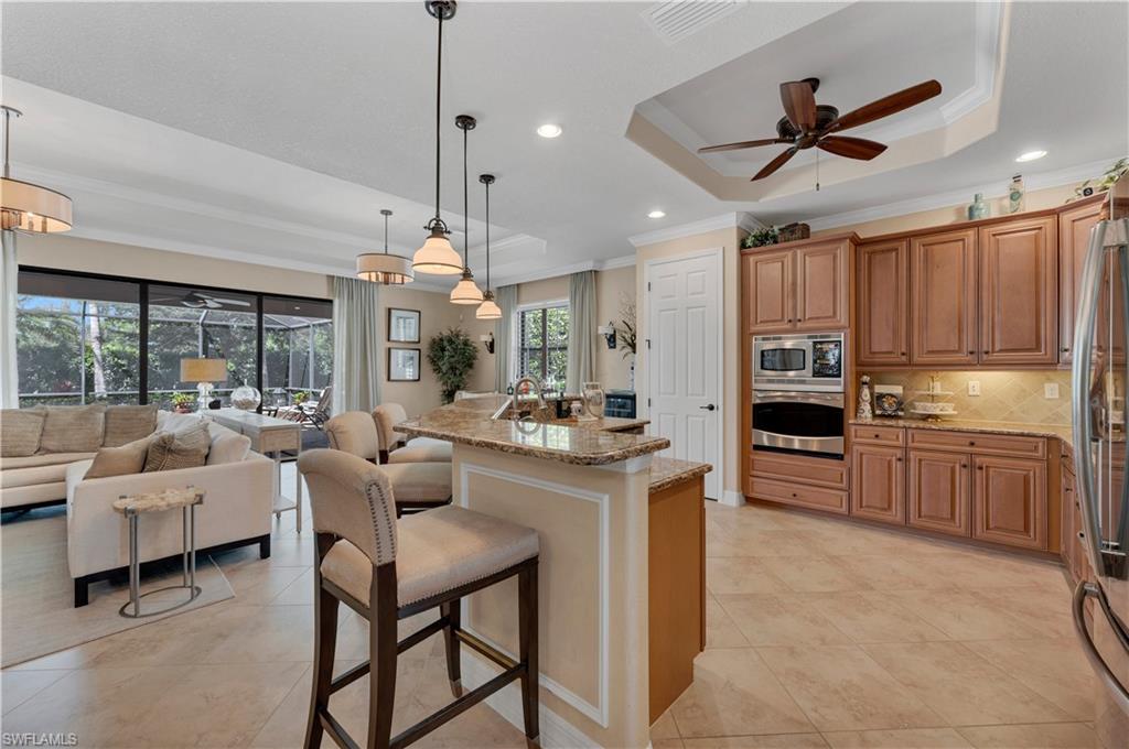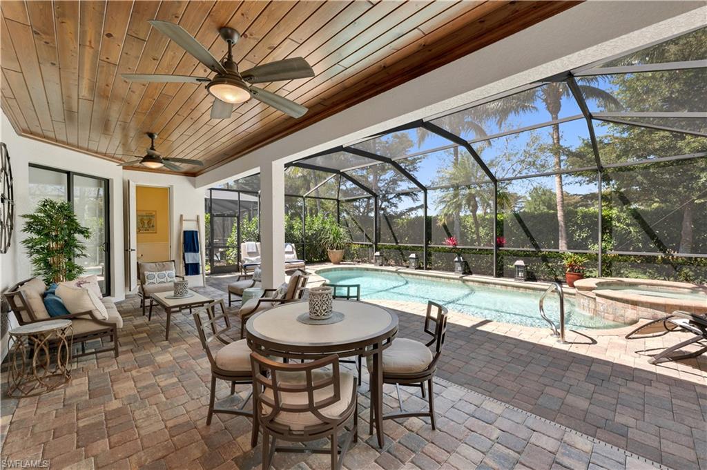 From the moment you arrive, the home’s inviting curb appeal and impact-resistant glass entry door set the tone for what lies beyond — a bright, open interior brimming with natural light and refined architectural touches. The entryway opens to soaring coffered ceilings, crisp wainscoting, and a welcoming layout that blends timeless design with modern sensibility. The kitchen, a true focal point of the home, features sleek white cabinetry, gleaming quartz countertops, and upgraded appliances — perfect for both everyday living and entertaining guests. The seamless transition from the indoor living area to the outdoor oasis through wide glass sliders creates the ideal Florida flow. Outside, a private retreat awaits. The screened lanai is complete with a built-in outdoor kitchen, a sparkling pool, and a rejuvenating spa — all framed by lush tropical landscaping for privacy and tranquility. Whether hosting friends for cocktails or enjoying a quiet evening under the stars, this is the ultimate Naples lifestyle setting. As part of Treviso Bay’s coveted social membership, residents enjoy access to the exclusive Villa Rilassare club, offering a resort-style lagoon pool, lap pool, poolside restaurant and bar, luxurious spa, fitness center, and courts for tennis, pickleball, and bocce. The TPC golf clubhouse provides additional dining, events, and community gatherings that make Treviso Bay one of Naples’ most sought-after communities. Located just five miles from Naples’ renowned white-sand beaches and the upscale shopping and dining of Fifth Avenue South, this exceptional property combines comfort, elegance, and an unbeatable location. It’s more than a home — it’s your private piece of paradise.