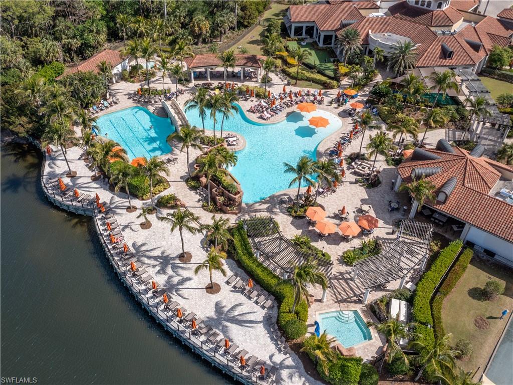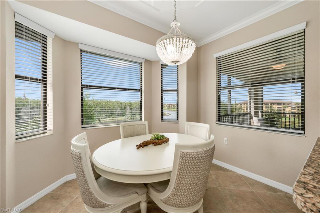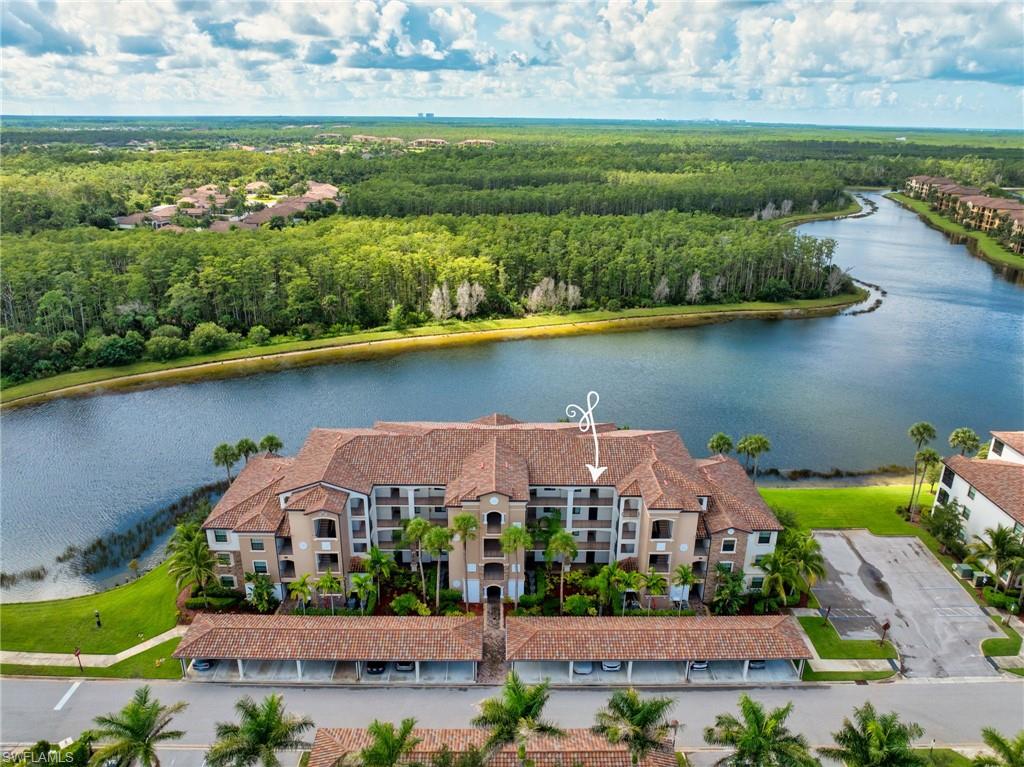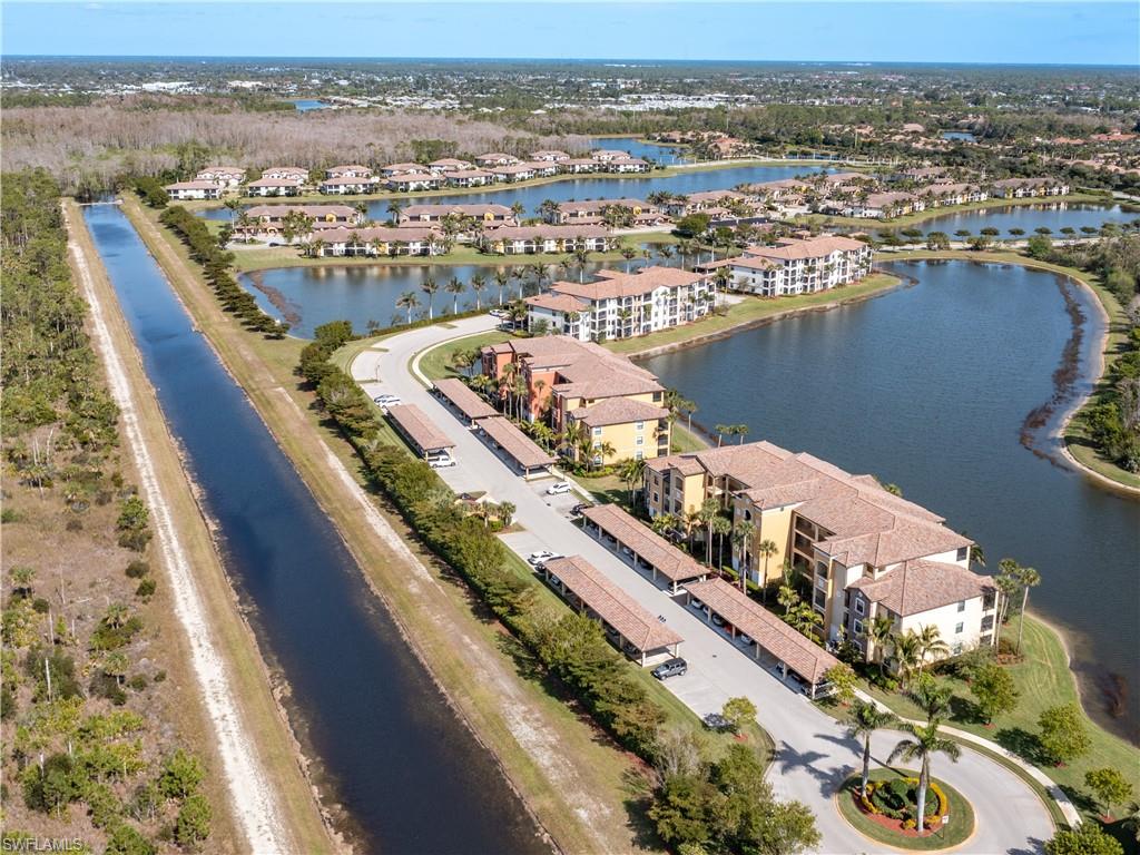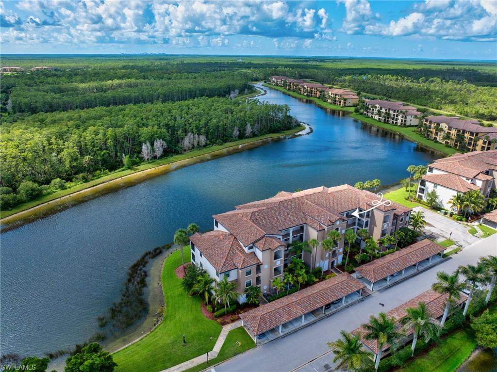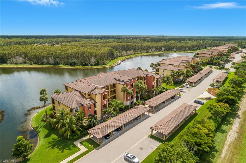 Stunning long lake views in Treviso Bay! This immaculate TOP-FLOOR BELLINI FLOOR PLAN offers a beautifully upgraded design with turnkey furnishings. The 2-bedroom, 2-bath plus FLEX ROOM layout showcases crown molding, custom built-in wall cabinetry with hidden big-screen TV, upgraded ceilings and lighting, plantation shutters, and a designer-tiled lanai for enjoying the best southwestern water views. The kitchen features stainless steel appliances, granite countertops, and breakfast bar seating. Additional perks include covered parking, extra storage, and no golf fees. Treviso Bay lives like a resort with first-class amenities: TPC golf course, clubhouse with fine dining, business center, library, social club, resort-style pools with waterfalls and bar & grill, lap pool, tennis, pickleball, bocce, fitness center, yoga studio, spa, sauna, and more. Just steps to a satellite pool, grilling area, and pickleball courts. Only 10 minutes to downtown Naples and beaches—Make this home your Florida home for the upcoming winter season!