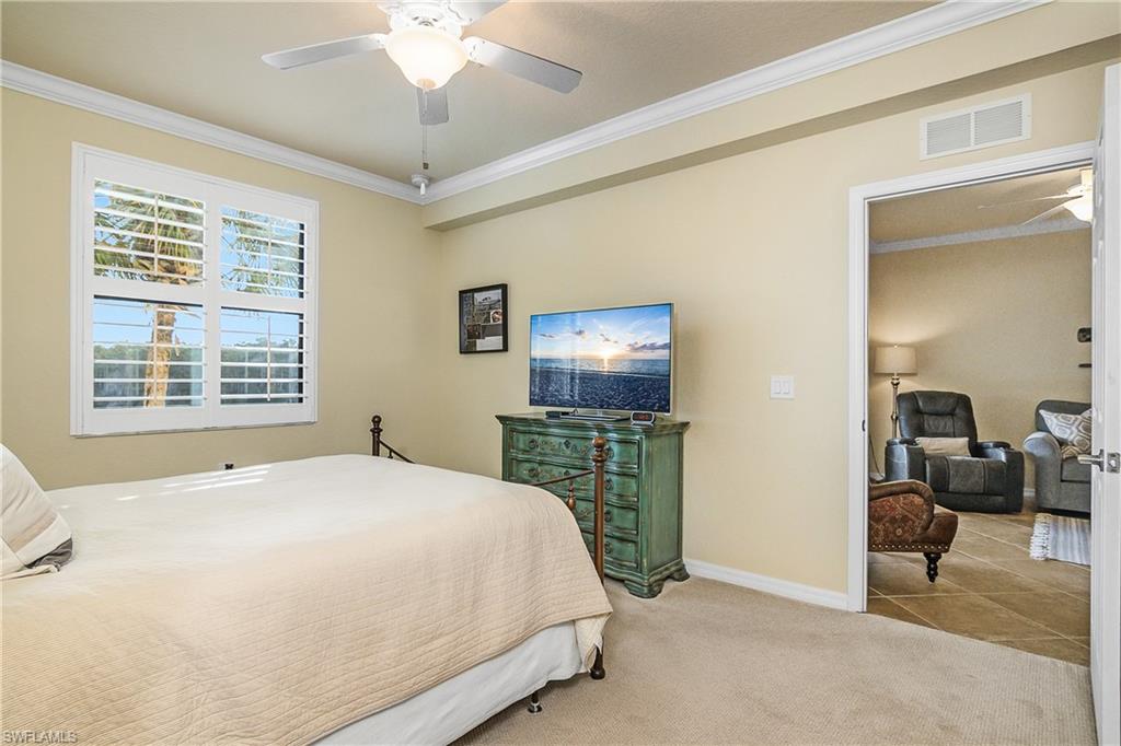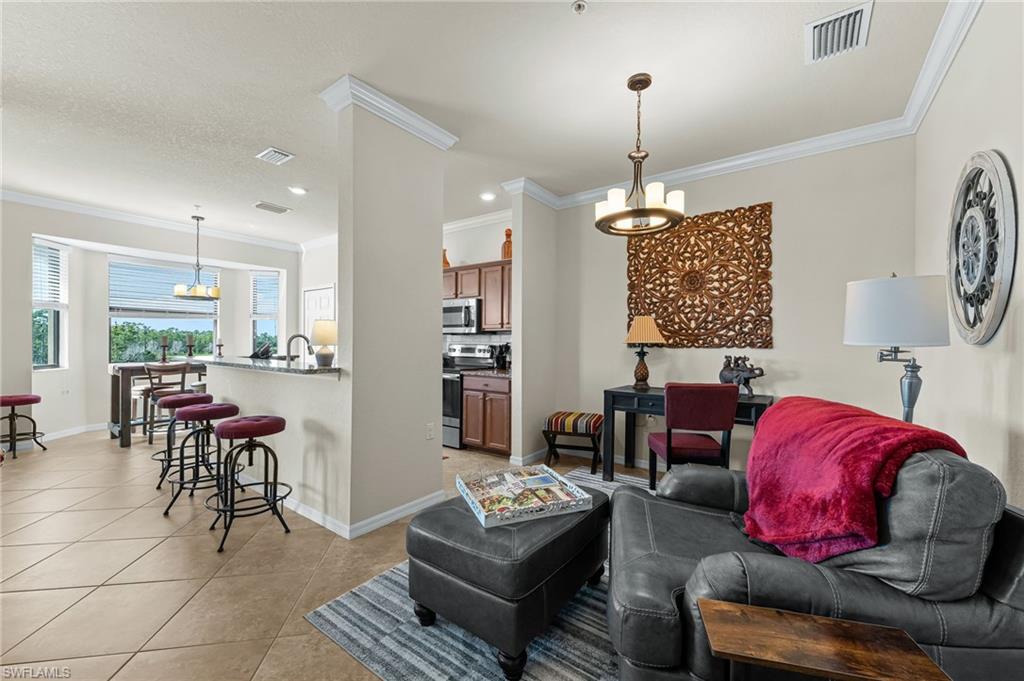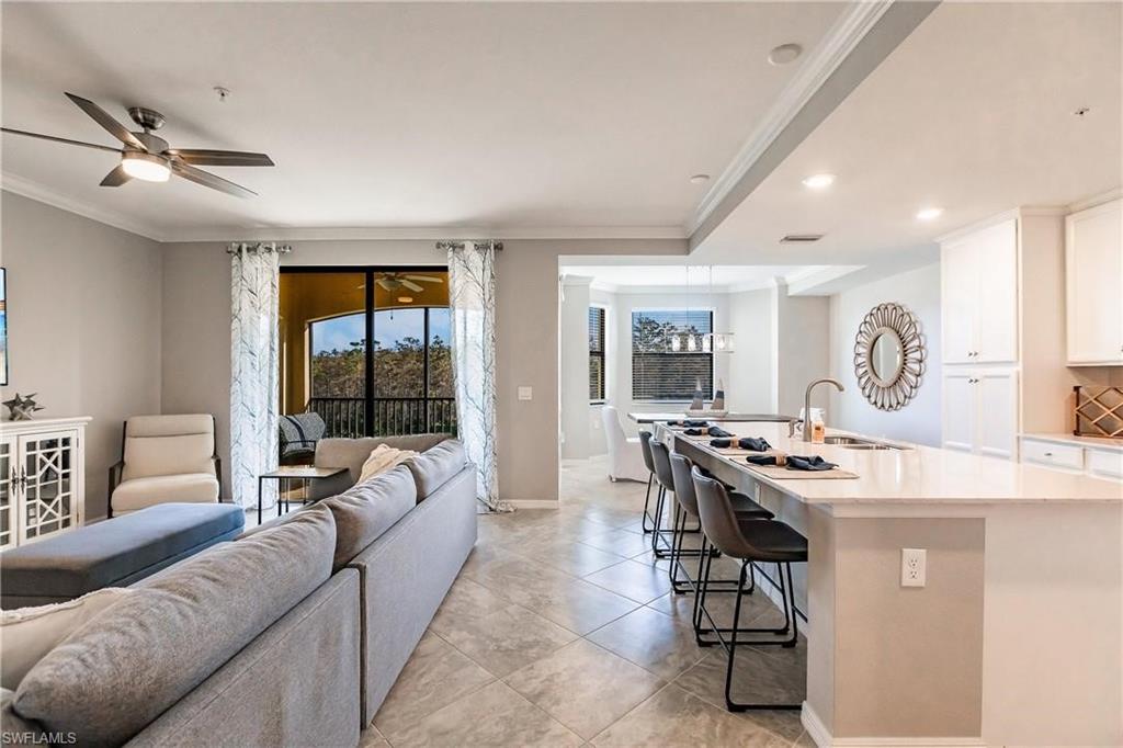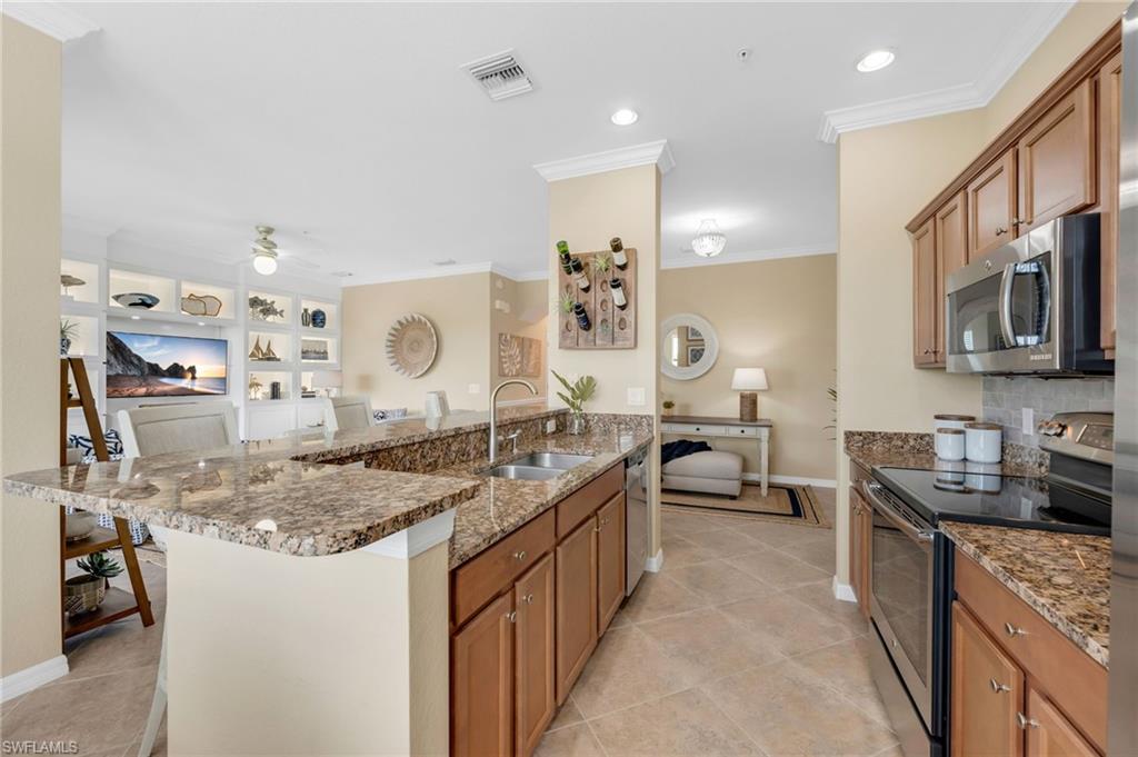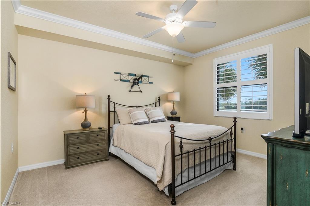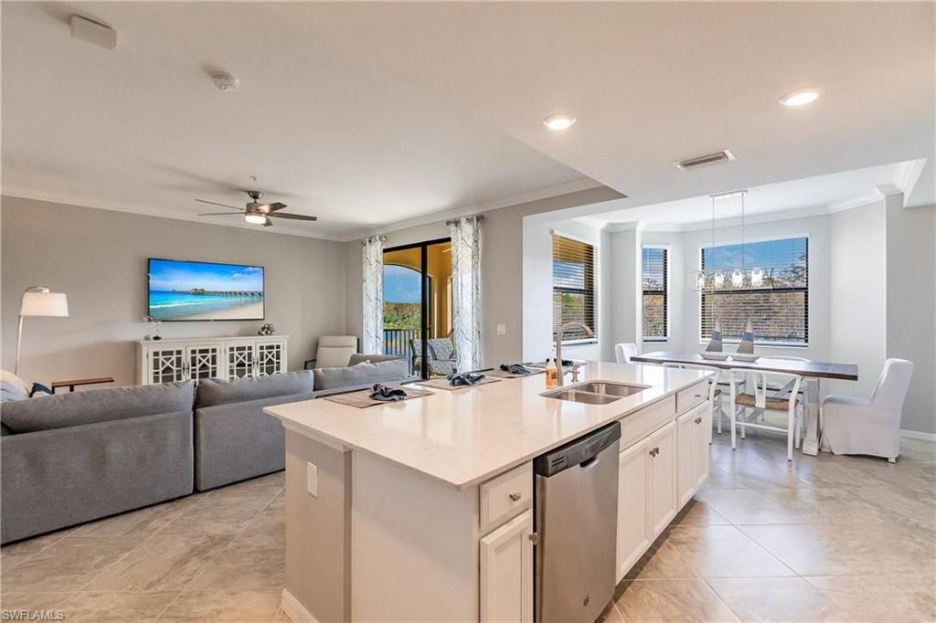 Stunning long lake views in Treviso Bay! This immaculate TOP-FLOOR BELLINI FLOOR PLAN offers a beautifully upgraded design with turnkey furnishings. The 2-bedroom, 2-bath plus FLEX ROOM layout showcases crown molding, custom built-in wall cabinetry with hidden big-screen TV, upgraded ceilings and lighting, plantation shutters, and a designer-tiled lanai for enjoying the best southwestern water views. The kitchen features stainless steel appliances, granite countertops, and breakfast bar seating. Additional perks include covered parking, extra storage, and no golf fees. Treviso Bay lives like a resort with first-class amenities: TPC golf course, clubhouse with fine dining, business center, library, social club, resort-style pools with waterfalls and bar & grill, lap pool, tennis, pickleball, bocce, fitness center, yoga studio, spa, sauna, and more. Just steps to a satellite pool, grilling area, and pickleball courts. Only 10 minutes to downtown Naples and beaches—Make this home your Florida home for the upcoming winter season!