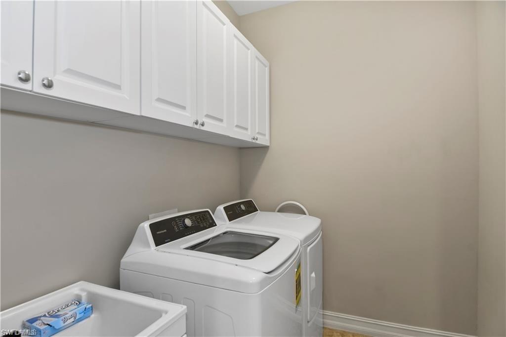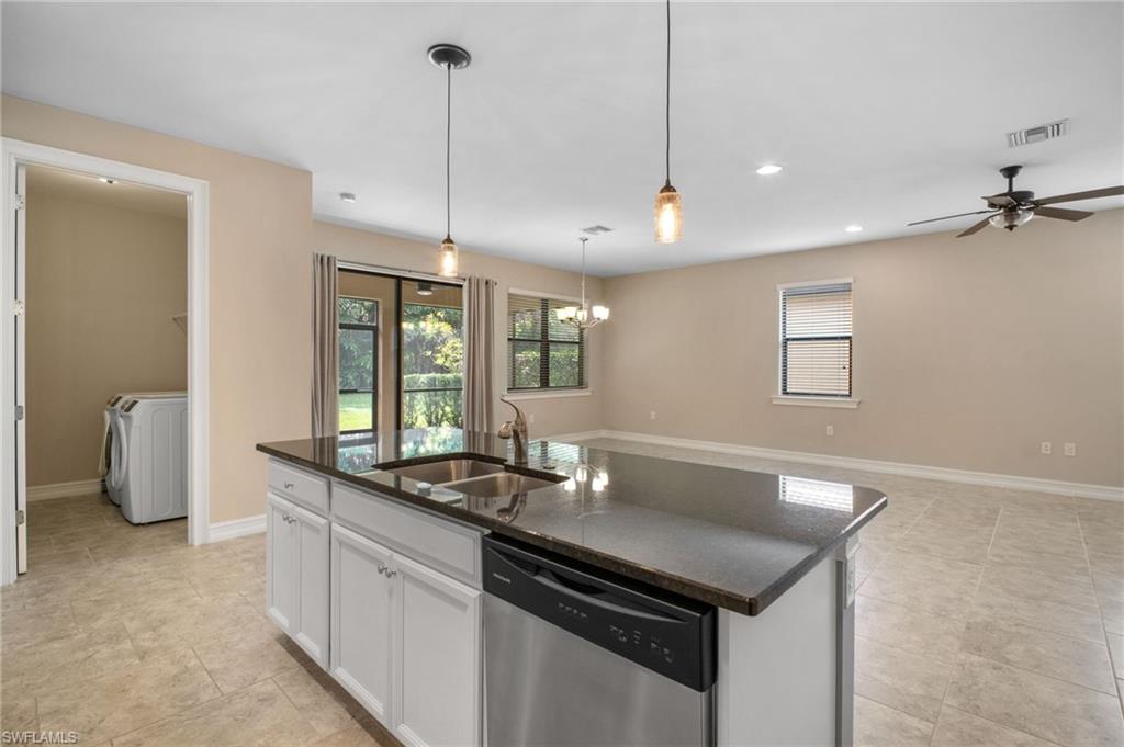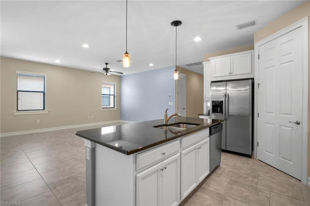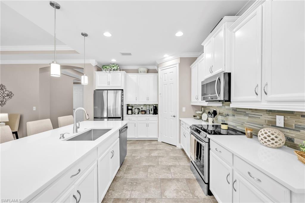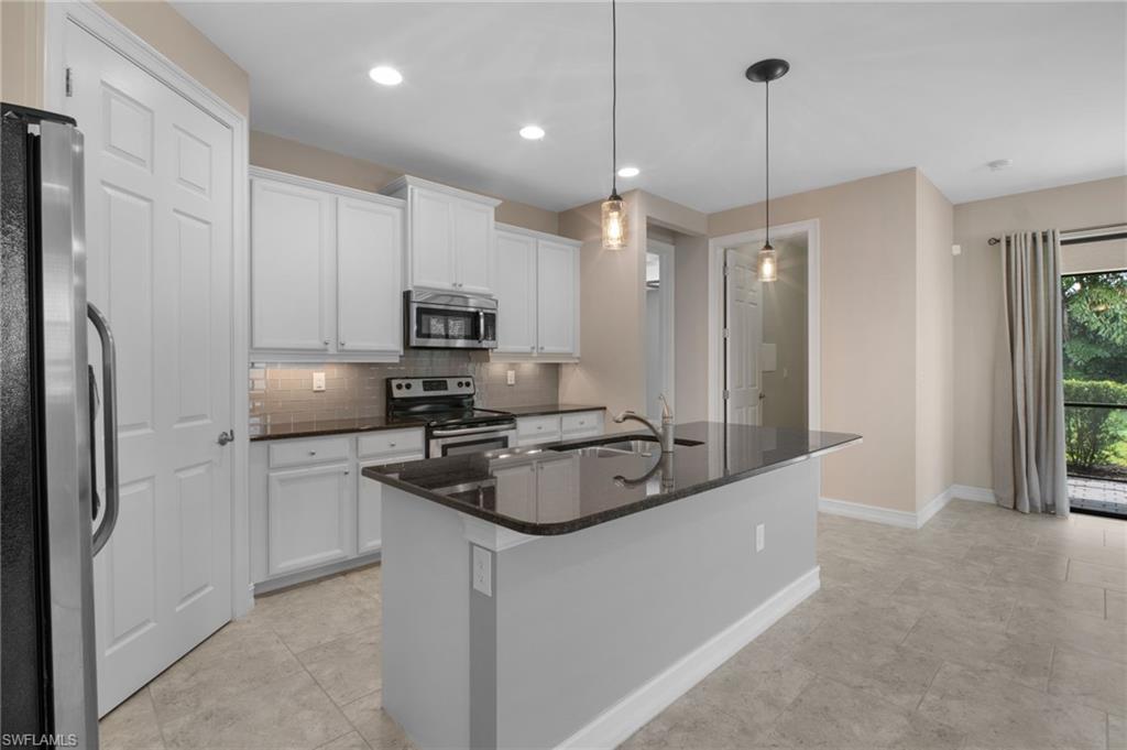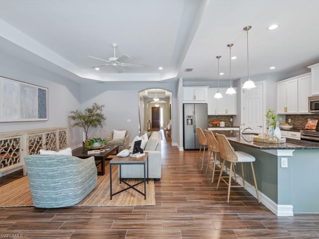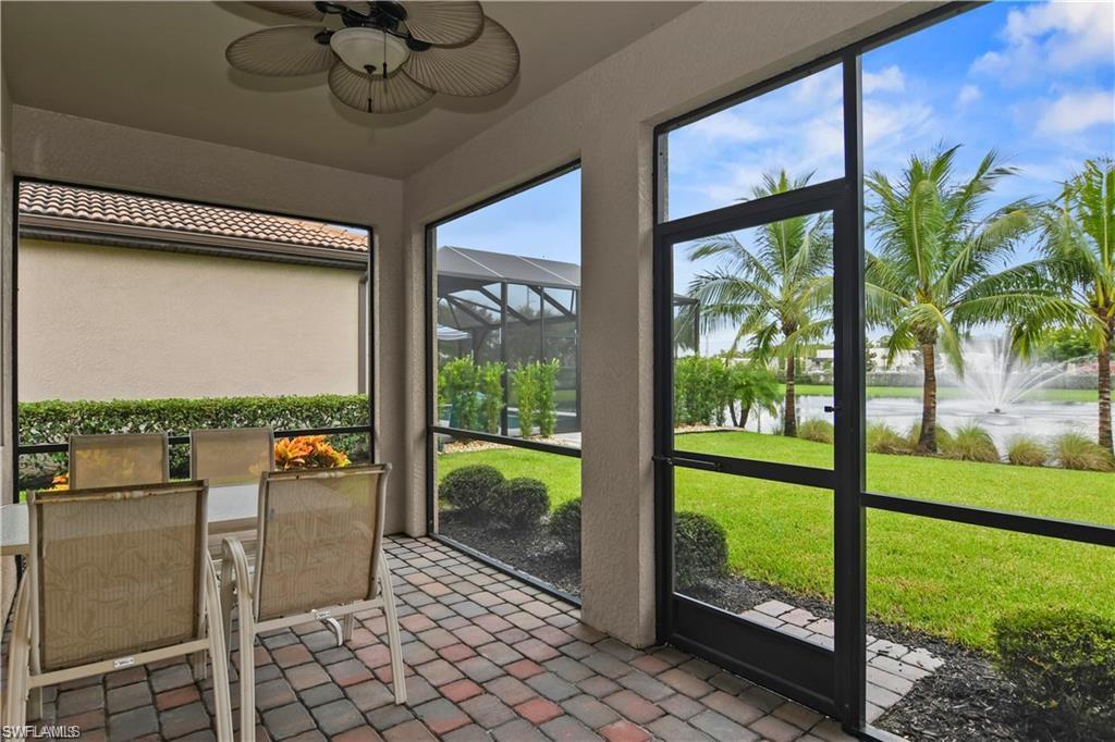 Experience tranquil living with this exquisite 3-bedroom, 2-bathroom lakefront home. Prime location in the desirable area of North Naples right off of Collier Blvd. The open-concept design features a bright and airy living room with windows overlooking the lake and water fountain with perfect Florida sunsets right in the backyard. The kitchen is designed for both functionality and style, with updated appliances, plenty of counter space, added drawers, and a convenient breakfast bar. Three generously sized bedrooms, including a master suite with a private bathroom and lake views. Relax on the expansive patio that is ideal for entertaining, dining, or simply soaking up the beauty of the serene outdoors. This home has been outfitted with extra cabinets and storage shelving throughout. Tuscany Pointe is hassle free living with lawn maintenance and irrigation included in the HOA fee. Close to shopping and dining. Your Florida retreat awaits!