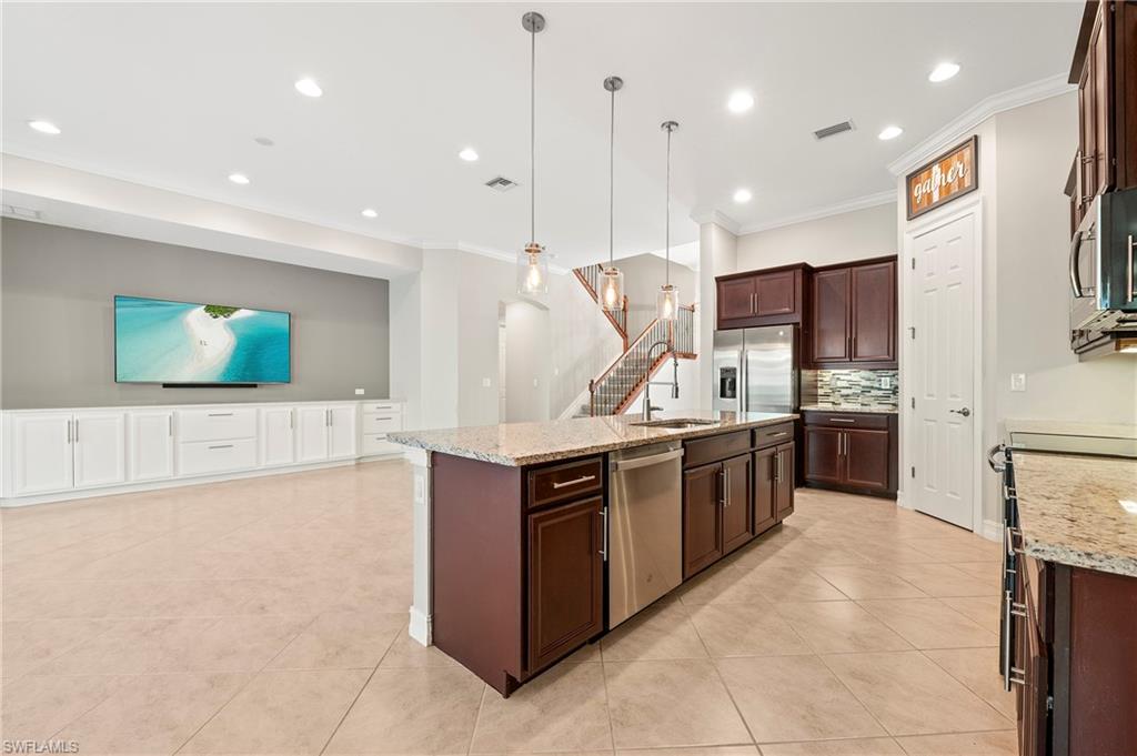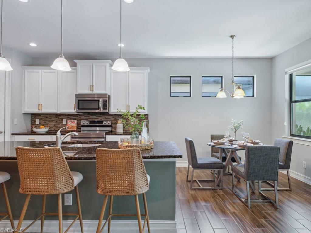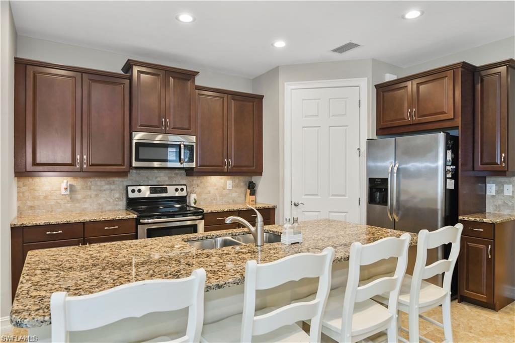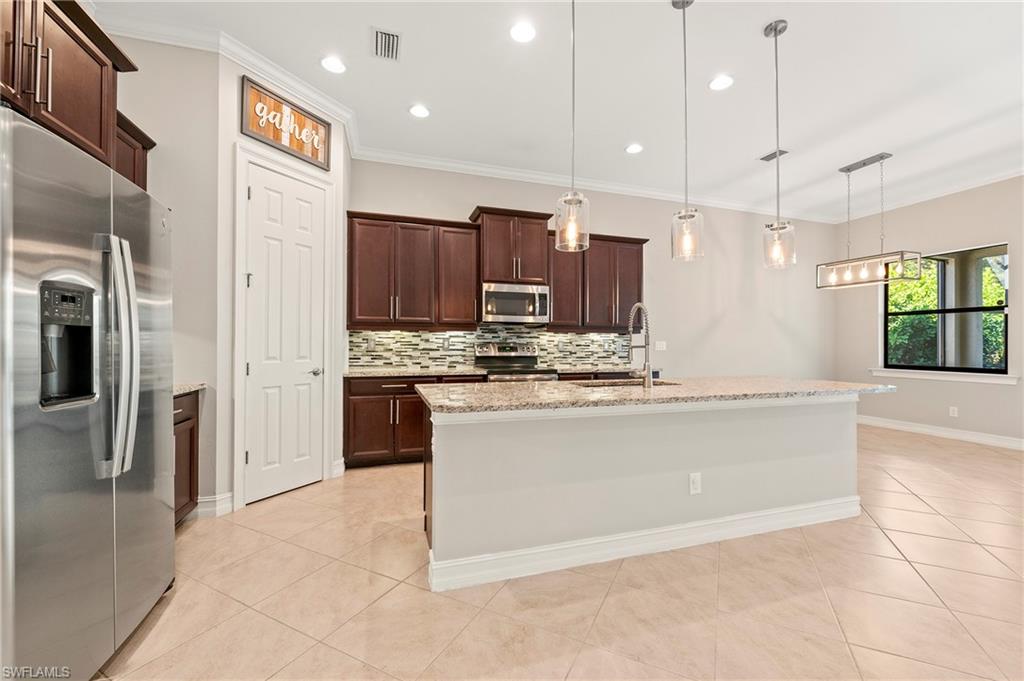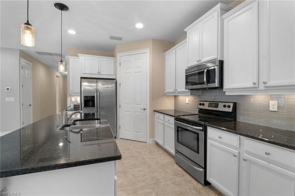 Welcome home! Discover elegance and comfort in this stunning 5-bedroom, 3.5-bathroom home, featuring a spacious 2.5-car garage and a versatile loft. Built in 2016, this 3,609 sq. ft. This "Silverton" floor plan masterpiece blends modern sophistication with timeless charm, perfect for family living and entertaining. As you step inside, the open-concept layout welcomes you with abundant natural light, highlighting a grand staircase that serves as the home’s focal point. Premium vinyl plank flooring and diagonal porcelain tile elevate the ambiance, creating a seamless blend of style and durability. The gourmet kitchen is a chef’s delight, boasting 42-inch cherry java cabinets, sleek granite countertops, and top-of-the-line stainless steel appliances, including a new Samsung Smart glass-top range and microwave. A glass and stone mosaic backsplash adds a touch of elegance, making this kitchen both functional and a work of art. Unwind in the first-floor primary suite, a tranquil haven with a generous walk-in closet and thoughtful design for ultimate relaxation. Upgraded 8-foot hollow core interior doors throughout enhance the home’s luxurious feel. Outside, a brick paver driveway, walkway, and lanai create an inviting setting for gatherings or quiet evenings. The tile roof and manual hurricane shutters ensure durability and peace of mind. With ample space for a pool, you can craft your own backyard retreat! Nestled in the exclusive, gated community of Tuscany Pointe, this home offers a serene lifestyle with low HOA fees. Located in vibrant North Naples, you’re steps away from Founders Square, dining, Publix, Walgreens, and more, all easily accessible by foot or bike. This is more than a home—it’s a lifestyle. Move in and start making unforgettable memories today!