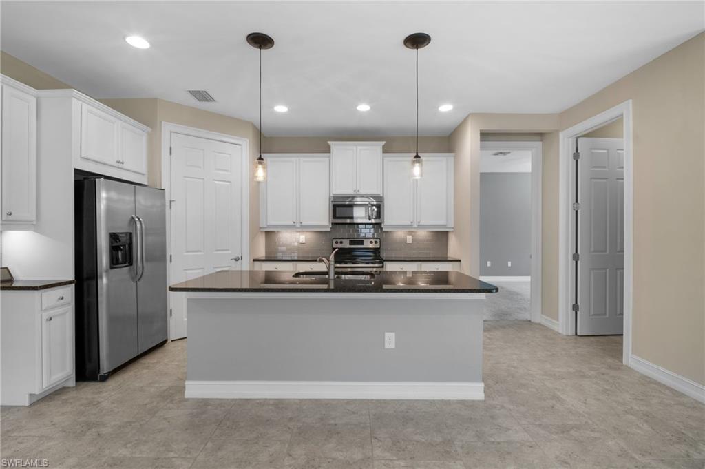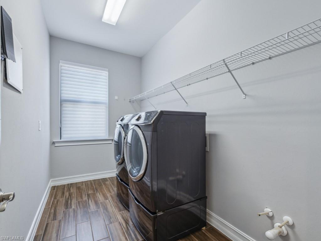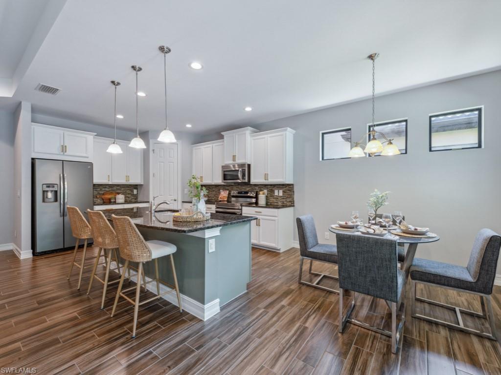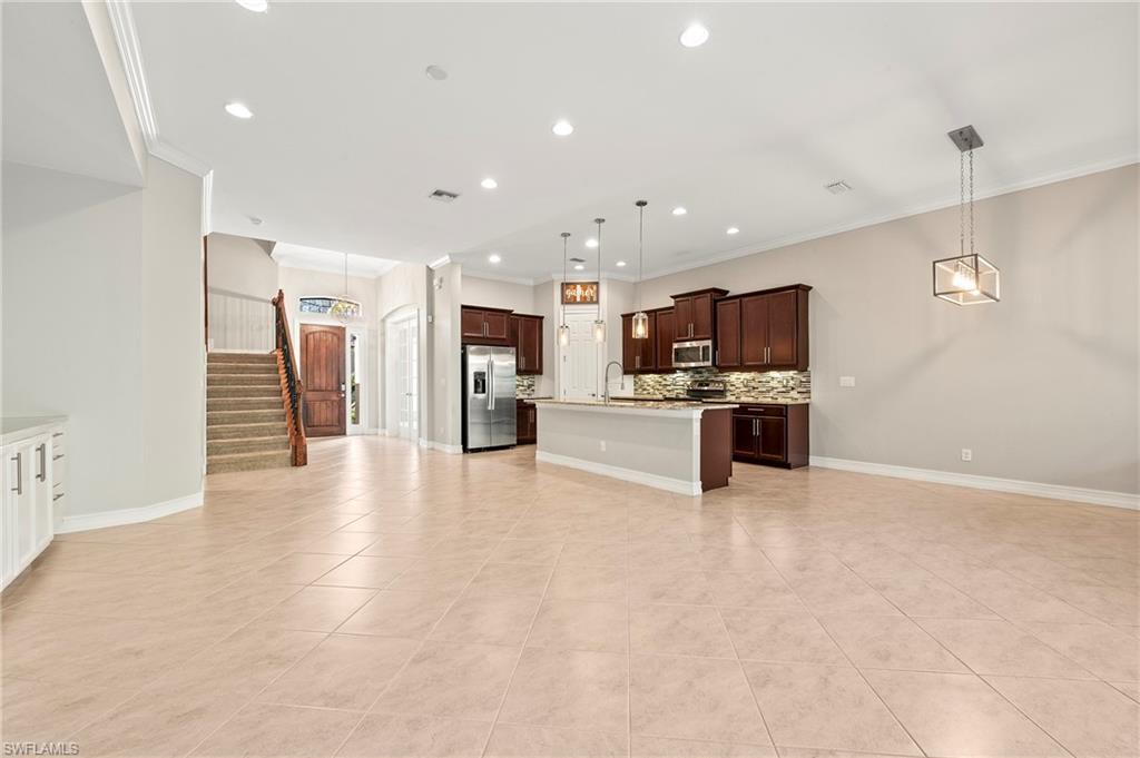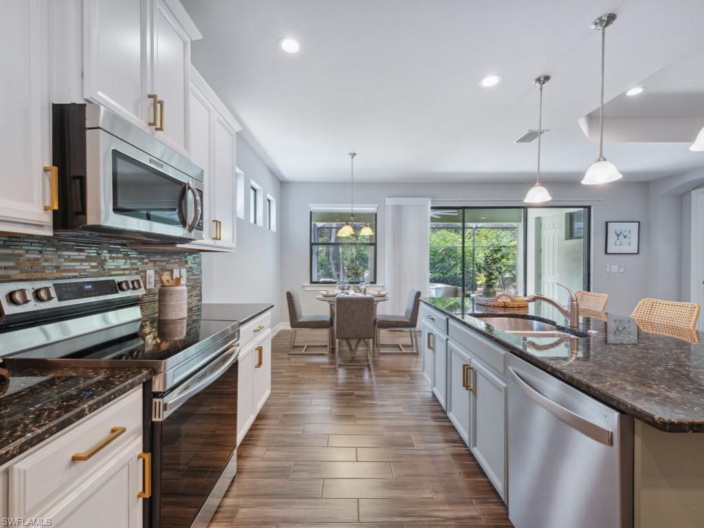 Welcome home! Discover elegance and comfort in this stunning 5-bedroom, 3.5-bathroom home, featuring a spacious 2.5-car garage and a versatile loft. Built in 2016, this 3,609 sq. ft. This "Silverton" floor plan masterpiece blends modern sophistication with timeless charm, perfect for family living and entertaining. As you step inside, the open-concept layout welcomes you with abundant natural light, highlighting a grand staircase that serves as the home’s focal point. Premium vinyl plank flooring and diagonal porcelain tile elevate the ambiance, creating a seamless blend of style and durability. The gourmet kitchen is a chef’s delight, boasting 42-inch cherry java cabinets, sleek granite countertops, and top-of-the-line stainless steel appliances, including a new Samsung Smart glass-top range and microwave. A glass and stone mosaic backsplash adds a touch of elegance, making this kitchen both functional and a work of art. Unwind in the first-floor primary suite, a tranquil haven with a generous walk-in closet and thoughtful design for ultimate relaxation. Upgraded 8-foot hollow core interior doors throughout enhance the home’s luxurious feel. Outside, a brick paver driveway, walkway, and lanai create an inviting setting for gatherings or quiet evenings. The tile roof and manual hurricane shutters ensure durability and peace of mind. With ample space for a pool, you can craft your own backyard retreat! Nestled in the exclusive, gated community of Tuscany Pointe, this home offers a serene lifestyle with low HOA fees. Located in vibrant North Naples, you’re steps away from Founders Square, dining, Publix, Walgreens, and more, all easily accessible by foot or bike. This is more than a home—it’s a lifestyle. Move in and start making unforgettable memories today!