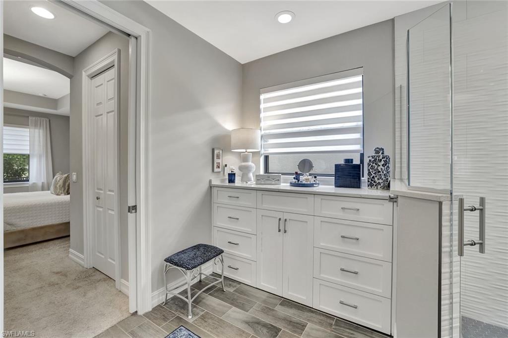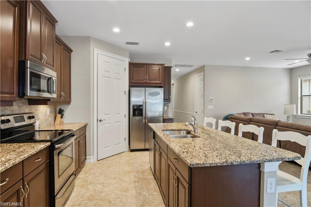 Nestled in the peaceful enclave of Tuscany Pointe in North Naples, this beautifully upgraded 3-bedroom plus den, 3-bathroom pool home offers a perfect blend of style, functionality, and modern comfort. Thoughtfully designed for easy living, the home features a spacious first-floor primary suite with new carpeting, a versatile bonus loft upstairs, and a well-appointed den ideal for a home office or additional guest space. The gourmet kitchen is a true centerpiece, showcasing elegant Cherry Bordeaux cabinetry, granite countertops, and modern appliances, including a brand-new refrigerator and dishwasher. The open-concept living area is enhanced by a custom-built 177-inch cabinet and counter system under the TV, adding both sophistication and practicality. Every closet throughout the home has been upgraded with California Closet systems, ensuring effortless organization, while the permanent shelving in the garage provides smart storage solutions. Additional highlights include an ADT security system for peace of mind and a cleverly designed dry wine closet and bar discreetly tucked into a former coat closet. Step outside to your private oasis, where a heated pool and spa, recently resurfaced for a fresh look and feel, invite relaxation year-round. The large screened-in lanai and spacious backyard provide ample space for lounging, entertaining, and enjoying the Florida sunshine. With pool service, landscaping, trash, and recycling all included in the community, this home offers low-maintenance living in a serene setting—just minutes from the best of North Naples.