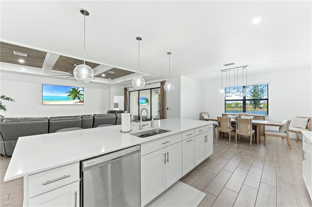 This beautiful home at 1788 Hagen Court in Naples, Florida, located in the prestigious Valencia Country Club and Golf Resort, is a stunning property with 2,448 sq. ft. of living space. Built in 2022, it features three bedrooms, three bathrooms, and a den/office, making it ideal for families and professionals alike. The interior boasts custom coffered ceilings and a spacious kitchen with large countertops, perfect for entertaining. The open kitchen flows into the living space, where you can enjoy a cozy fireplace. Step outside to find a fantastic pool with breathtaking sunset views over the lake, ideal for relaxation and gatherings. Additionally the home includes a three-car garage and is in move-in ready condition, promising a luxurious and convenient lifestyle. This is a wonderful opportunity to own an exquisite home in a beautiful setting.