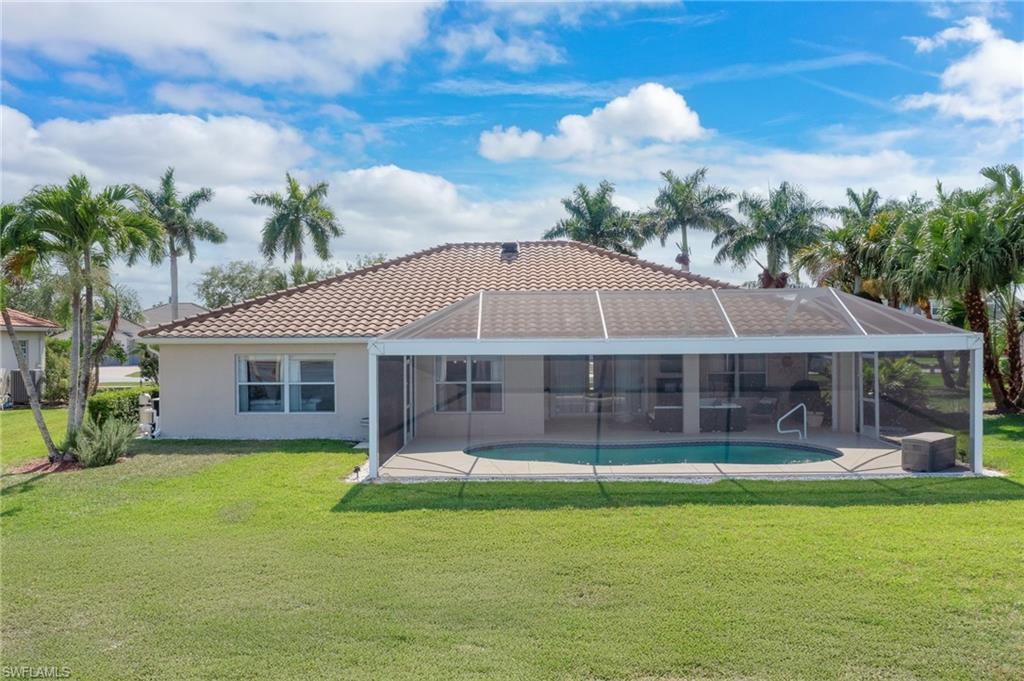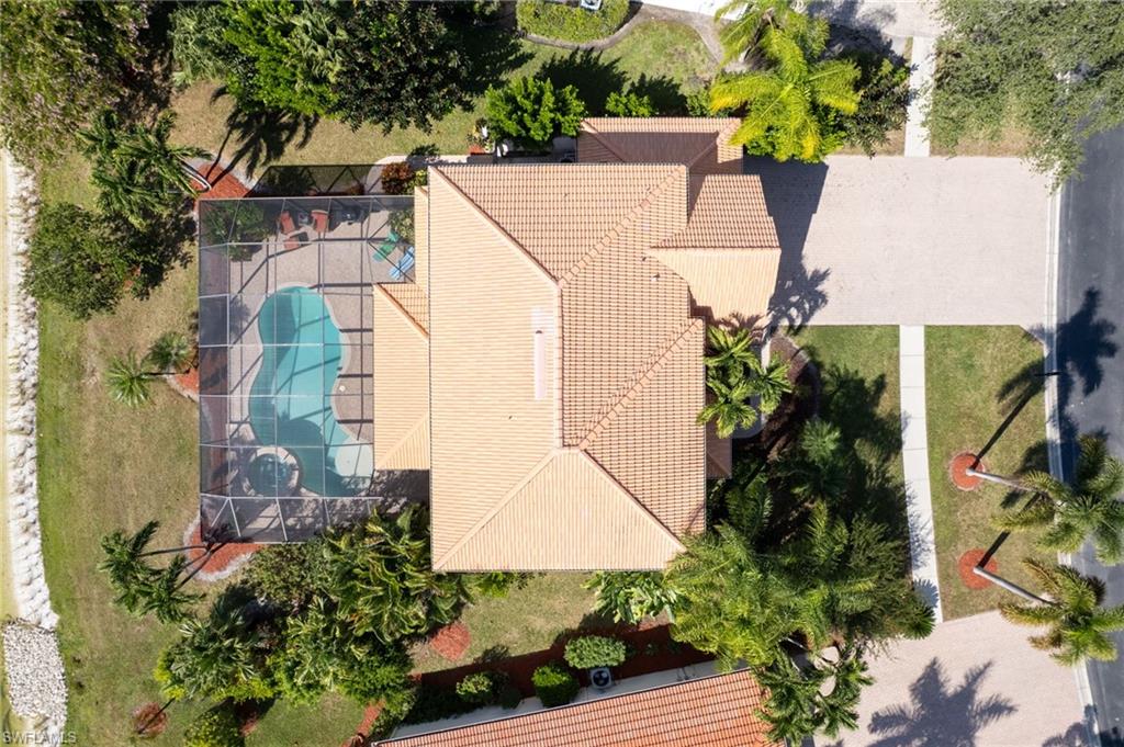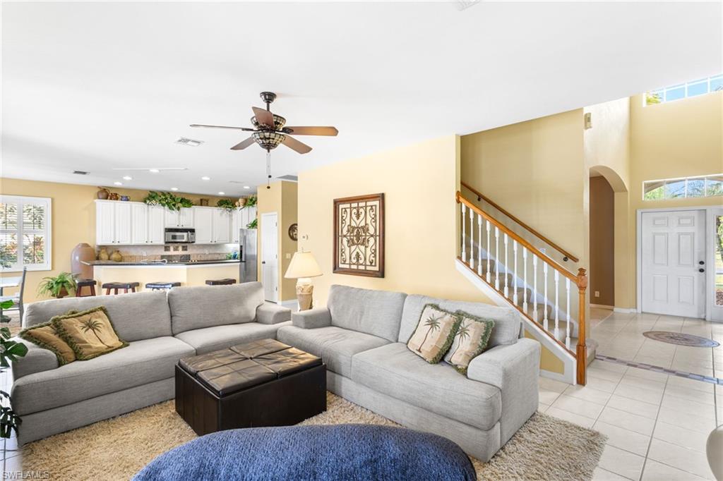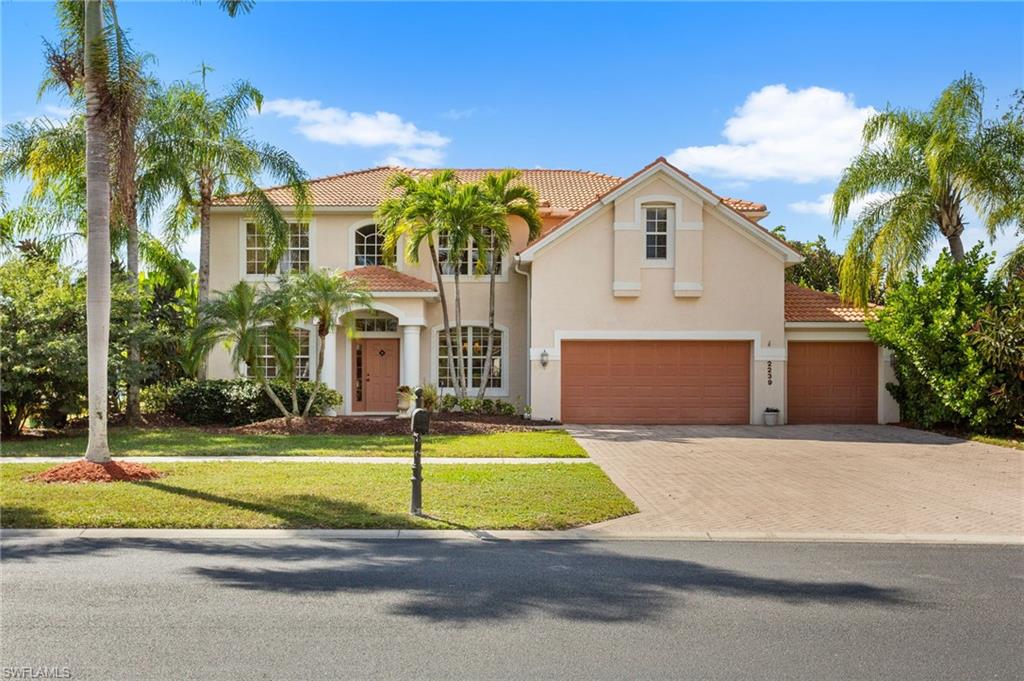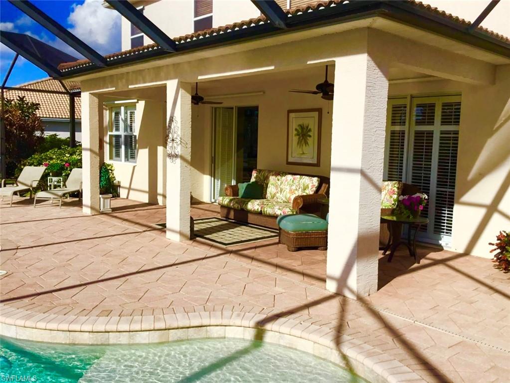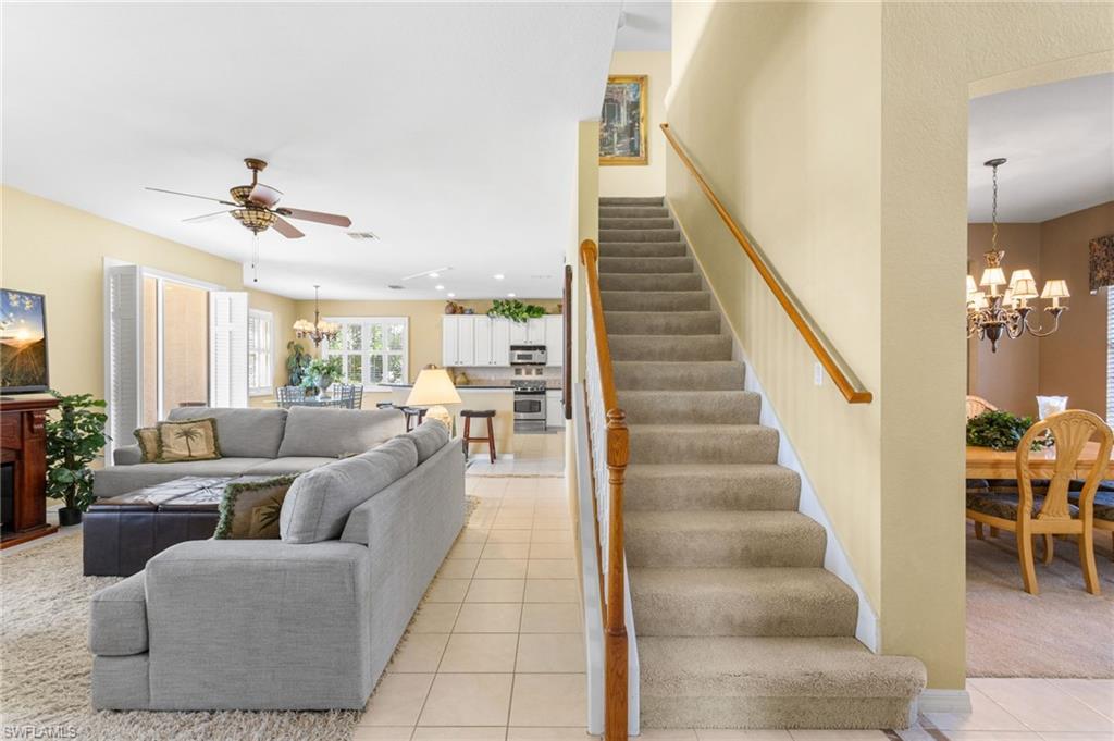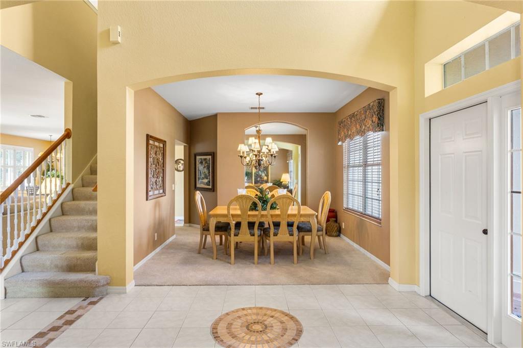 Step through the front door and you’re immediately greeted by 10 foot ceilings, a striking mosaic tile inlay, and an open, airy floor plan that feels both grand and welcoming. The layout is designed for how people actually live today—offering connected spaces for gathering, plus quiet areas for work, guests, and downtime. Just off the main living area, the first-floor den can function as a dedicated home office or hobby room, and can also be utilized as a true first-floor guest suite with an adjoining bathroom—a valuable option for multigenerational living or visiting family and friends. Upstairs, the loft flexes easily as a media room, playroom, fitness area, or second office. Thoughtful details throughout reinforce a sense of comfort, quality, and ease: an oversized 3-car garage for cars, golf gear, and storage; numerous alabaster ceiling fans; window treatments on every window; and plantation shutters in the kitchen and family room that frame the pool and wide lake views. The generously sized lot and landscaping flanking both sides of the pool create a private, resort-like oasis that feels tucked away from neighbors. The large kitchen is intentionally positioned as the heart of the home. An island offers space for prep and casual dining, while granite counters, 42 inch cabinets, a tile backsplash, and abundant cabinet and counter space support everything from quick weeknight meals to holiday gatherings. The kitchen and adjoining family room flow seamlessly to the lanai, where walls of glass invite in natural light and lead your eye straight to the peaceful water view. Upstairs, the spacious primary suite feels like a private retreat. Two walk-in closets provide ample storage, and the en-suite bath features raised dual sinks, a separate shower, and a jetted jacuzzi tub—creating a spa-like place to unwind at the end of the day. Outdoor living is a major highlight. The screened lanai, pool, and raised spa are perfectly oriented with southwest exposure, capturing warm afternoon light and memorable sunsets over the lake. The extra yard space is ideal for pets, gardening, or play, while the wide lake view adds an uncommon sense of openness and tranquility. Valencia Lakes residents enjoy low HOA fees along with a community pool and clubhouse, new Pickleball Courts fitness center, recreation room, children’s playground, basketball court, and tennis court—all in a convenient Naples location close to schools, shopping, dining, and just a short drive to the beaches. Meticulously maintained, generously sized, and set on a premier lakefront lot, 2239 Grove Drive is a compelling opportunity in Valencia Lakes for buyers seeking space, flexibility, and an indoor–outdoor Florida lifestyle. All information is believed to be accurate but is not guaranteed. All measurements, square footage, room dimensions, lot sizes, ages, fees, taxes, school information, HOA rules, and any other details are approximate and/or subject to change without notice