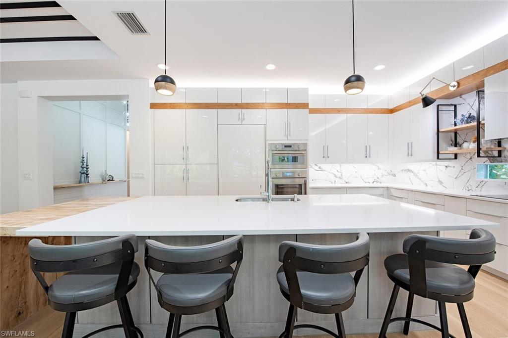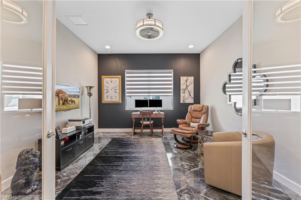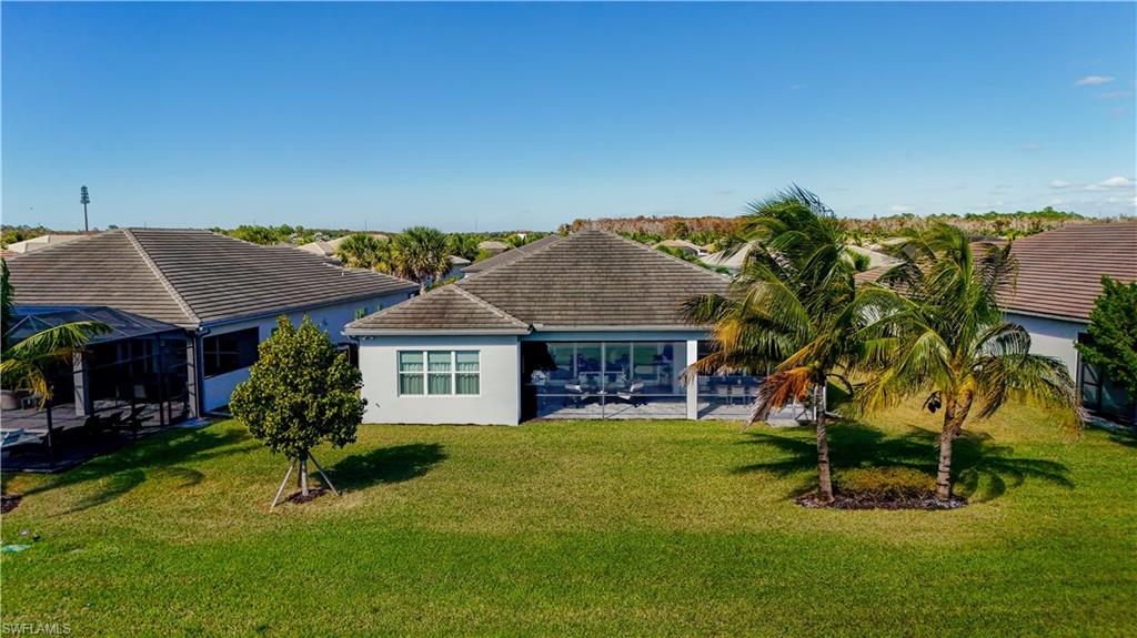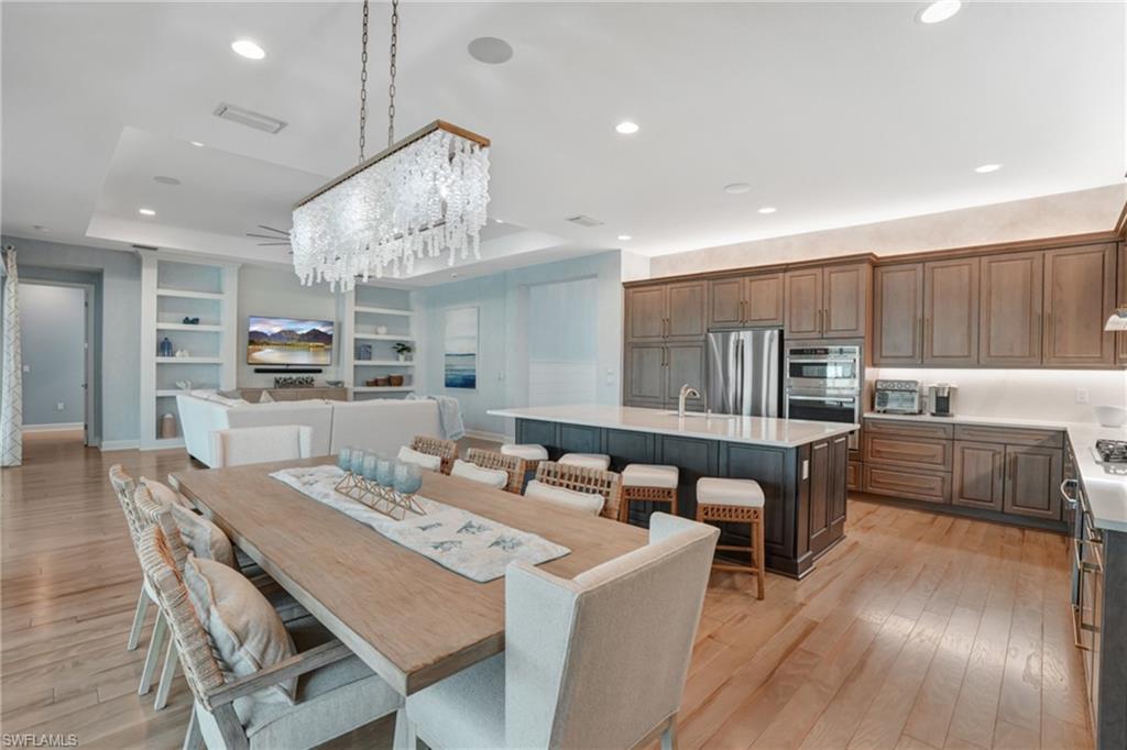 Welcome to one of the most thoughtfully crafted homes in Valencia Trails. Privately nestled along a tranquil preserve, surrounded by lush tropical landscaping, this spectacular Captiva model is a masterpiece, blending modern elegance with peaceful seclusion. Step through the glass front doors into a soaring foyer featuring an intricate marble inlay set seamlessly into the surrounding French white oak hardwood flooring that flows throughout the main living areas. At the heart of the home, a chef’s dream kitchen awaits; designed to impress & equipped to perform. Sleek Eurocraft Reflekt acrylic cabinetry, expanded by 9 feet into the dining space, has soft-close drawers, multiple custom cabinet inserts & pull-outs, and ambient cabinet lighting. A striking porcelain backsplash complements the quartz countertops, while an oversized island offers generous prep space, additional storage & effortless flow for entertaining. The Thermador Professional Series appliance suite includes a side-open convection oven, freedom induction cooktop, speed oven-microwave, Sapphire dishwasher & a column refrigerator. Sub-Zero beverage & freezer drawers and a custom vented hood also deliver professional-grade performance. The great room showcases a striking custom feature wall & is framed by views of the lush preserve through impact-rated sliding glass doors. Outside, the thoughtfully graded lanai has a step-free surface for enhanced safety & the White Ice marble pavers offer an elevated, coastal aesthetic. A Kings Starboard cabinet system adds storage & functionality. The saltwater pool is a standout—35 feet in length with an integrated spa, a sundeck & elegant water bowls for a serene, resort-like experience. Heated by gas, the pool & spa are ready for year-round enjoyment. The extended covered lanai is framed by an invisible screen enclosure and the tranquil preserve view makes this outdoor oasis very private & picturesque. The primary suite offers a spa-inspired bath with an oversized rain shower, soaking tub, dual vanities with Eurocraft cabinetry & 3 generously sized custom walk-in closets. There are 3 additional en-suite guest bedrooms, one featuring built-in bunk beds. An expansive den with a custom built-in entertainment wall provides flexible space for a home office, media room, or additional living area. Fine features include solid core doors, hurricane impact windows & doors, extensive millwork & shiplap, curated lighting accents, epoxy garage flooring, tankless water heater, fenced dog-run & a custom finished laundry space with GE pedestaled washer/dryer. Valencia Trails is more than a community—it's a lifestyle. This exclusive 55+ neighborhood features world-class amenities, including a 43,000 SF clubhouse with gourmet restaurant, poolside bar, resort-style pools, fitness center, pickleball, tennis, bocce, yoga, art studio, cooking classes, spa, dog park & a vibrant social calendar. This is your invitation to live where everyday feels like a resort getaway.