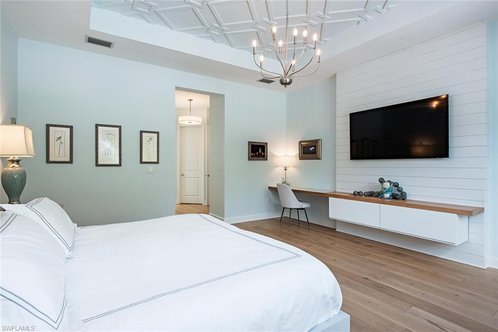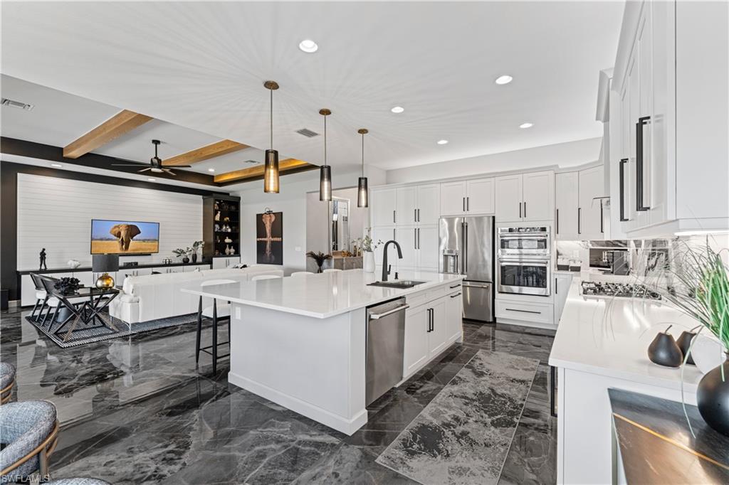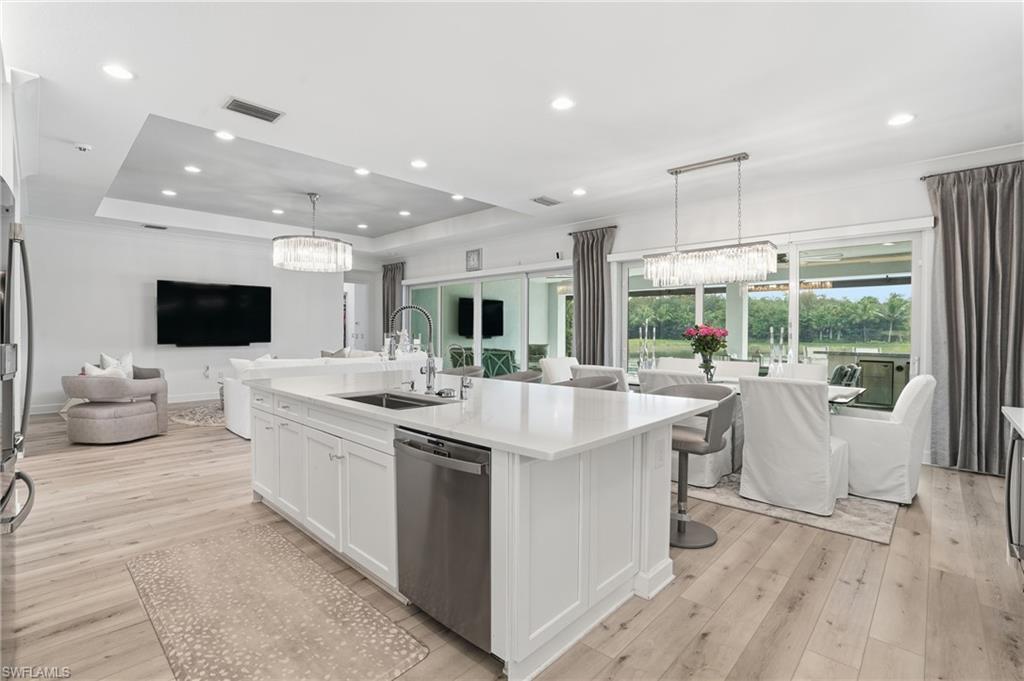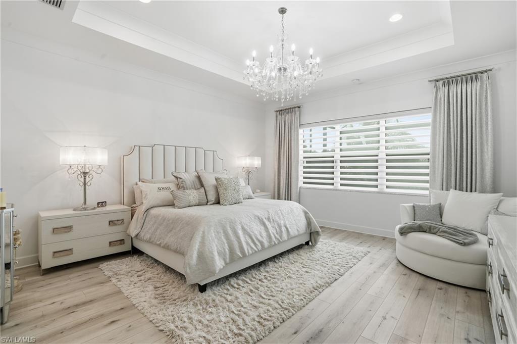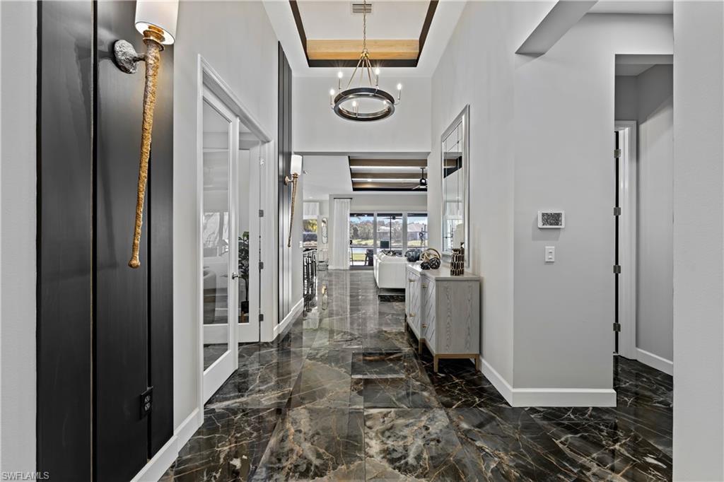 This stunning Sunrise model home offers an unparalleled blend of luxury and comfort in the highly sought-after Valencia Trails, Naples’ premier 55+ community. From the moment you step inside, the soaring 14-foot ceilings with a custom focal wall create an immediate sense of sophistication. The open-concept design seamlessly connects the kitchen and living areas, making it ideal for everyday living and elegant entertaining. The combination of luxury vinyl flooring throughout and cozy carpeting in the bedrooms ensures both style and comfort. The chef’s kitchen is a true showpiece, featuring quartz countertops, quartz backsplash, a natural gas stove, instant hot water, premium stainless steel appliances, an upgraded pantry, upgraded from cabinets to drawers, and pullout trash bins. Cabinetry with soft-close functionality and elegant molding adds a touch of refinement, while ample recessed lighting enhances the space. Just outside the glass sliding doors is an outdoor oasis retreat, complete with an extended covered lanai, private saltwater pool with gas heater, outdoor kitchen, pool cage, and breathtaking views of the pond. For peace of mind, the home has security cameras and an alarm system. Whether you’re enjoying a quiet morning coffee or hosting guests for an evening gathering, this tranquil retreat offers a seamless blend of indoor-outdoor living. Beyond your doorstep, Valencia Trails offers world-class amenities designed to enhance an active and social lifestyle. The impressive 43,000-square-foot clubhouse features a full-service restaurant and bar, a state-of-the-art fitness center, a full-service salon and spa, and multiple recreational spaces, including card rooms, an art studio, and a learning kitchen. For those who love outdoor activities, the community boasts a resort-style pool, a lap pool, a resistance pool, six tennis courts, eight pickleball courts, and scenic walking and biking trails. Even your four-legged companions will feel at home with two dedicated dog parks. This is more than just a home—it’s an opportunity to embrace a luxurious, resort-style lifestyle in one of Naples’ most exclusive communities. Homes like this are rare, and demand for Valencia Trails continues to grow. Don’t miss your chance to own a piece of paradise. Call today to schedule your private tour and experience the elegance, comfort, and breathtaking lake views for yourself."