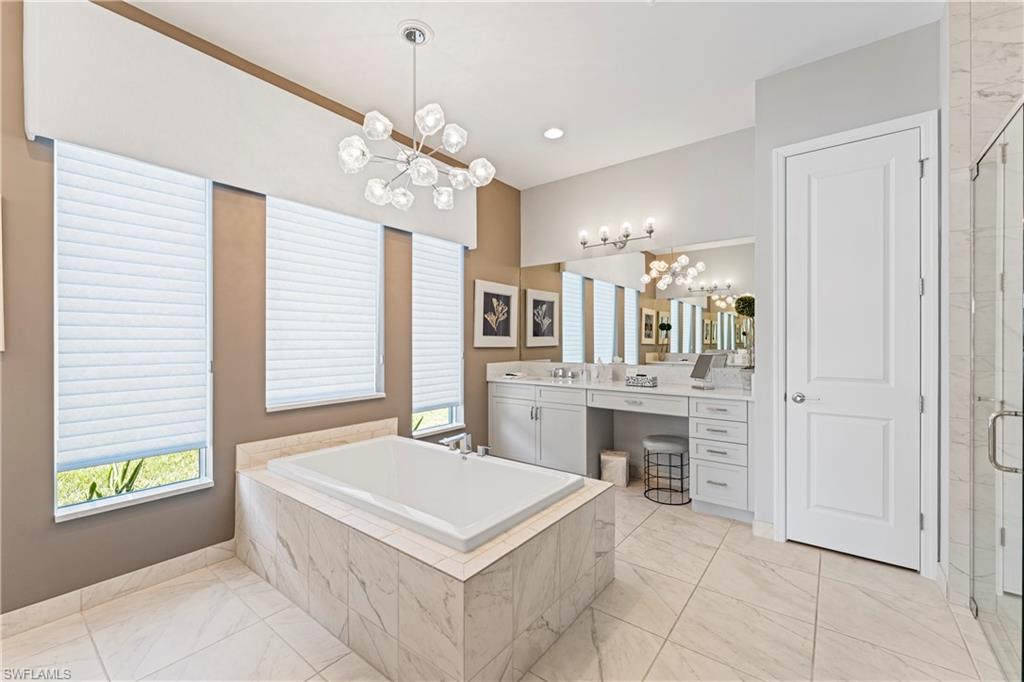 Introducing an unparalleled opportunity to experience luxury living in one of the most coveted homes within Valencia Trails. This meticulously curated & customized Sunrise floor plan offers an exceptional living experience with top-tier finishes that go beyond the builder level with flooring, kitchen & primary bath installed after closing. The open living space seamlessly blends magnificent interiors with the splendor of outdoor Florida living. The main living area flows effortlessly onto a sprawling, covered lanai. The outdoor space is a true masterpiece, featuring exquisite Akoya marble tile pavers, a sparkling free-form pool, and a spa – encased within a panoramic screen offering a tranquil preserve view with a lovely lake in the distance. For ultimate outdoor indulgence, a fully equipped summer kitchen awaits, ensuring that al fresco dining is always at your fingertips. As you enter through the sleek glass & metal front door, you are greeted by a grand foyer illuminated by dramatic lighting. The expansive living area is enhanced by an entertainer's dream kitchen, equipped with custom cabinetry, stunning quartz countertops/backsplash, and Jenn-Air appliances – including a paneled refrigerator/freezer, 6-burner gas cooktop, vented hood, wall oven, microwave & wine cooler. The oversized island offers additional storage & serves as the perfect gathering spot. The kitchen is completed by a Blanco granite composite sink, pendant & ambient lighting, and a pot filler. The master suite is an indulgent retreat, offering a spa-like bath with a frameless glass-enclosed rainfall shower, an oval soaking tub, and custom cabinetry. Each guest bath is its own sanctuary, featuring quartz countertops, walk-in showers with tile extending to the ceiling, upgraded cabinetry & designer fixtures. Additionally, this home is outfitted with Shaw hardwood flooring, plantation shutters, silhouette shades, custom closets throughout, millwork, fresh paint, a Culligan water softener & solid core doors. Hurricane impact windows & doors, along with electric hurricane-rated screens on the lanai ensure complete peace of mind. The laundry room features custom cabinetry, a sink, and GE Power Steam washer & dryer. The finished garage offers polyurea flooring, storage cabinetry, an extra fridge & insulated ceiling. There is also a 6’x10’ fenced dog run and lush, tropical landscaping surrounds this incredible home. Valencia Trails is more than just a community; it's a lifestyle. This exclusive 55+ community boasts world-class amenities, including a 43,000 square-foot clubhouse with a gourmet restaurant, poolside bar, and resort-style pools. Whether you enjoy tennis, pickleball, bocce, or more tranquil activities like yoga or art classes, Valencia Trails has it all. Additional features include a fitness center, sports lounge, card rooms, cooking studio, spa, dog park & a vibrant calendar of events so every day feels like a vacation. This is your invitation to live life luxuriously.