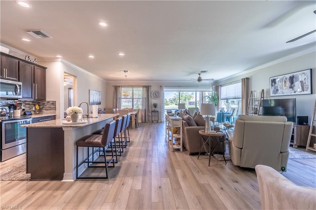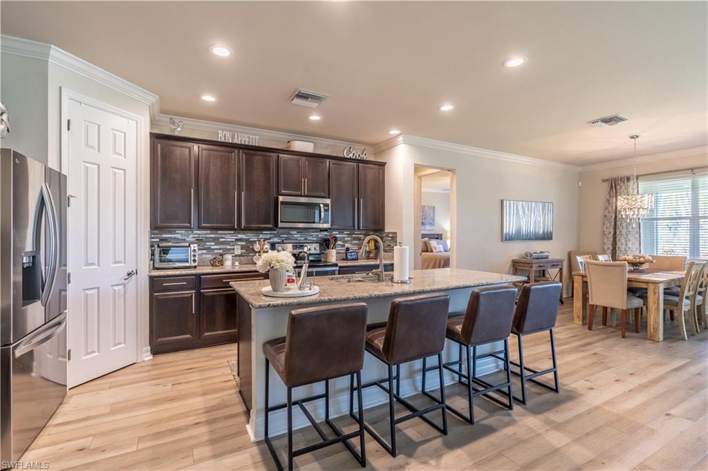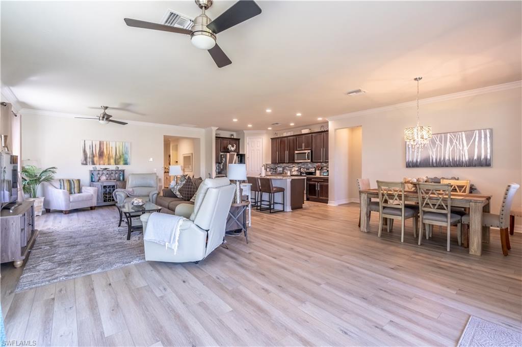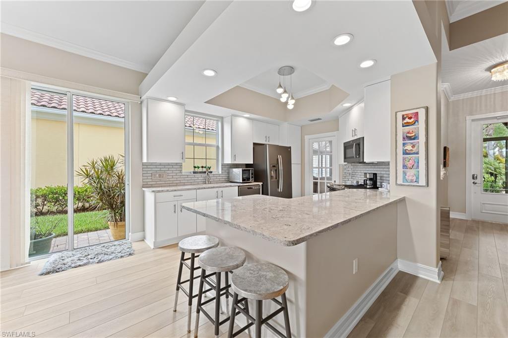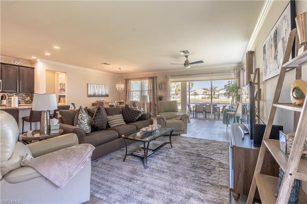 Welcome to the Oakmont model home in Verona Walk—a beautifully updated, move-in-ready residence you won’t want to miss. This home has been thoughtfully upgraded with features and finishes that add both style and function. Step inside to find gorgeous Plus Premium vinyl flooring that runs throughout the main living areas, complemented by new baseboards and newly installed crown molding & ceiling molding for a clean, modern touch. The kitchen was fully renovated in 2020 by Kitchen Solvers and features a sleek, modern backsplash that pairs perfectly with slate appliances (2017). The dishwasher was recently replaced in 2024, adding even more convenience. The den, accessible through new French doors, features rich Acadia wood flooring (2014) and is filled with natural light—making it an ideal space for a home office or guest room. The spacious master bedroom includes new carpet (2018) and a large en-suite bathroom. Both the bedroom and bathroom have been freshly painted. Throughout the home, you’ll find custom mirrors and upgraded lighting fixtures from Lighting First, enhancing both bathrooms and main living spaces. The two guest bedrooms are bright, spacious, and outfitted with the same premium vinyl flooring, offering comfort and style for family or visitors. The laundry room is clean and functional, complete with a utility sink. Additional updates include; water heater replaced in 2021, AC unit professionally serviced every six months and Hurricane shutters installed in 2009 by AAA Hurricane Protection (electric shutters on the lanai, roll-down on all other openings). The community of Verona Walk is a vibrant and friendly community. You’ll enjoy access to a well-appointed Town Center featuring a café, ice cream shop, post office, gas station, salon, bank, and even a full-time activities director. Just minutes from downtown Naples, this home is close to white sand beaches, restaurants, and shopping. Don’t miss your chance to see this exceptional home—schedule a showing today!