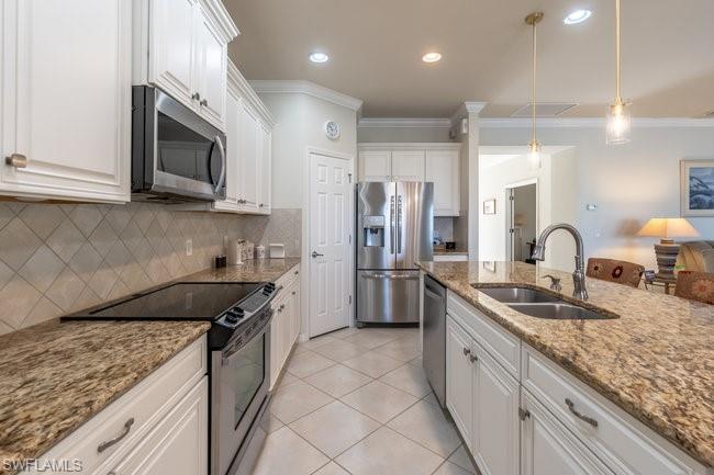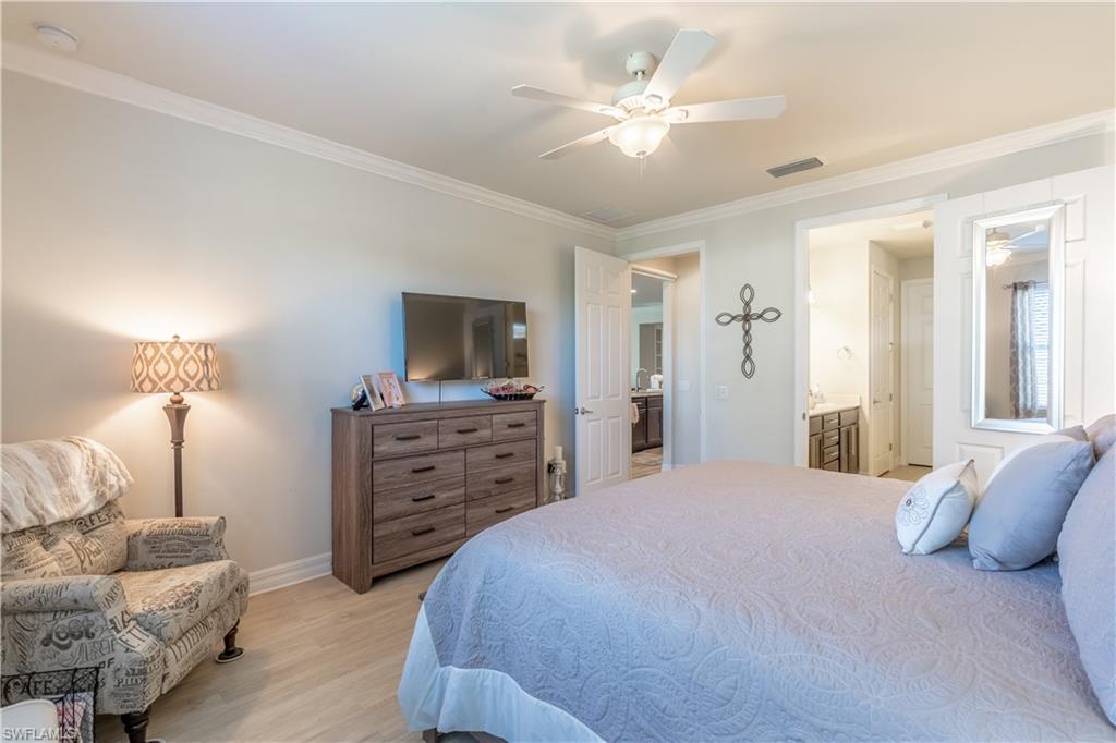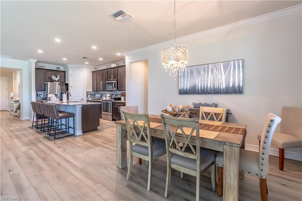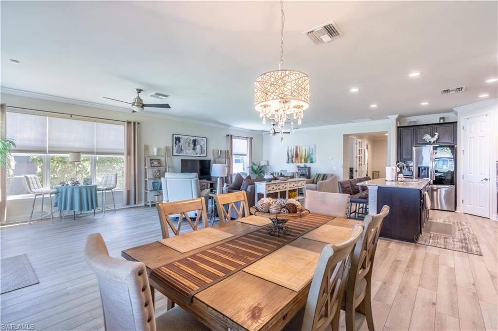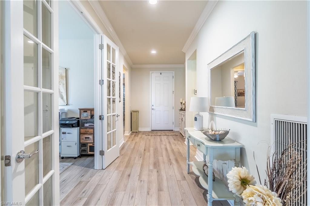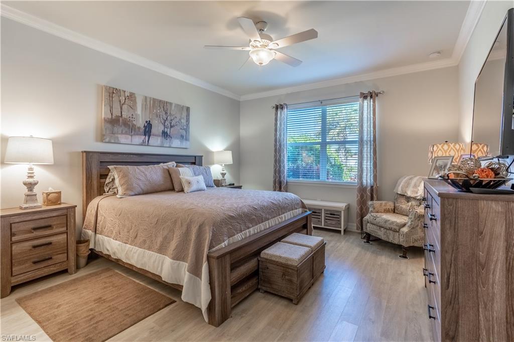 Welcome to the Oakmont model home in Verona Walk—a beautifully updated, move-in-ready residence you won’t want to miss. This home has been thoughtfully upgraded with features and finishes that add both style and function. Step inside to find gorgeous Plus Premium vinyl flooring that runs throughout the main living areas, complemented by new baseboards and newly installed crown molding & ceiling molding for a clean, modern touch. The kitchen was fully renovated in 2020 by Kitchen Solvers and features a sleek, modern backsplash that pairs perfectly with slate appliances (2017). The dishwasher was recently replaced in 2024, adding even more convenience. The den, accessible through new French doors, features rich Acadia wood flooring (2014) and is filled with natural light—making it an ideal space for a home office or guest room. The spacious master bedroom includes new carpet (2018) and a large en-suite bathroom. Both the bedroom and bathroom have been freshly painted. Throughout the home, you’ll find custom mirrors and upgraded lighting fixtures from Lighting First, enhancing both bathrooms and main living spaces. The two guest bedrooms are bright, spacious, and outfitted with the same premium vinyl flooring, offering comfort and style for family or visitors. The laundry room is clean and functional, complete with a utility sink. Additional updates include; water heater replaced in 2021, AC unit professionally serviced every six months and Hurricane shutters installed in 2009 by AAA Hurricane Protection (electric shutters on the lanai, roll-down on all other openings). The community of Verona Walk is a vibrant and friendly community. You’ll enjoy access to a well-appointed Town Center featuring a café, ice cream shop, post office, gas station, salon, bank, and even a full-time activities director. Just minutes from downtown Naples, this home is close to white sand beaches, restaurants, and shopping. Don’t miss your chance to see this exceptional home—schedule a showing today!