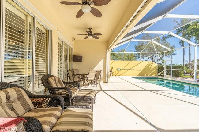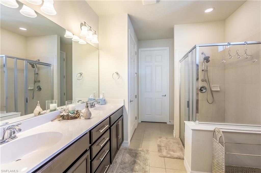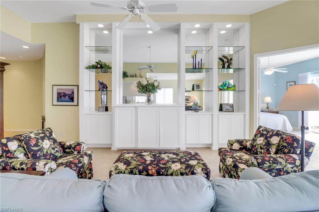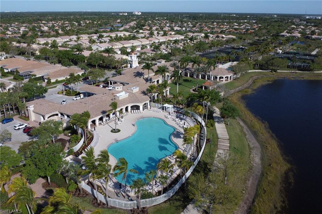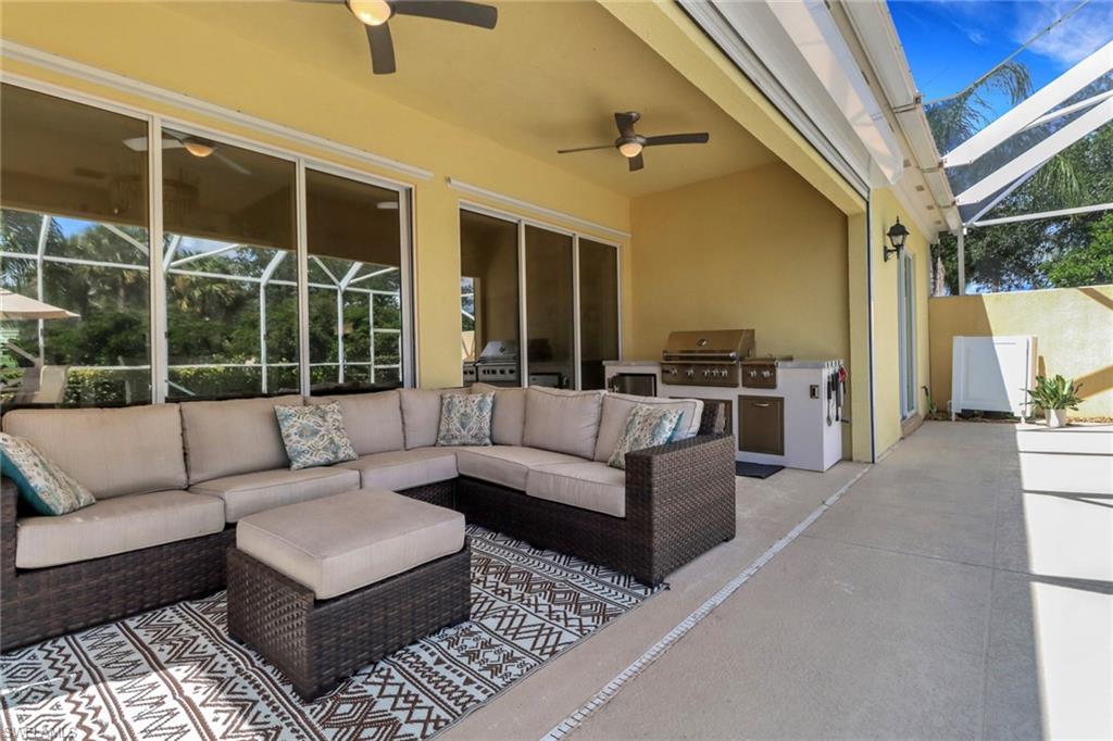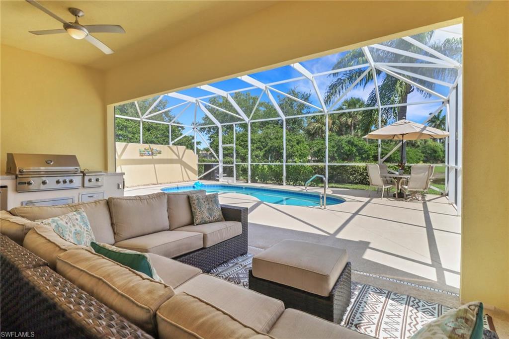 This beautifully maintained Oakmont model home, nestled in the award winning, gated community of Verona Walk in Naples, Florida, offers a move-in ready retreat with a heated pool. Built by renowned builder DiVosta with solid poured concrete construction, this beautifully maintained 2-bedroom, 2.5-bath residence also features a versatile den and a spacious 2-car garage. The open-concept layout is enhanced by lofty ceilings, crown molding, and abundant natural light that fills every corner of the home. A centrally located whited kitchen with stainless steel appliances connects seamlessly to the expansive living and dining area- perfect for entertaining. A custom, floor-to-ceiling built-in wall unit adds elegance and function to the great room. The primary suite is a true retreat, featuring a private hallway flanked by dual closets, a luxurious en-suite bath with two vanities, two water closets, a soaking tub, and a dual-entry shower, along with direct access via sliding glass doors to the patio and pool. The split bedroom floor plan ensures privacy, with guest rooms tucked toward the front of the home. Step outside to your private outdoor oasis: a covered lanai with outdoor kitchen opens to an oversized screened enclosure with a heated pool, tranquil lake views, and multiple seating areas perfect for lounging or dining al fresco. Additional features include hurricane shutters for peace of mind, meticulously maintained landscaping and low HOA fees, which even include Xfinity internet! Verona Walk offers unmatched amenities, including a resort-style pool, lap pool, Har-Tru tennis and pickleball courts, bocce, fitness center, basketball, and over 20 miles of walking paths. The vibrant Town Center features a café, salon, post office, gas station, travel agency, bank, and full-time activities director. Just minutes from shopping, dining, medical facilities, and the white sand beaches of downtown Naples, this exceptional Oakmont model home offers the perfect blend of luxury, comfort and resort-style living. Schedule your private showing today!