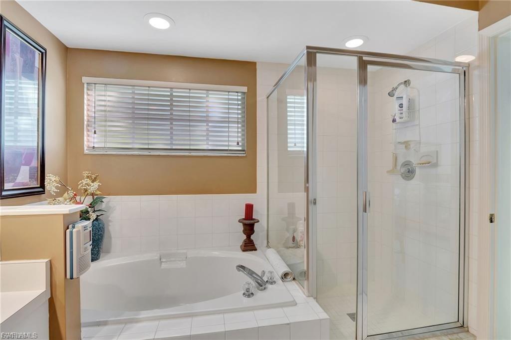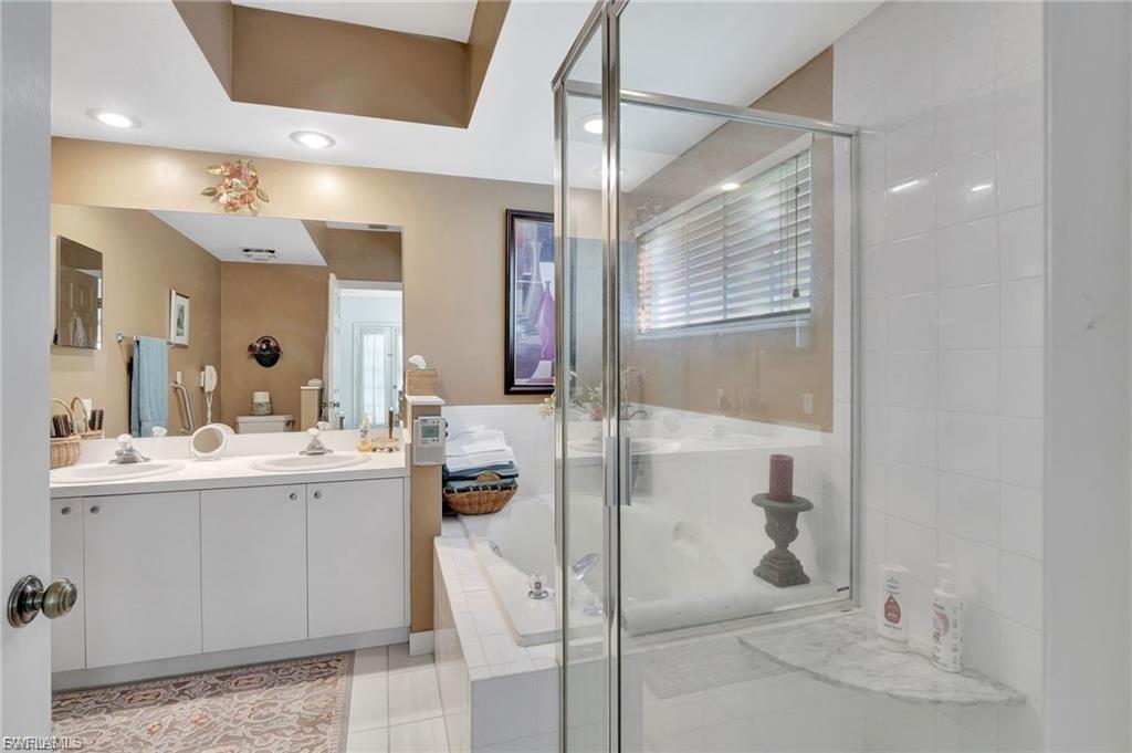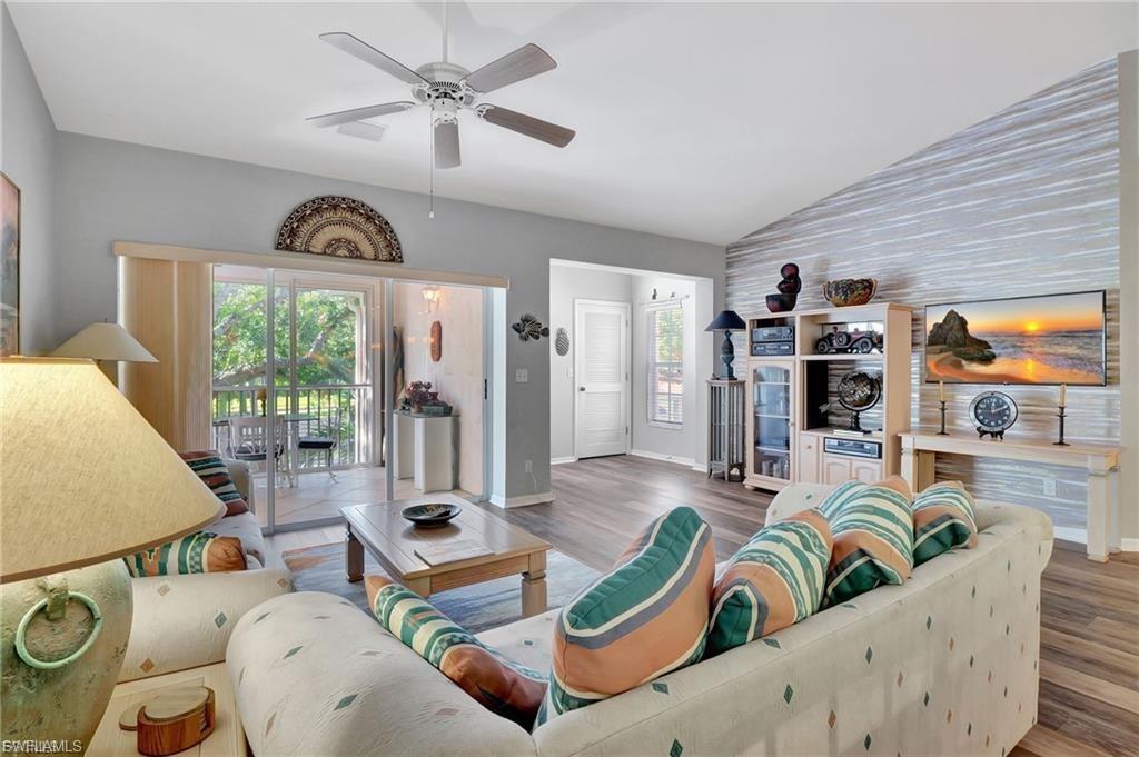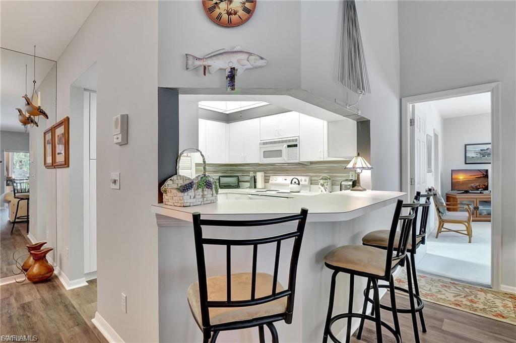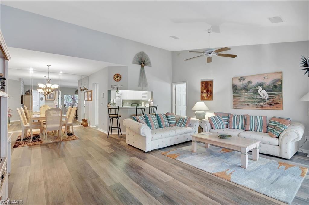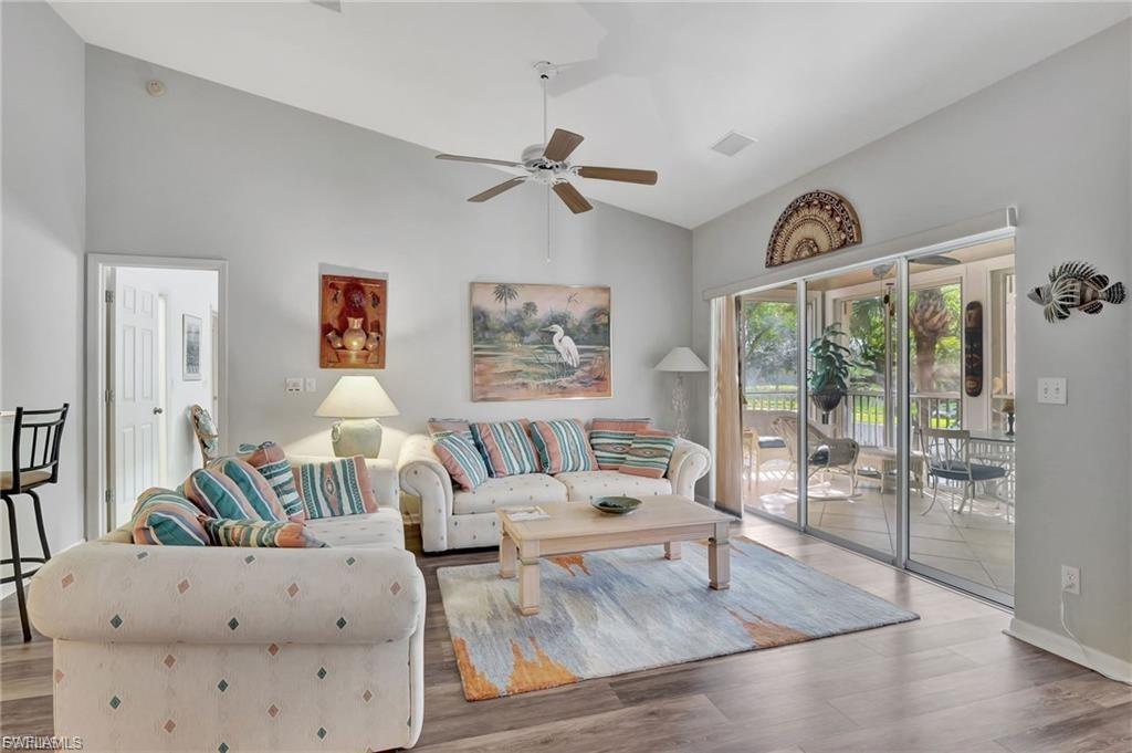 This unit has tons of updates and upgrades. Most furniture can be included if buyer chooses. Wonderful spacious residence with serene coastal decor that creates a calm retreat with sparkling lake views. There are 2 screened lanais allowing coastal breezes to flow through. The beautiful luxury vinyl wood plank flooring has warm tones. The new kitchen has white shaker cabinetry, quartz counters, stainless steel appliances and a tray ceiling with accent lighting and crown molding. This modern design has the popular open shelving concept and glass cabinetry. A large pantry closet has enough extra space for storing your small appliances too. The owner's suite has lovely lake views, large walk-in closet and vanity with dual sinks, quartz counters and a separate shower and soaking tub. The guest bedroom has ample closet space and a refreshed bathroom with new cabinetry and quartz counters. The main lanai has storm shutters and gorgeous lake views. The second lanai off the kitchen has colorful skies at sunset and has storm shutters too. It is an easy walk to the community pool and hot tub. Chardonnay is nestled in the highly sought after neighborhood of the Vineyards. Close to a large variety of shopping, dining, Naples' white sandy beaches, medical facilities and I-75 for traveling. This one checks all the boxes.